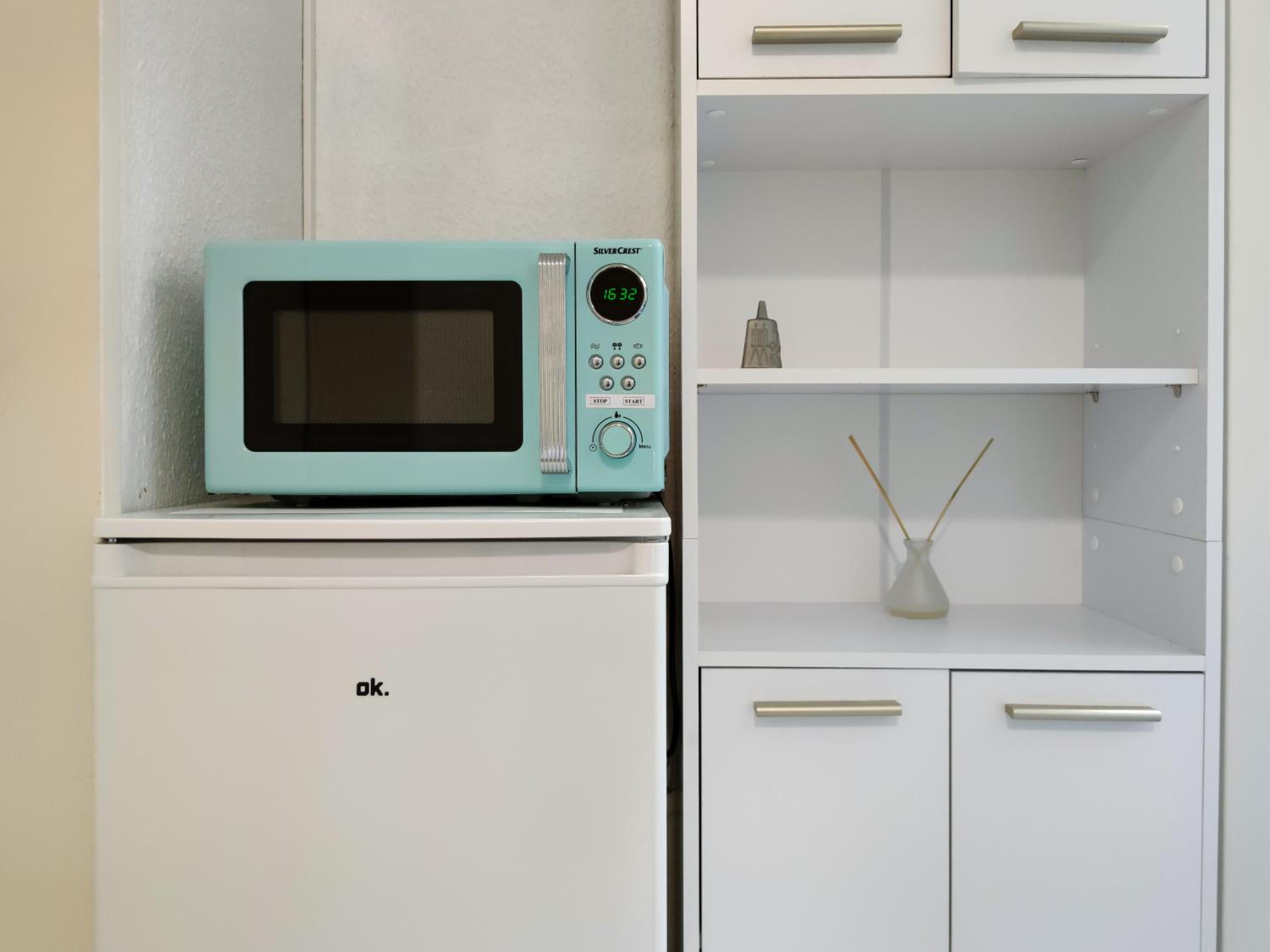 Es ist ein kleines, privates Hotel… mit asiatischem Komfort auf dem Flur: Mikrowelle und Wasserkocher für jeden zugänglich, Geschirr und Besteck.