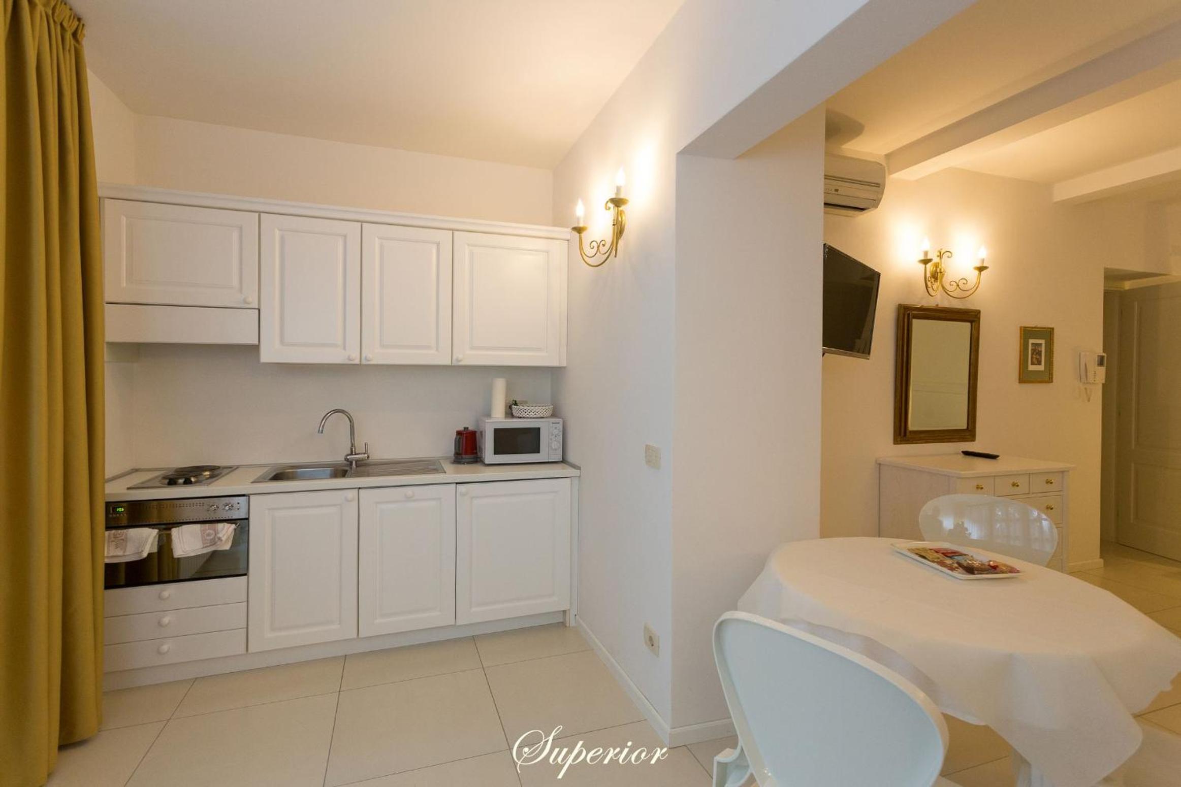 The apartments at Villa Mainard boast wooden furniture, light hues, and are equipped with modern amenities. Each apartment is air-conditioned, featuring an LCD satellite TV, a cozy living/dining area with a sofa bed, and a fully equipped kitchen for convenience.