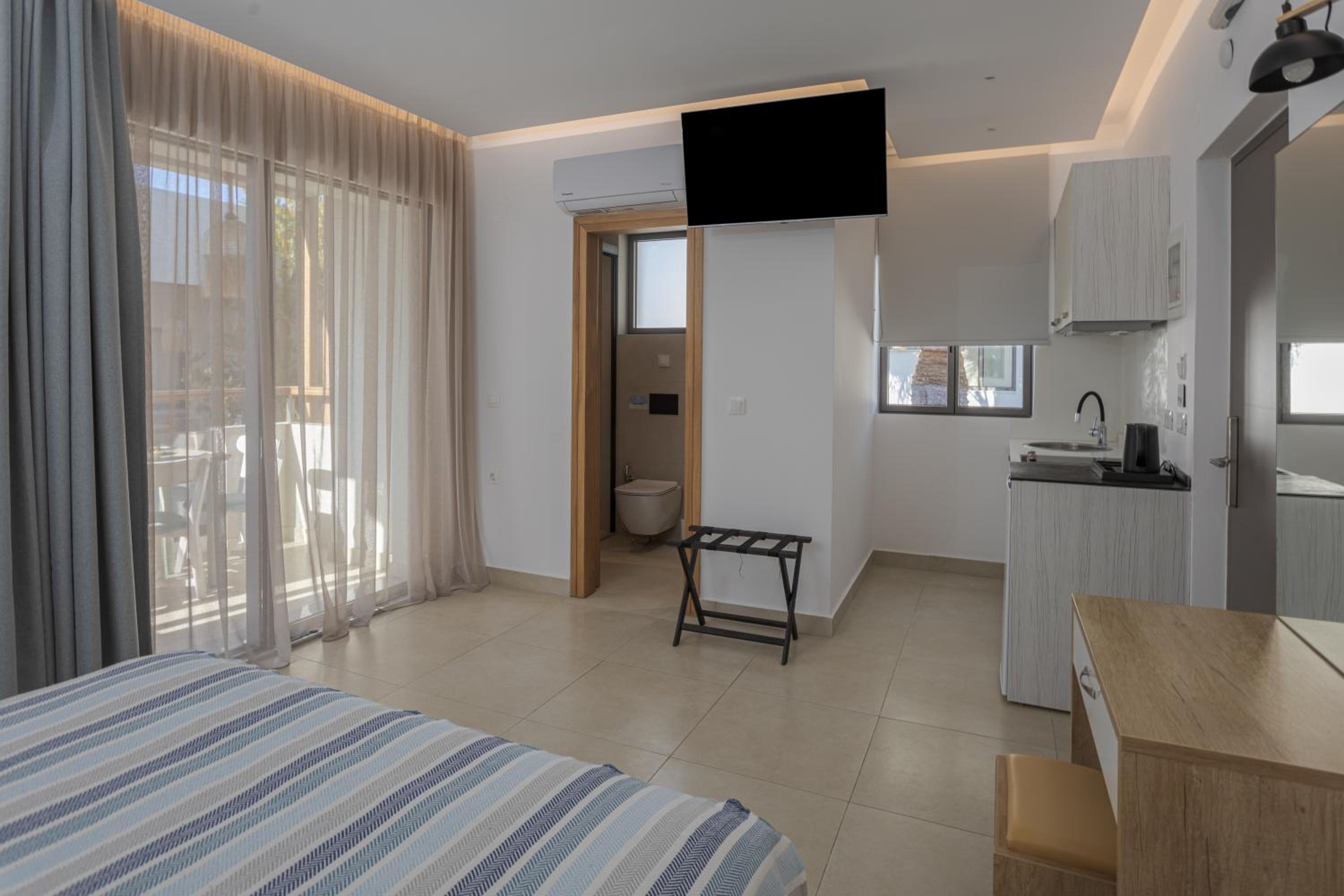 Galazio Beach Resort by Estia offers a beachfront escape with modern air-conditioned units featuring kitchenettes and private bathrooms. Enjoy the infinity pool, fitness room, and garden, all with breathtaking sea or mountain views from your terrace or balcony.