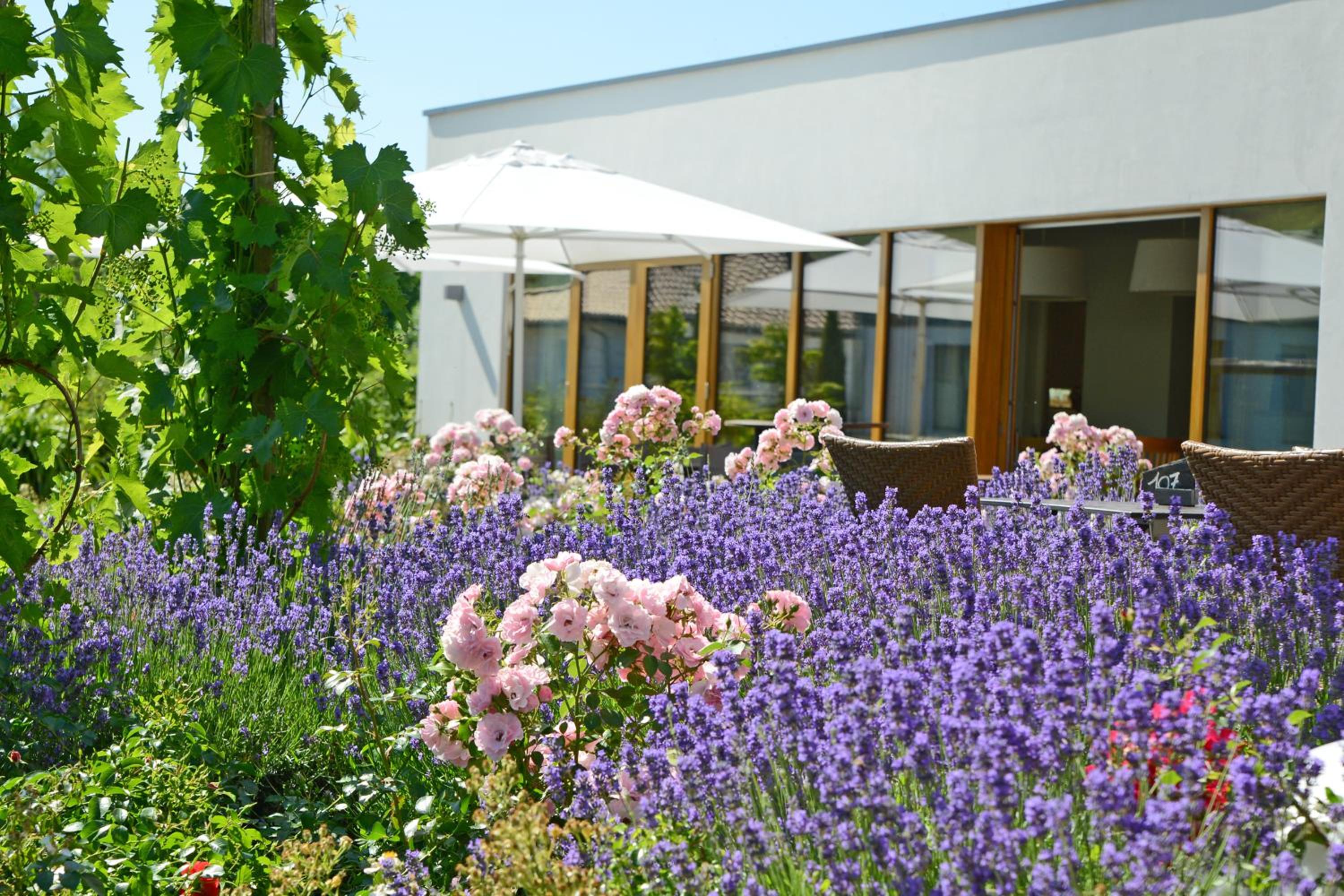 Indulge in the bright and modern rooms at WeinKulturgut Longen-Schlöder, featuring stylish decor and garden views from your own patio.