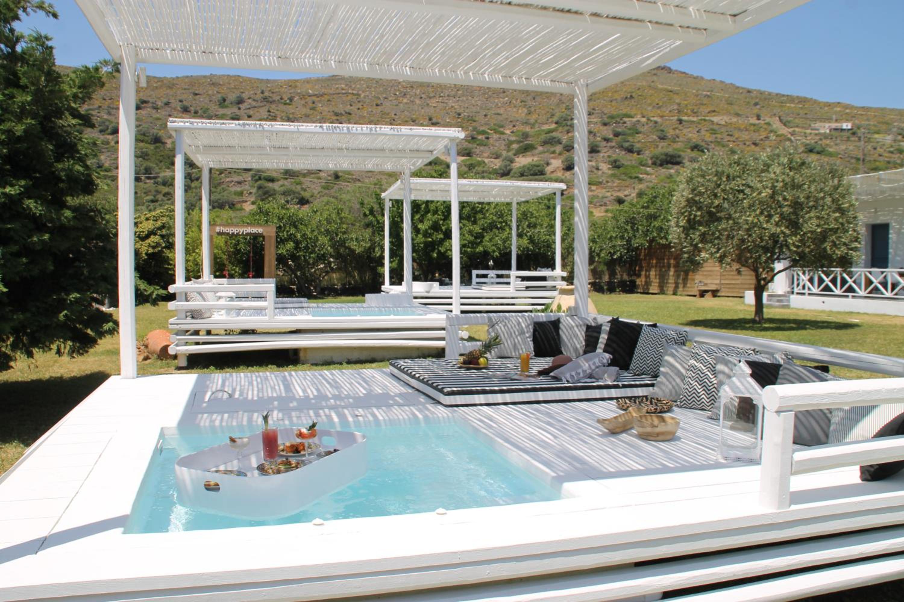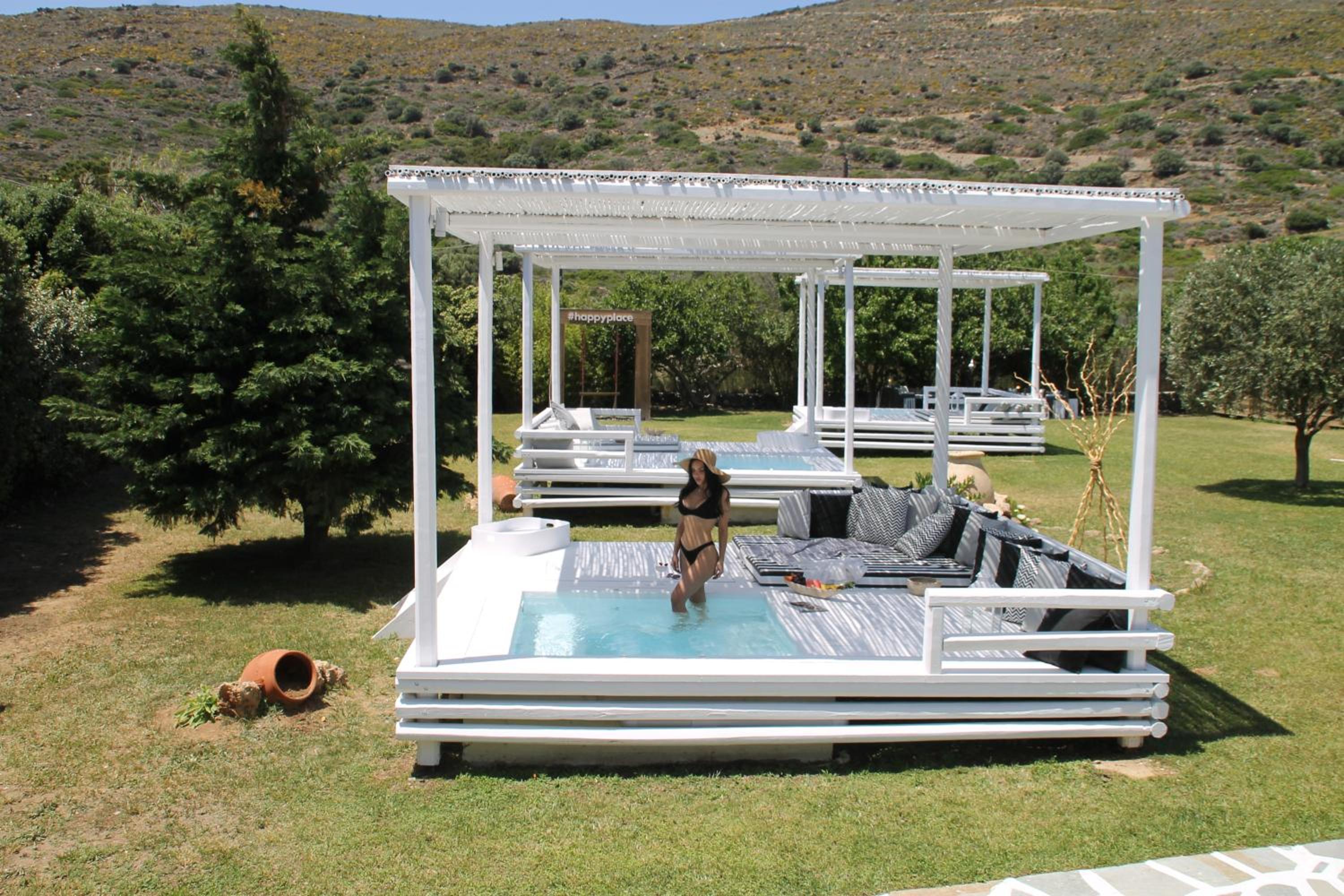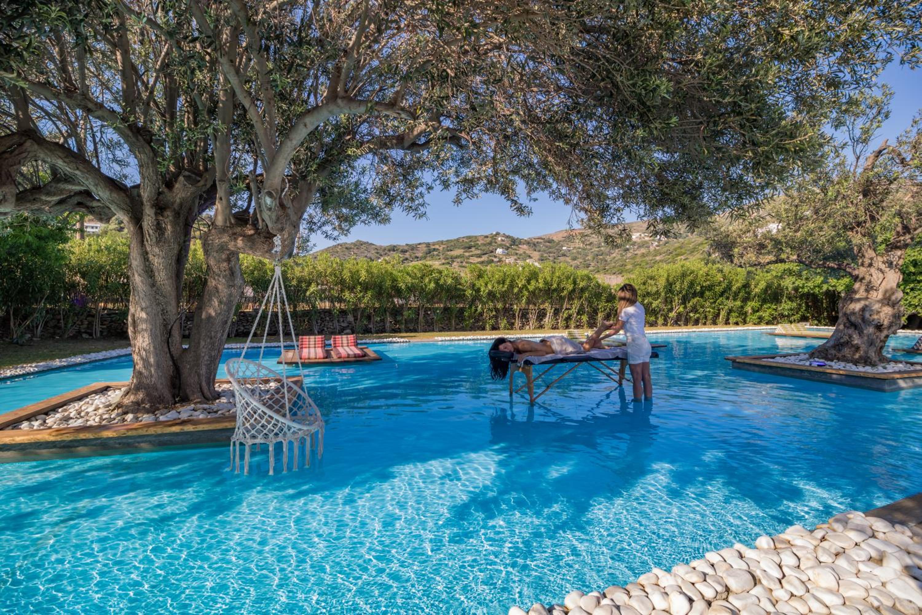 Indulge in the opulence of pool views, hot tub access, and elegant decor in each 5-star suite at Ow Andros Luxury Suites.