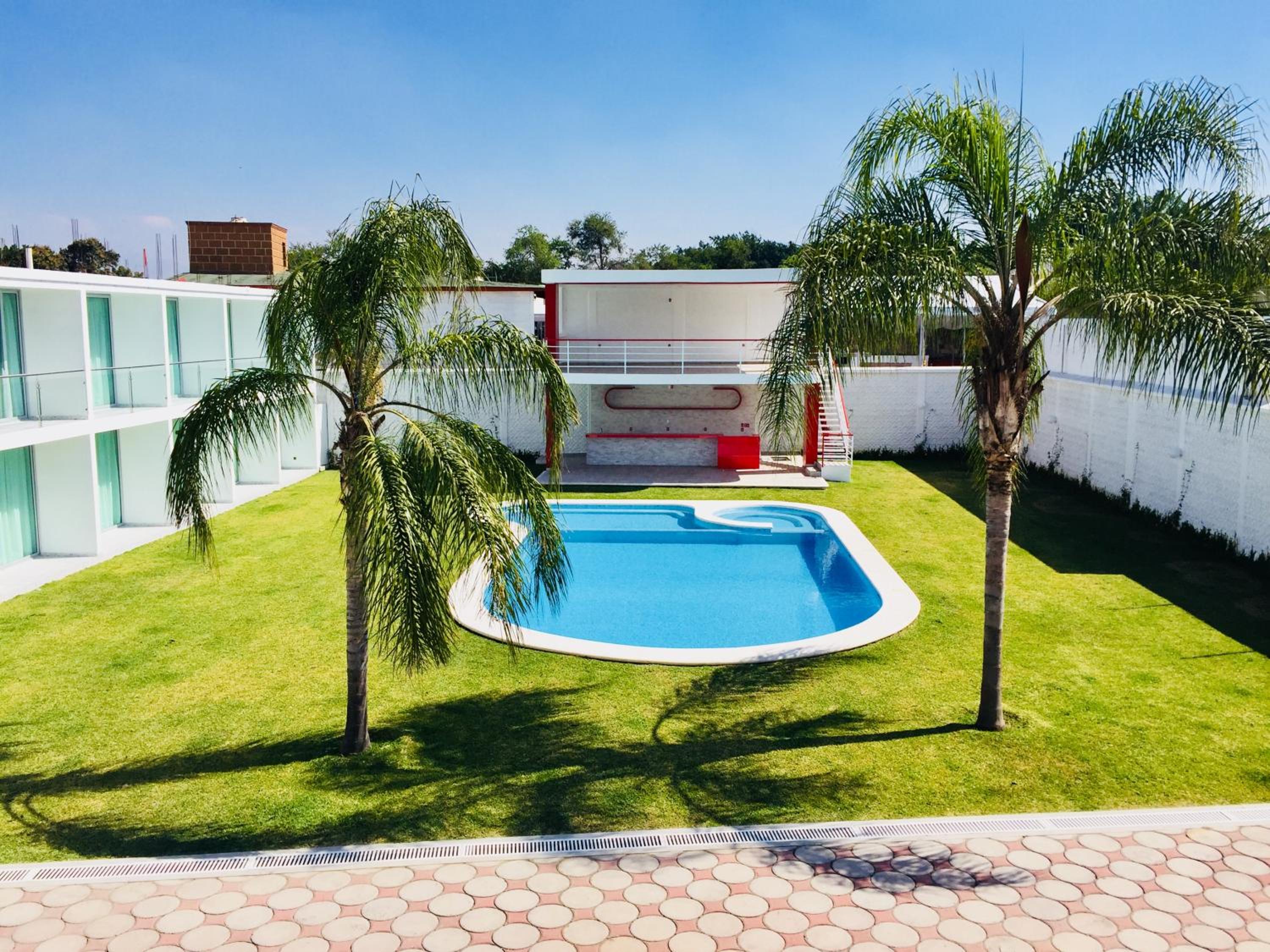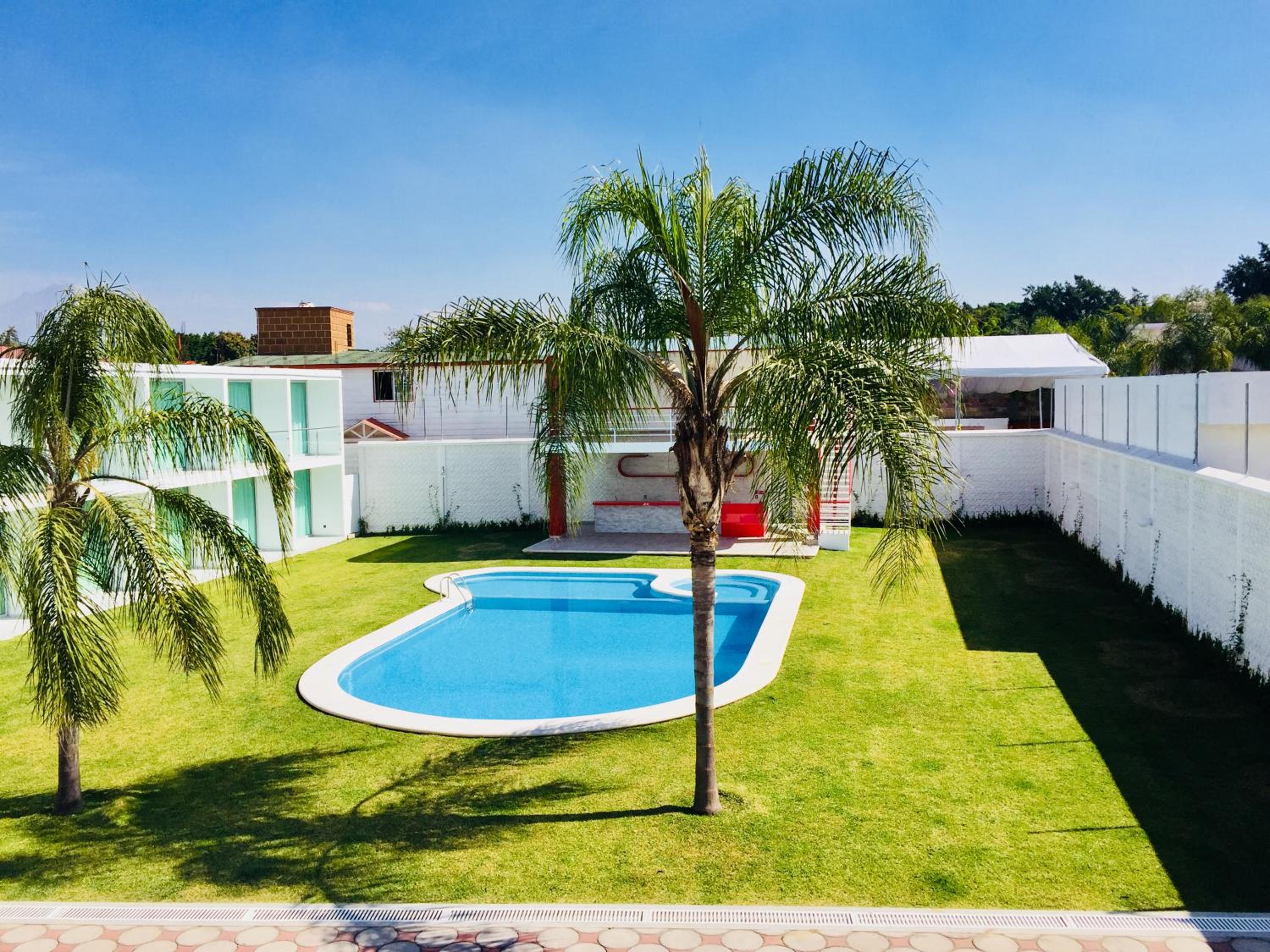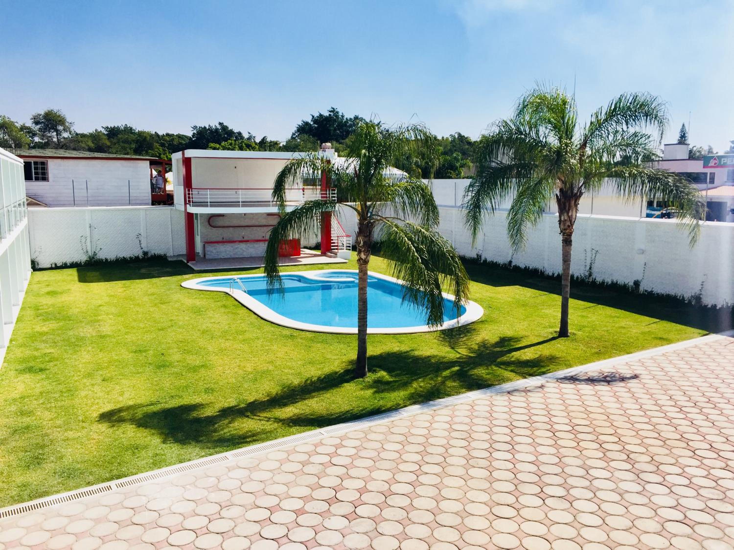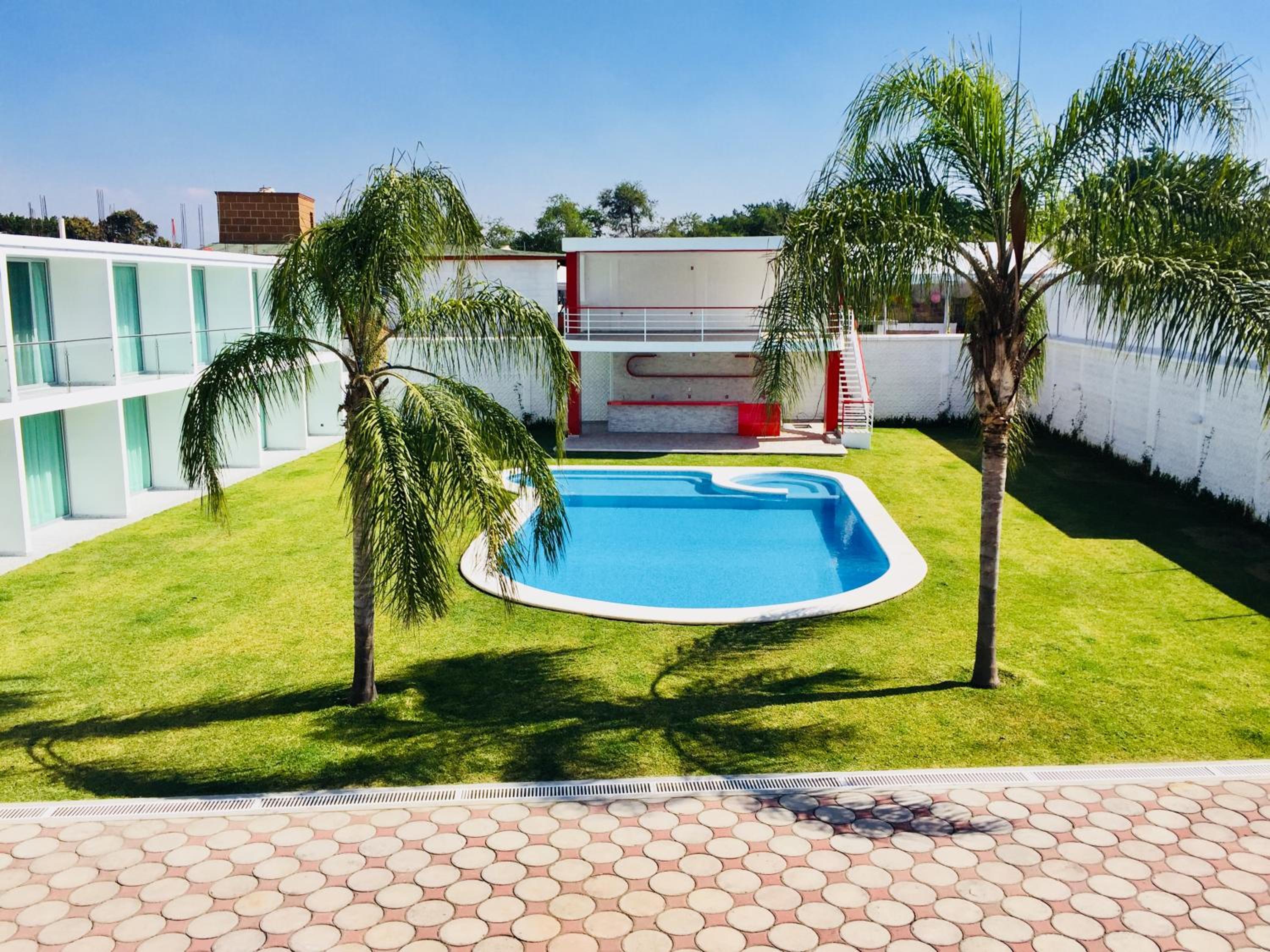 Hotel Palmas Cocoyoc offers a serene escape with its outdoor swimming pool surrounded by lush green gardens, providing a perfect spot to relax and unwind under the sun.