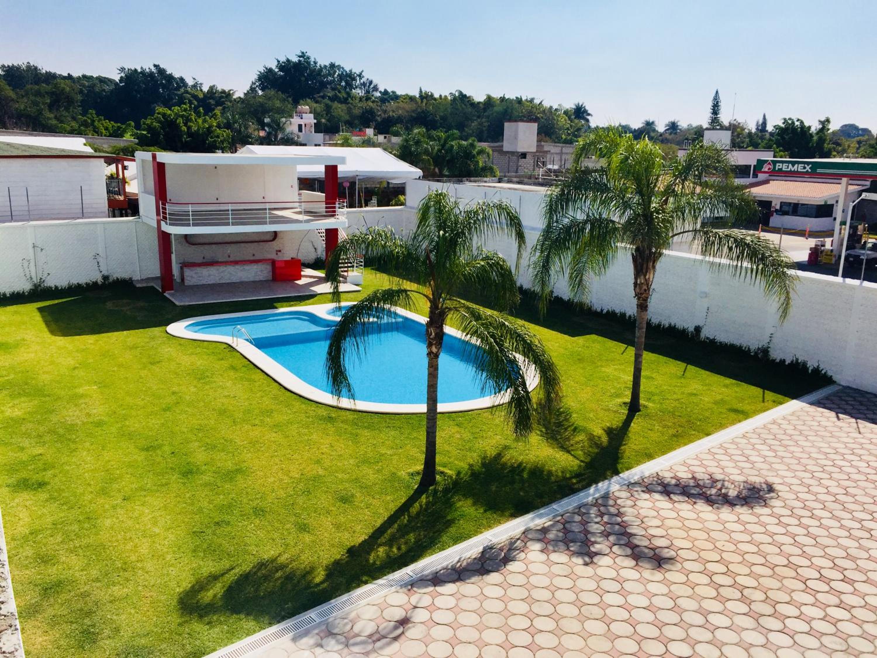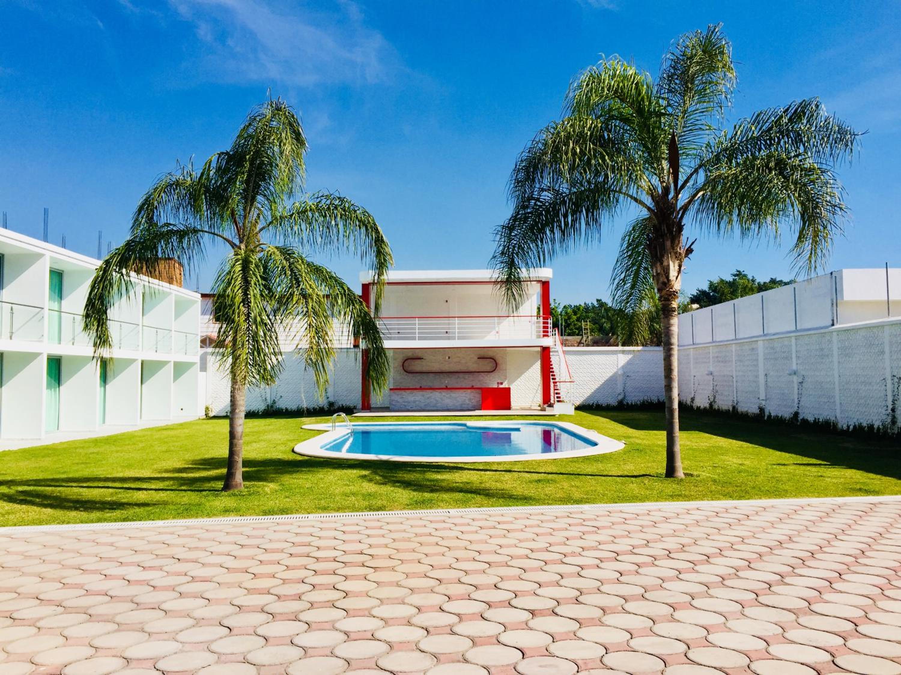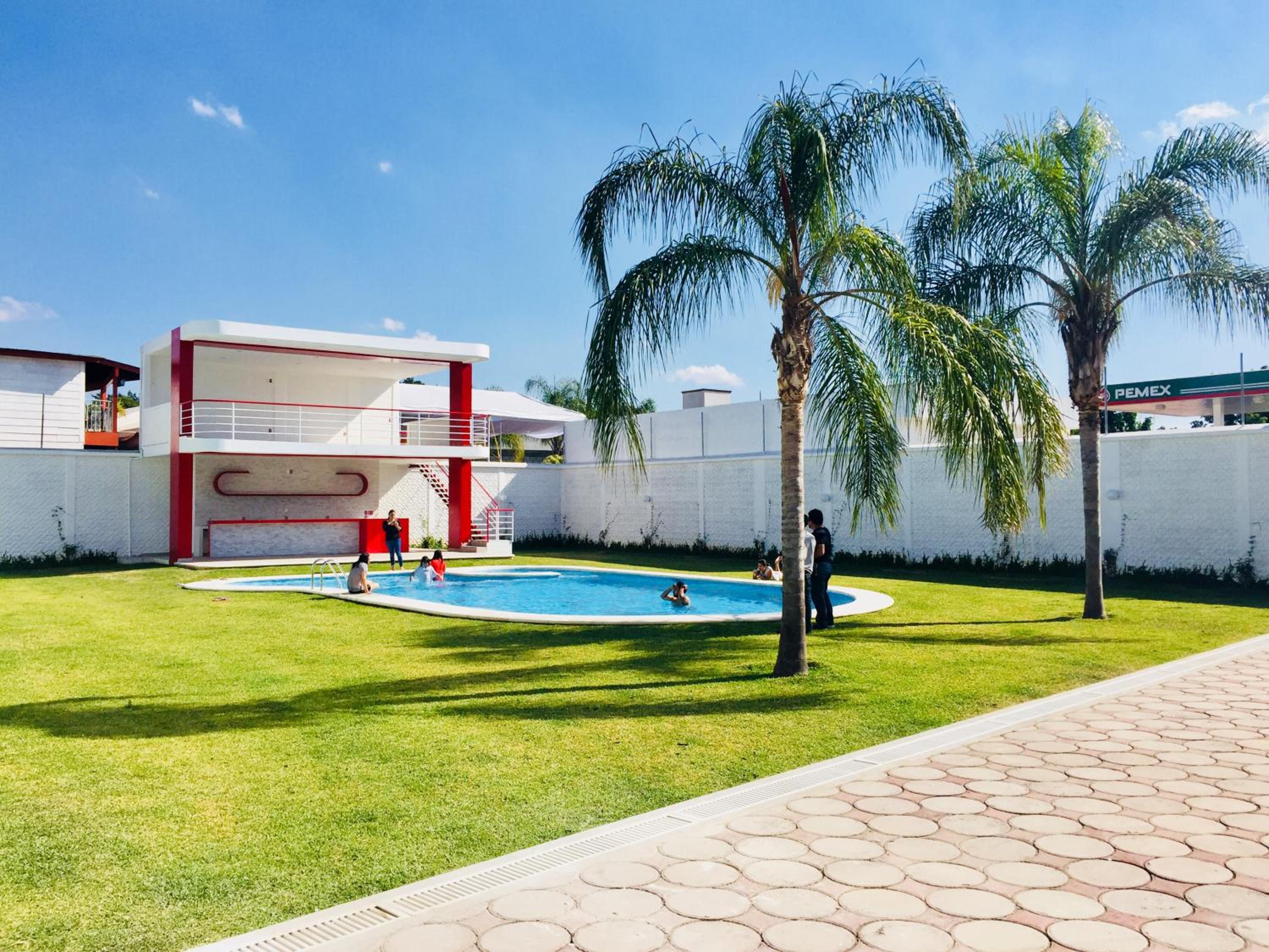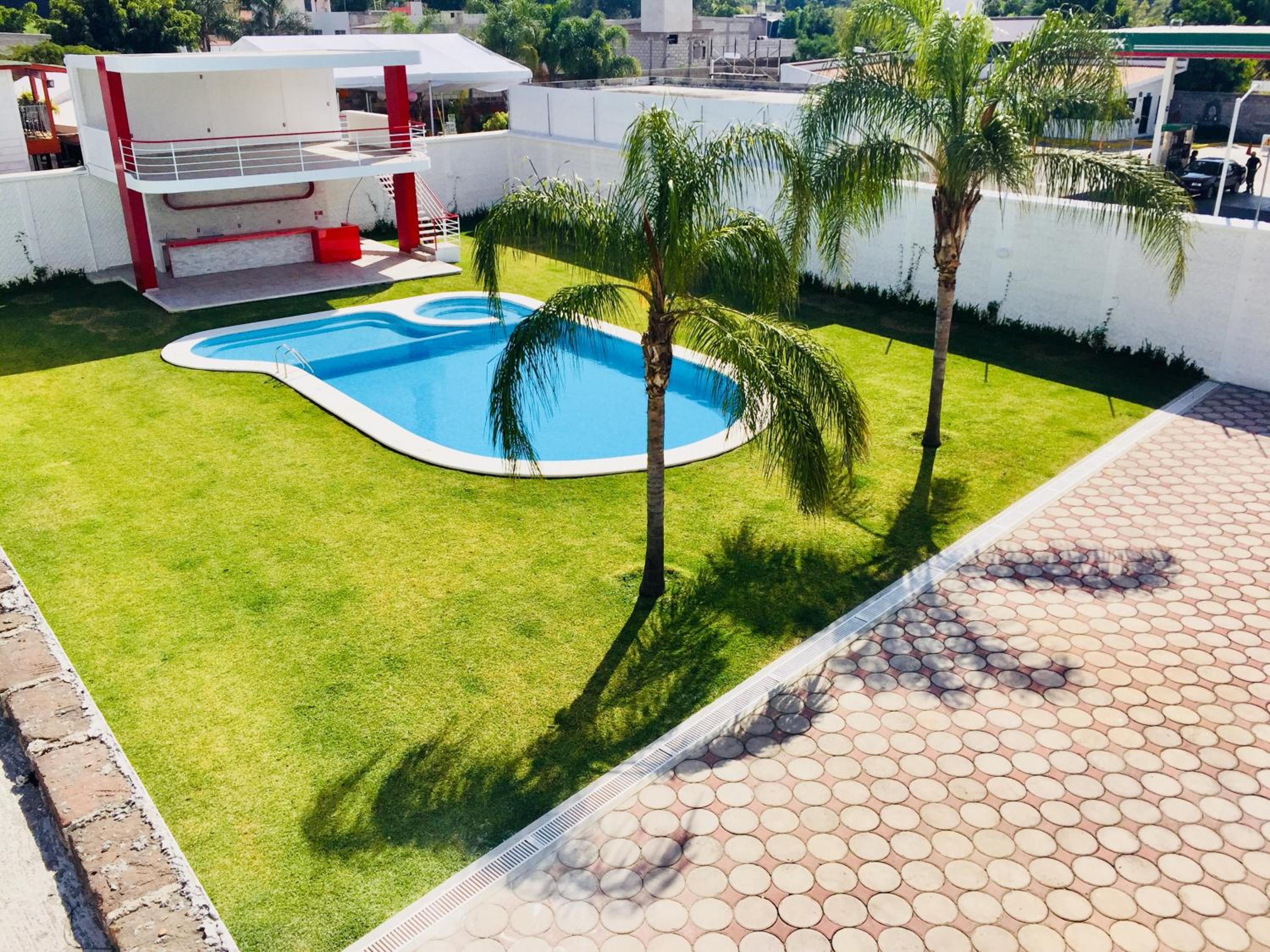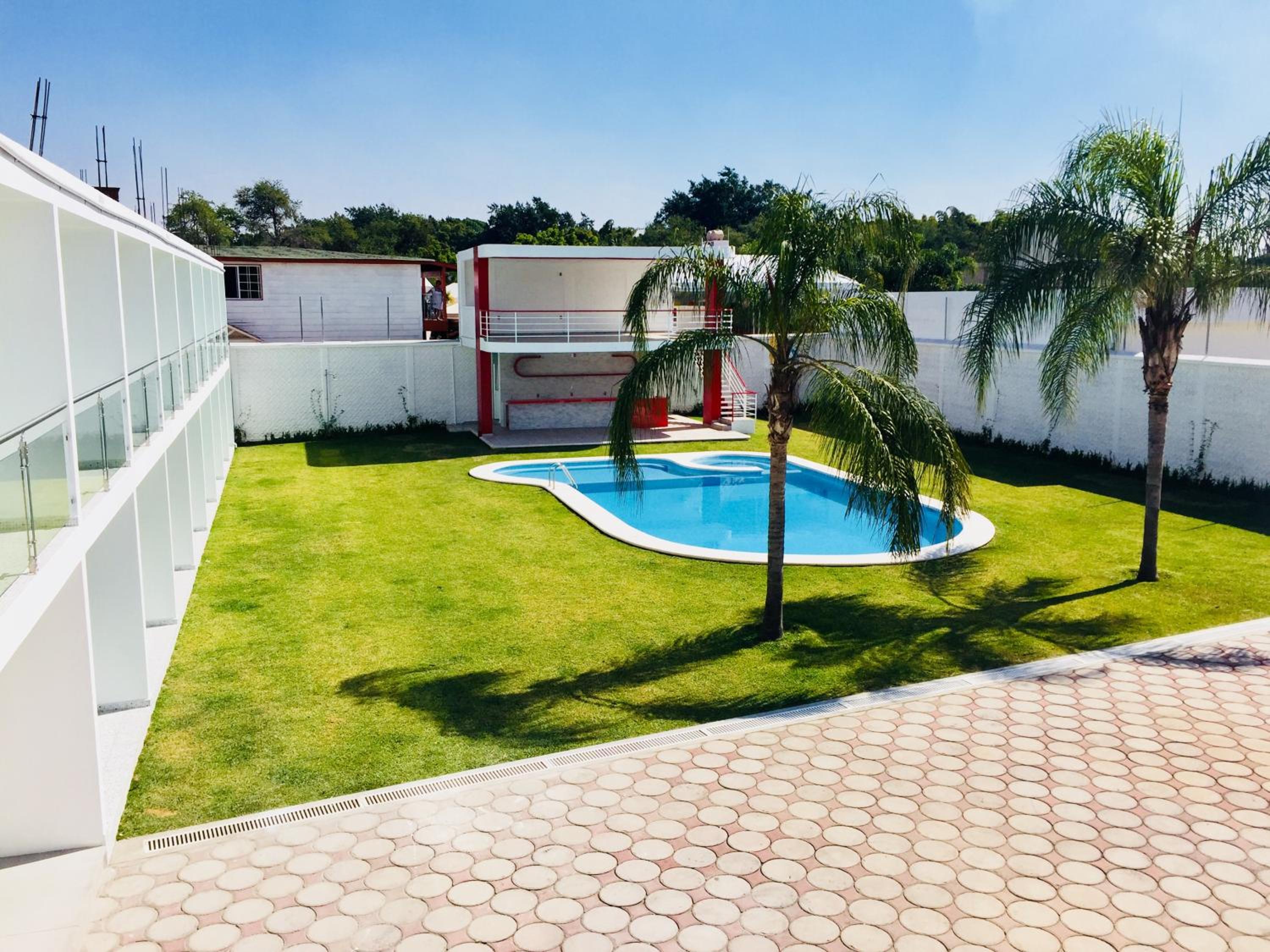 Hotel Palmas Cocoyoc offers a serene escape with its outdoor swimming pool surrounded by lush green gardens, providing a perfect spot to relax and unwind under the sun.