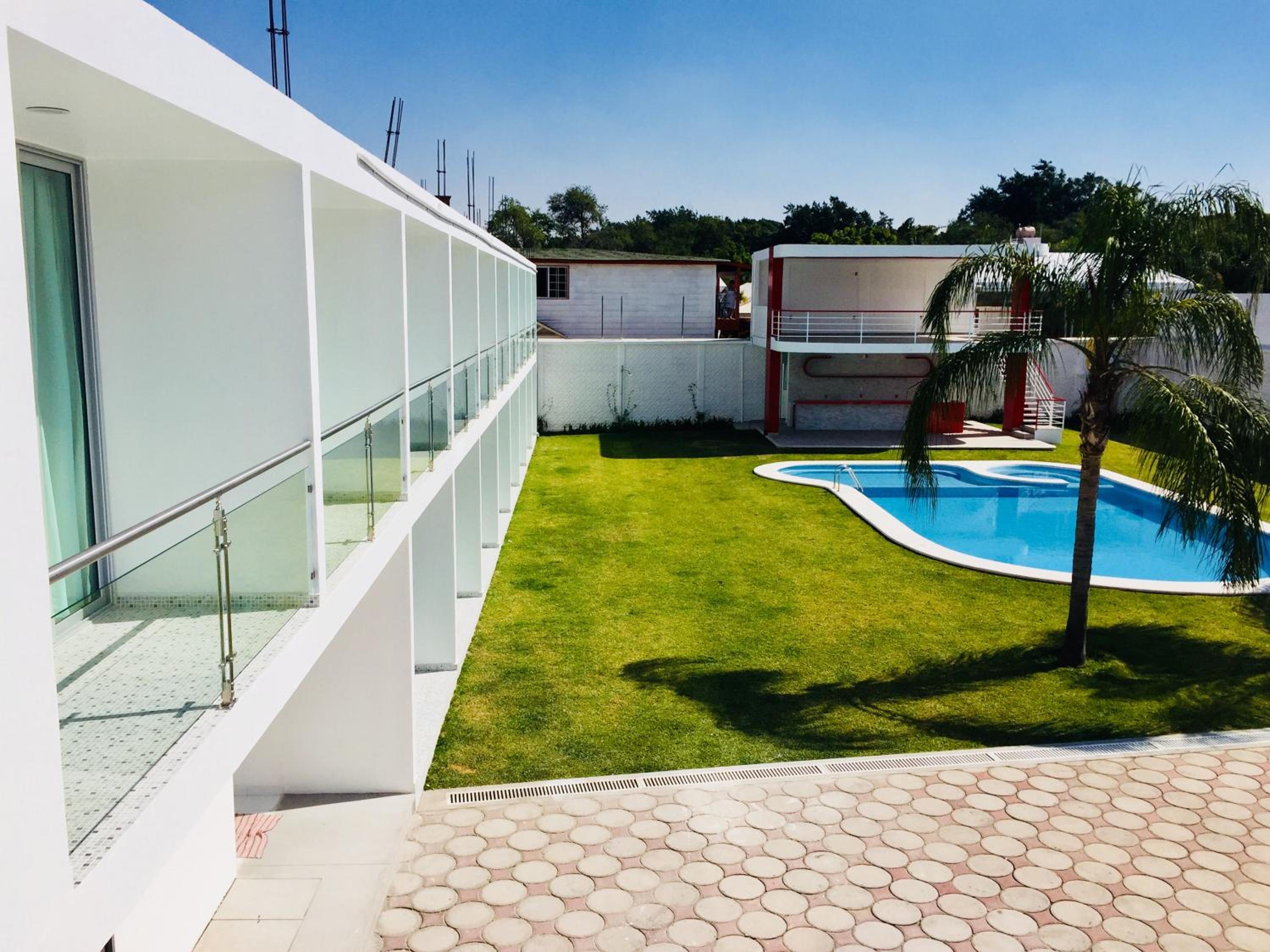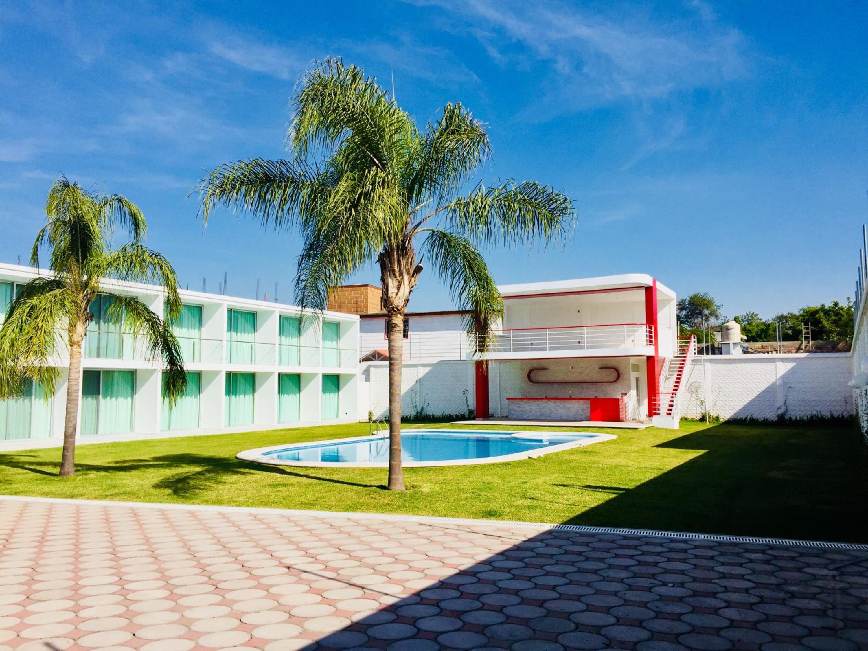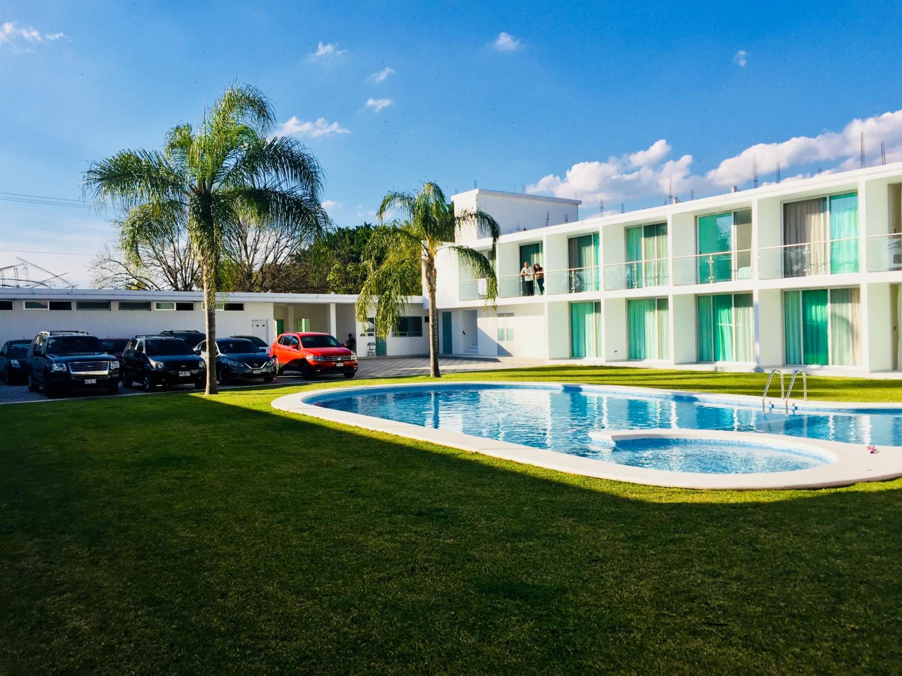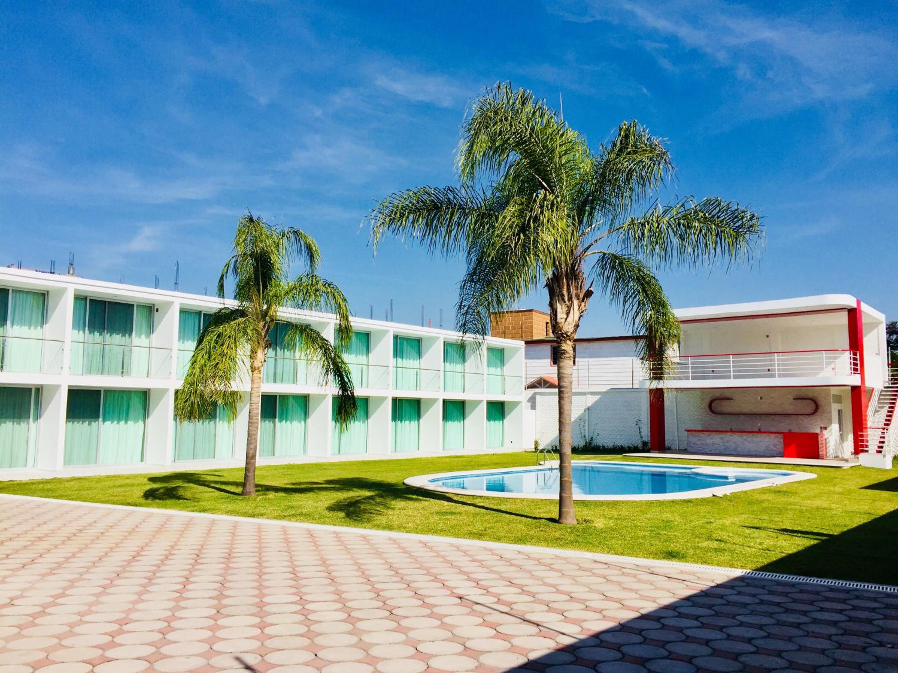 Hotel Palmas Cocoyoc offers a serene escape with its outdoor swimming pool surrounded by lush green gardens, providing a perfect spot to relax and unwind under the sun.