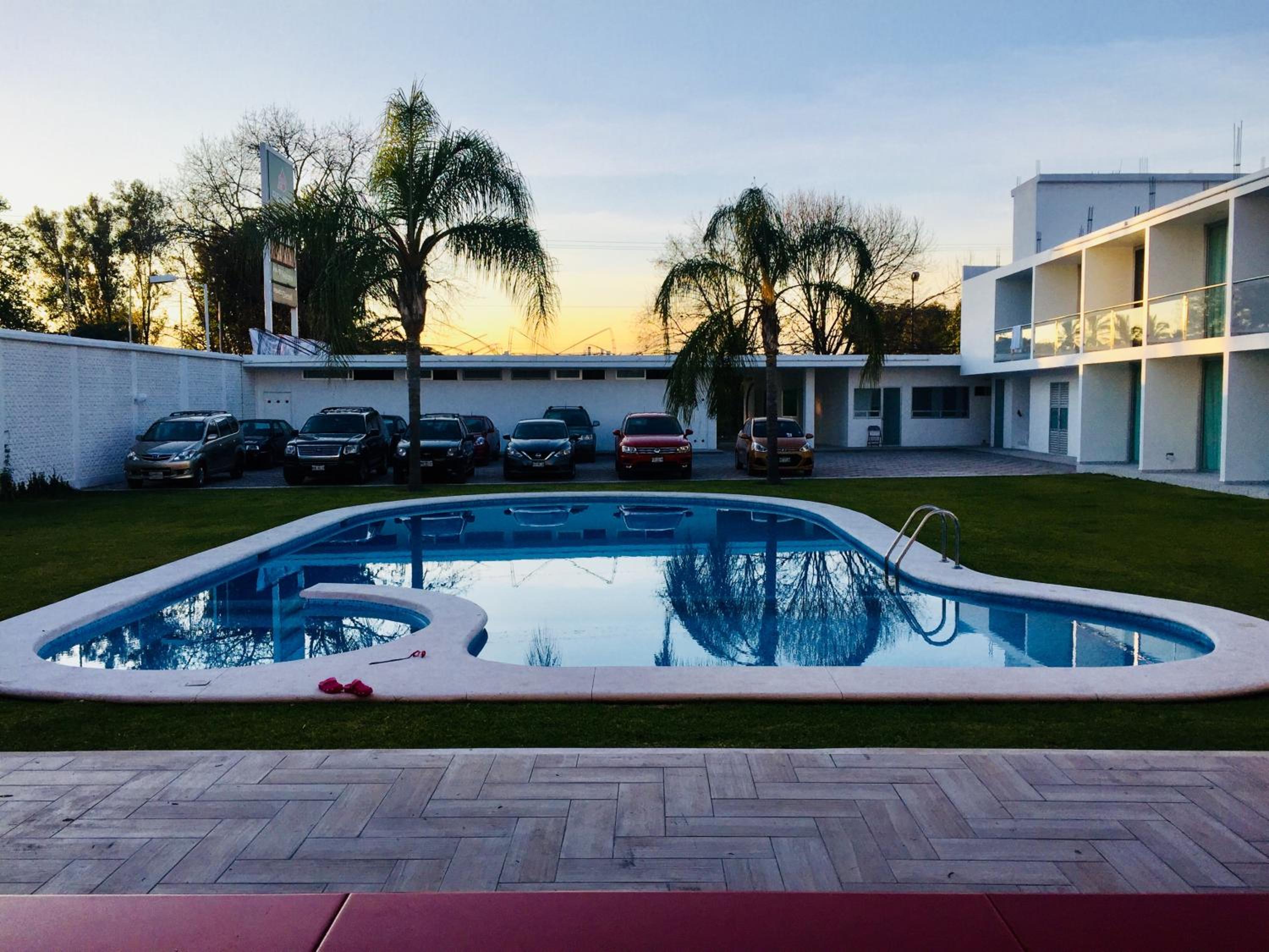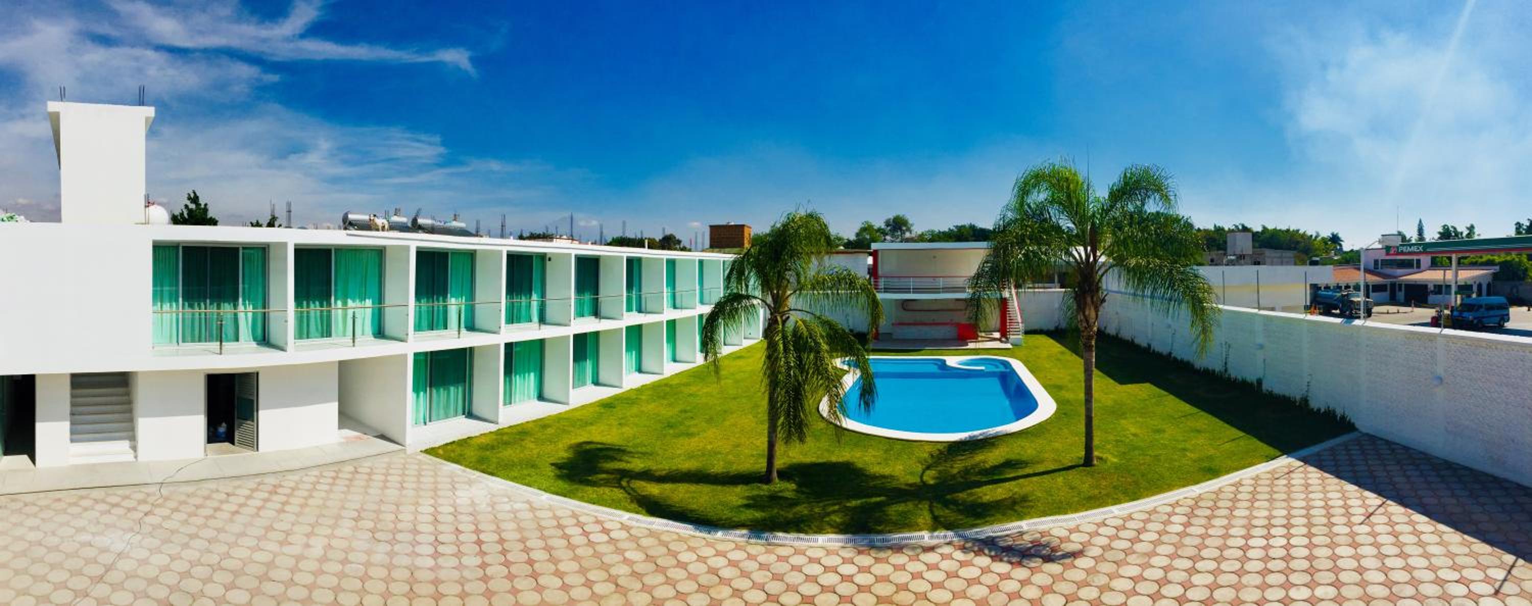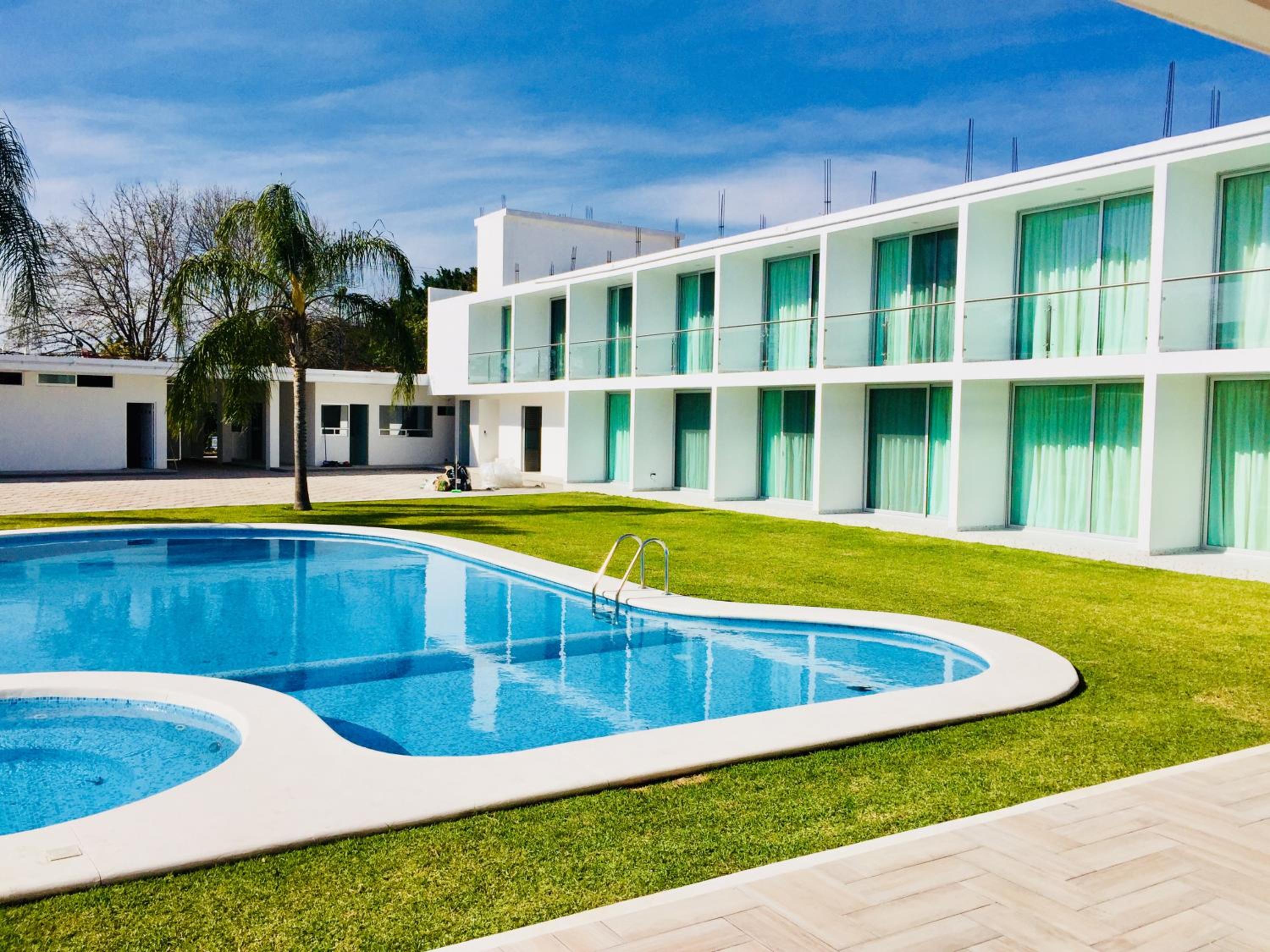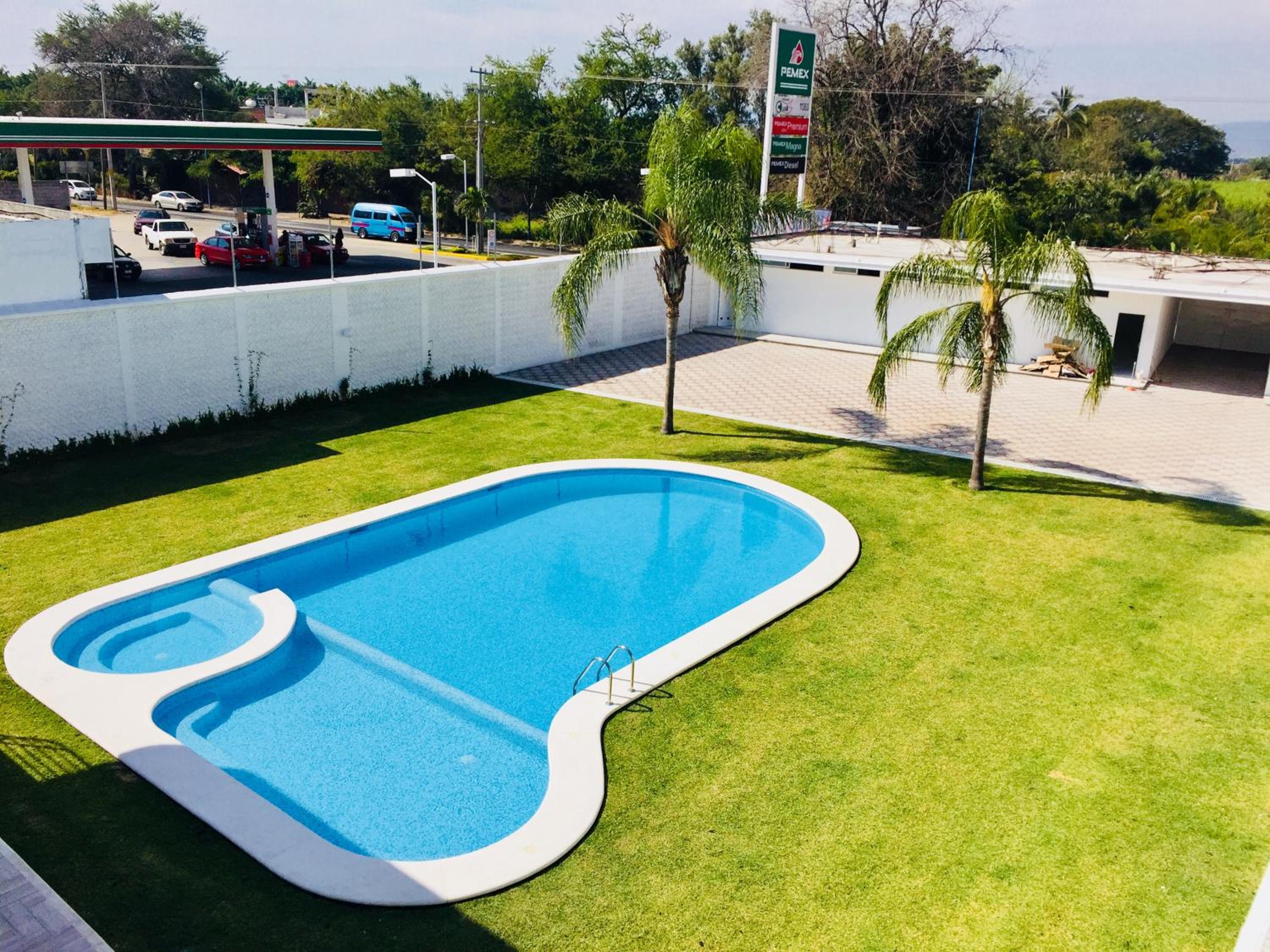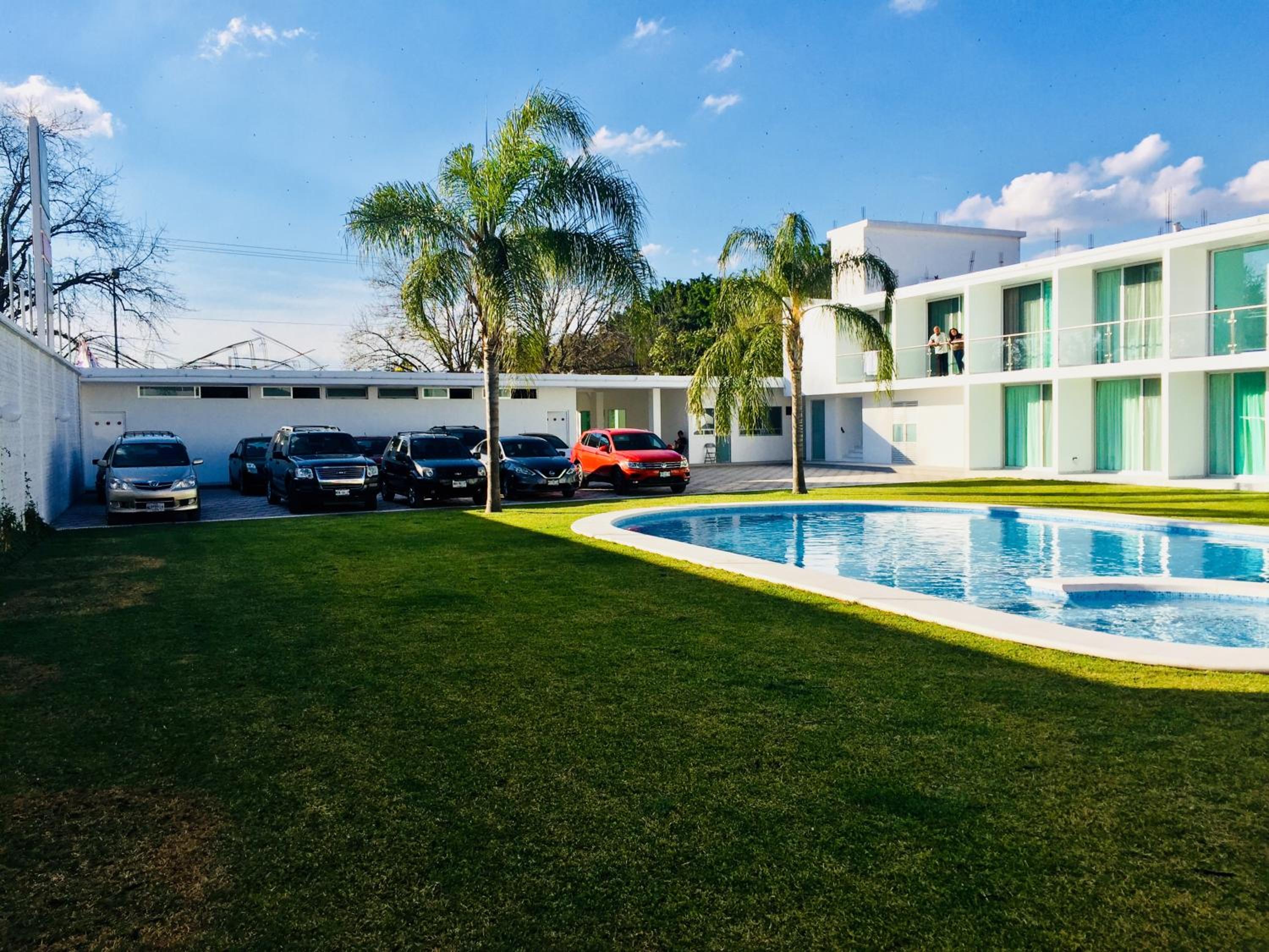 Hotel Palmas Cocoyoc offers a serene escape with its outdoor swimming pool surrounded by lush green gardens, providing a perfect spot to relax and unwind under the sun.