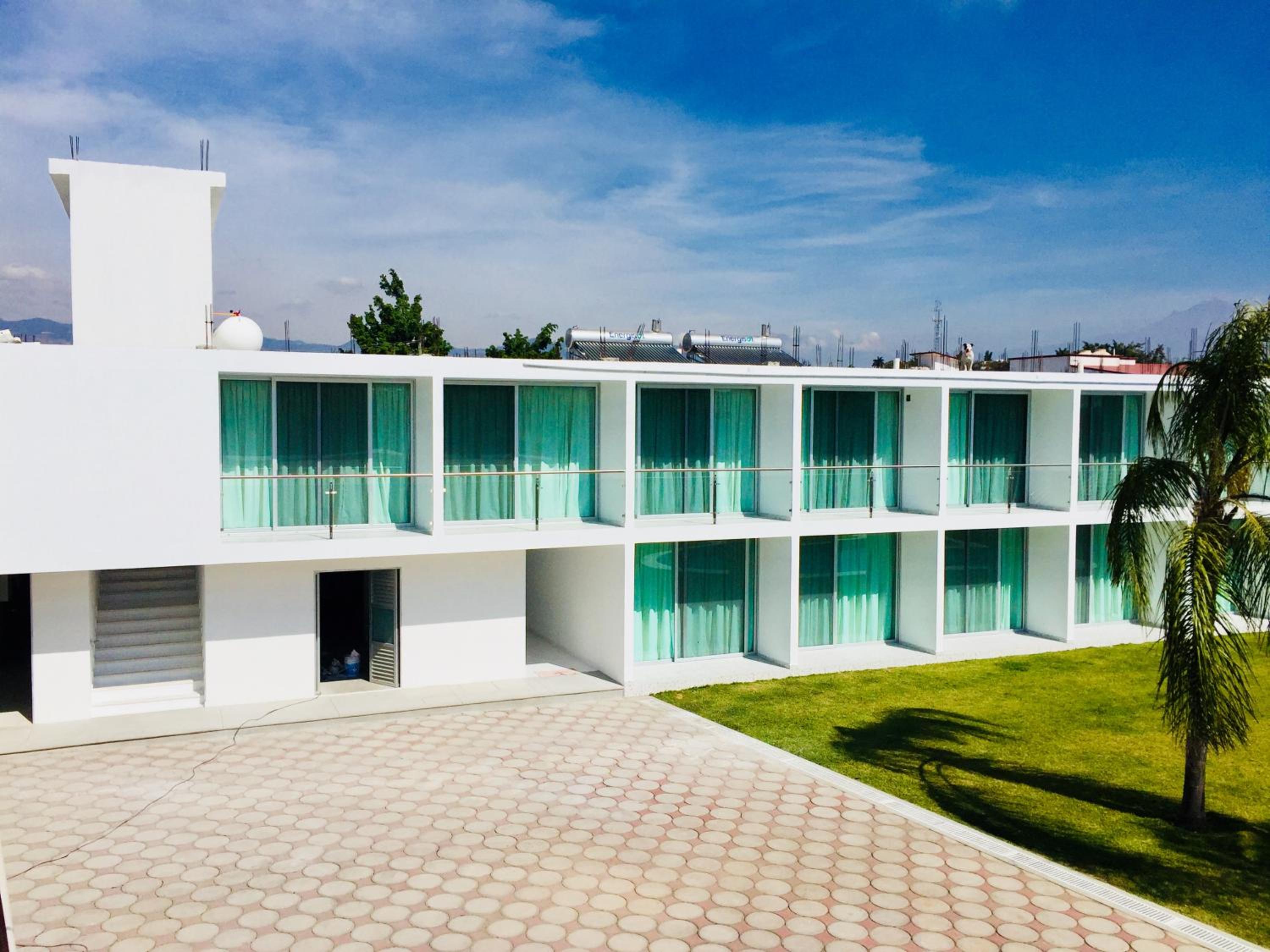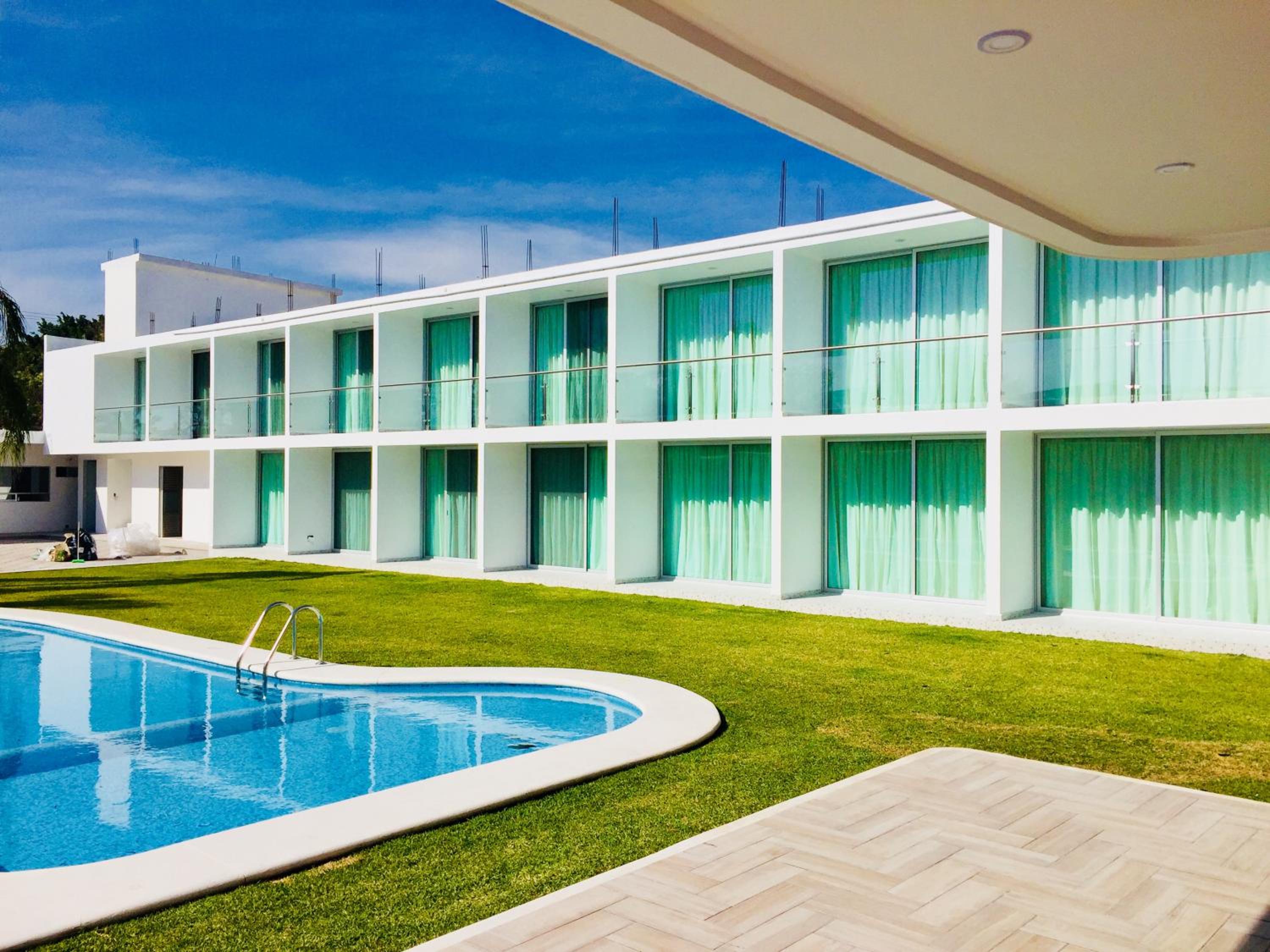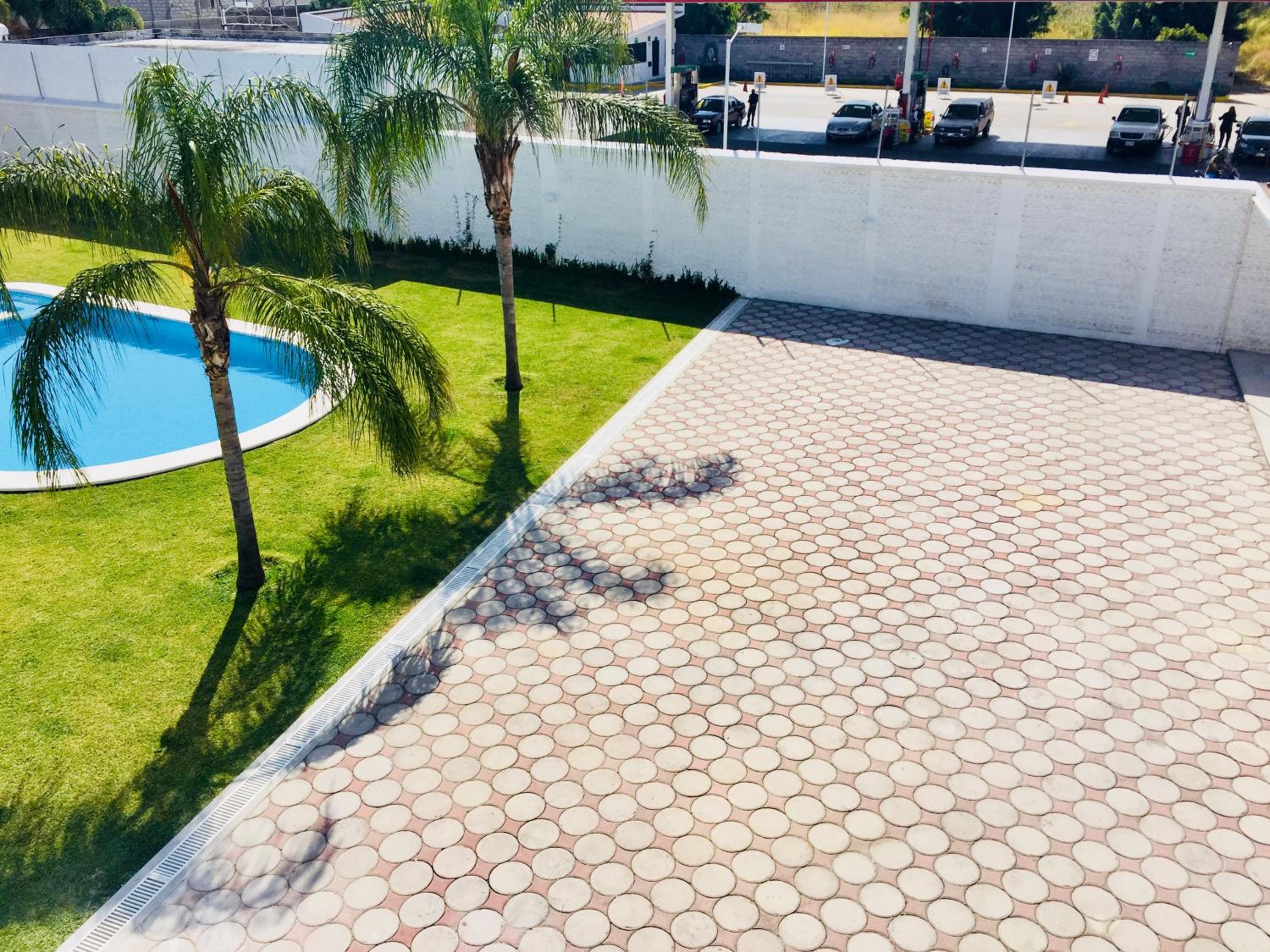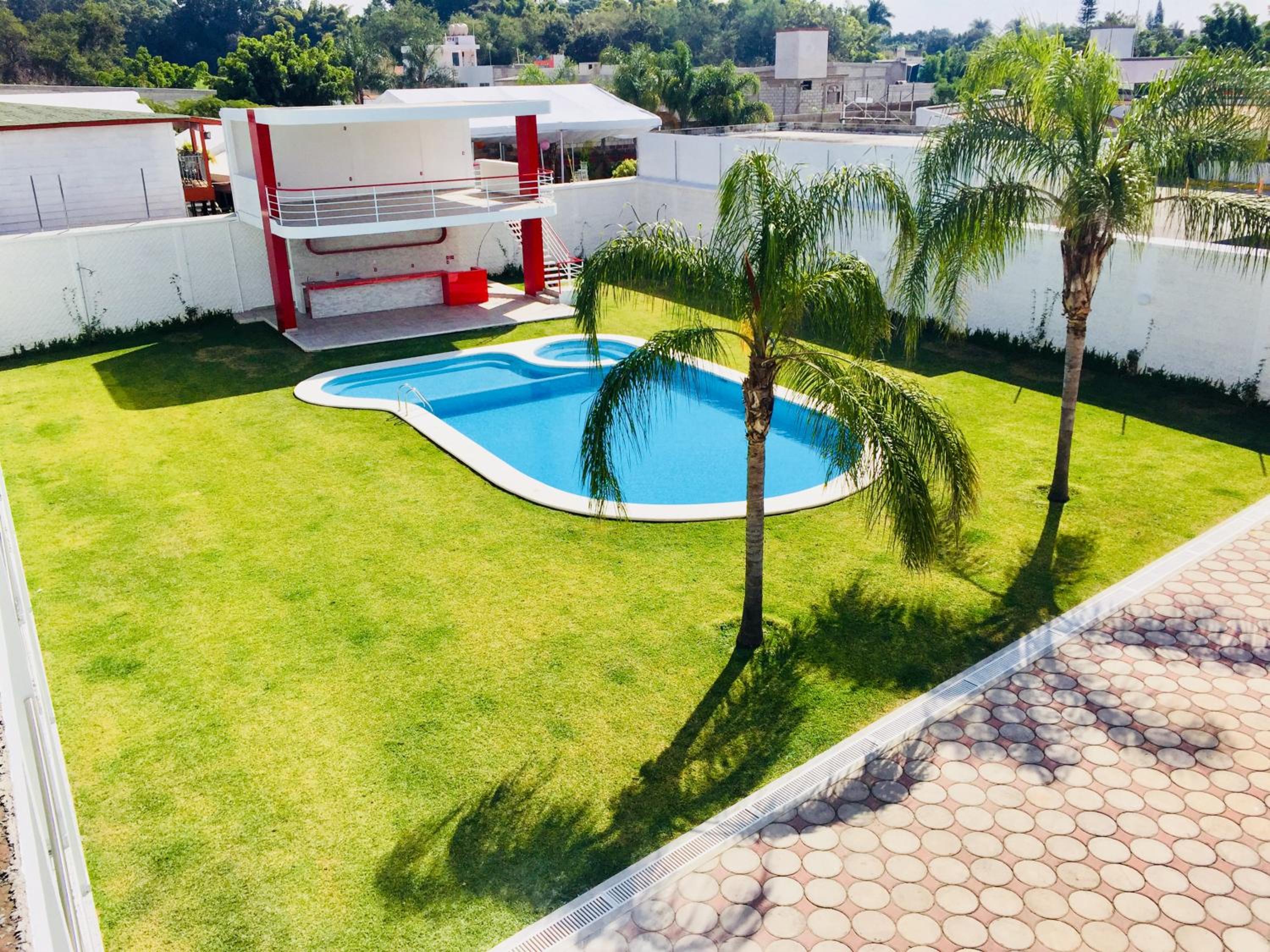 Hotel Palmas Cocoyoc offers a serene escape with its outdoor swimming pool surrounded by lush green gardens, providing a perfect spot to relax and unwind under the sun.
