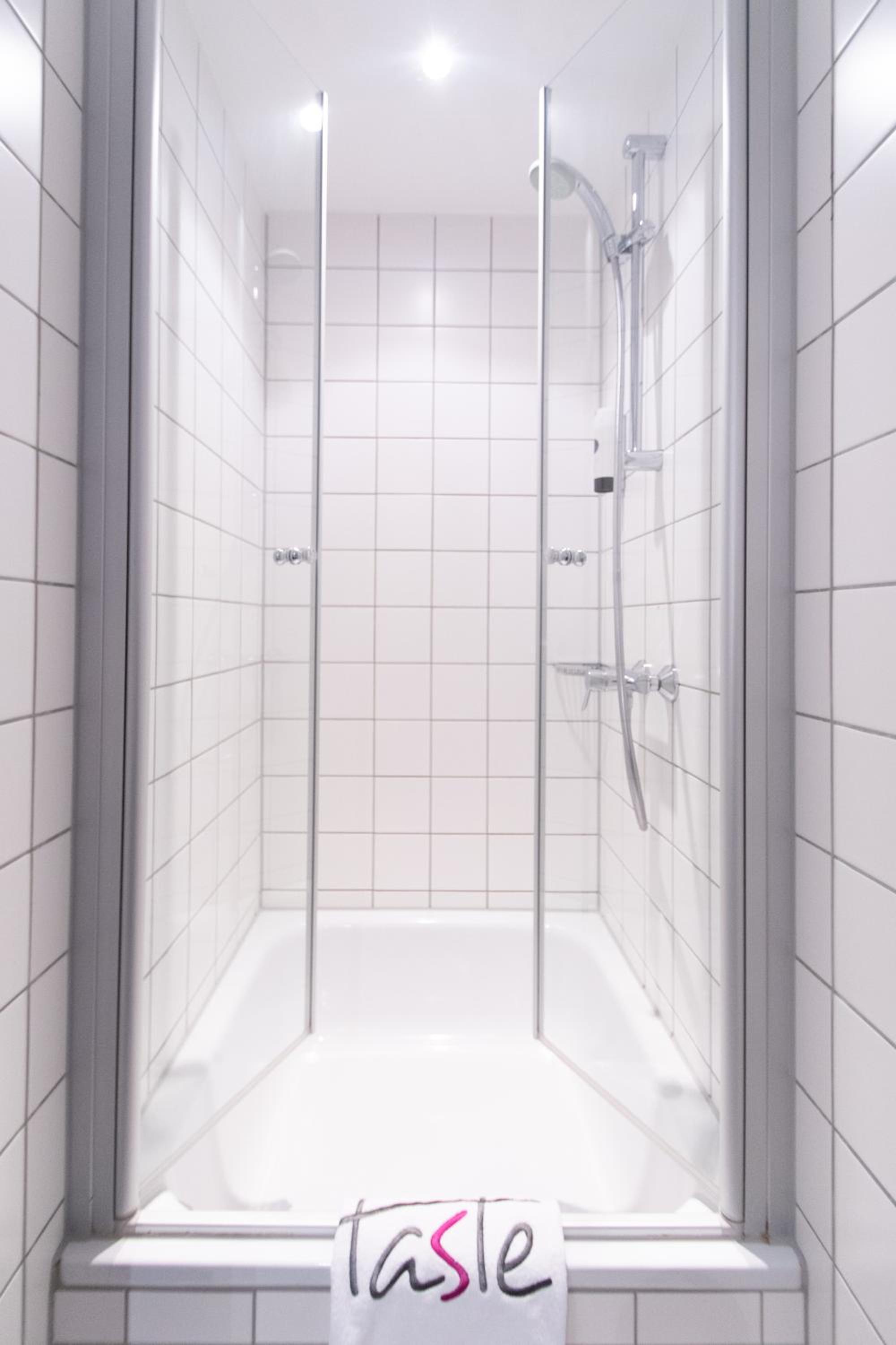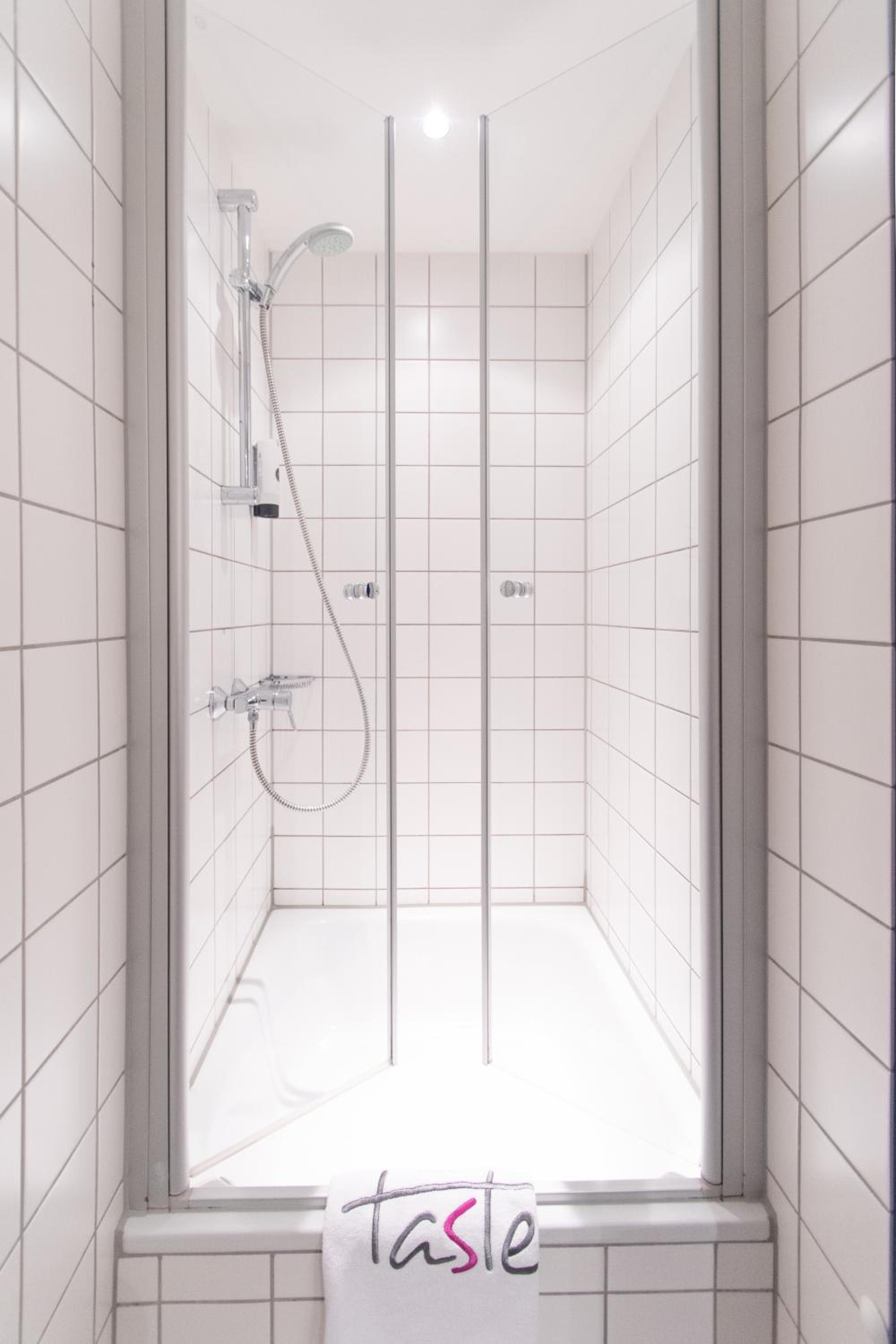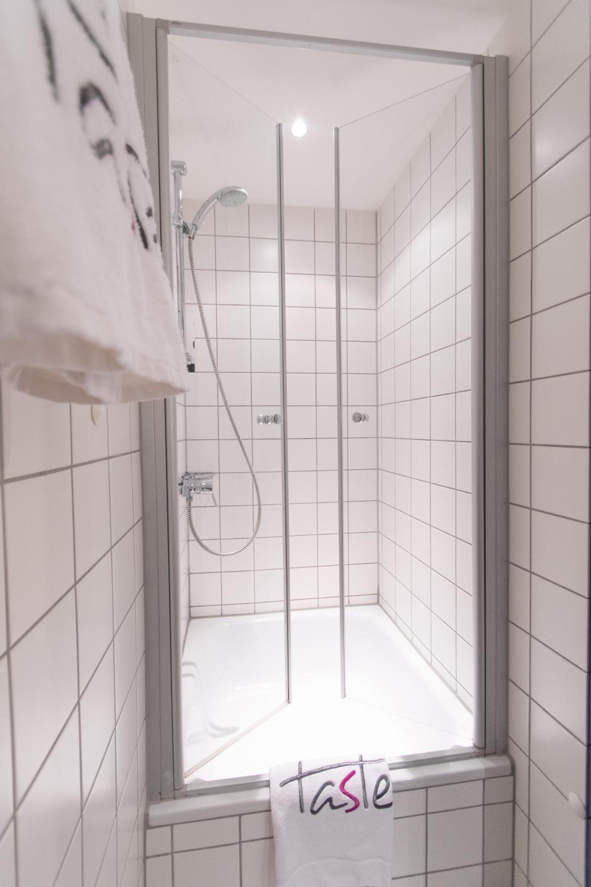 Bei der Dusche fehlte eine Türhälfte. Man musste beim Duschen aufpassen, dass man nicht den Raum unter Wasser setzte.