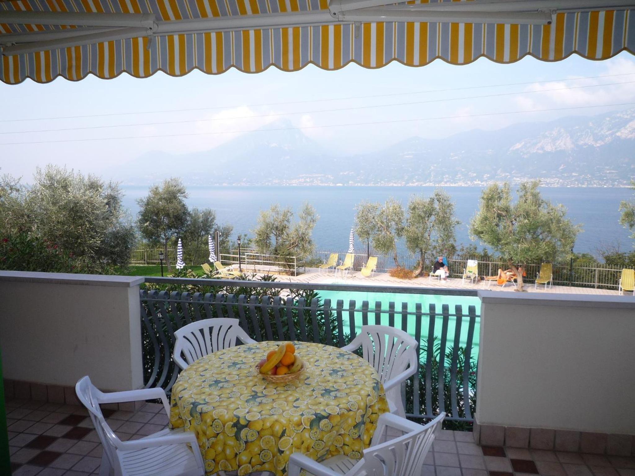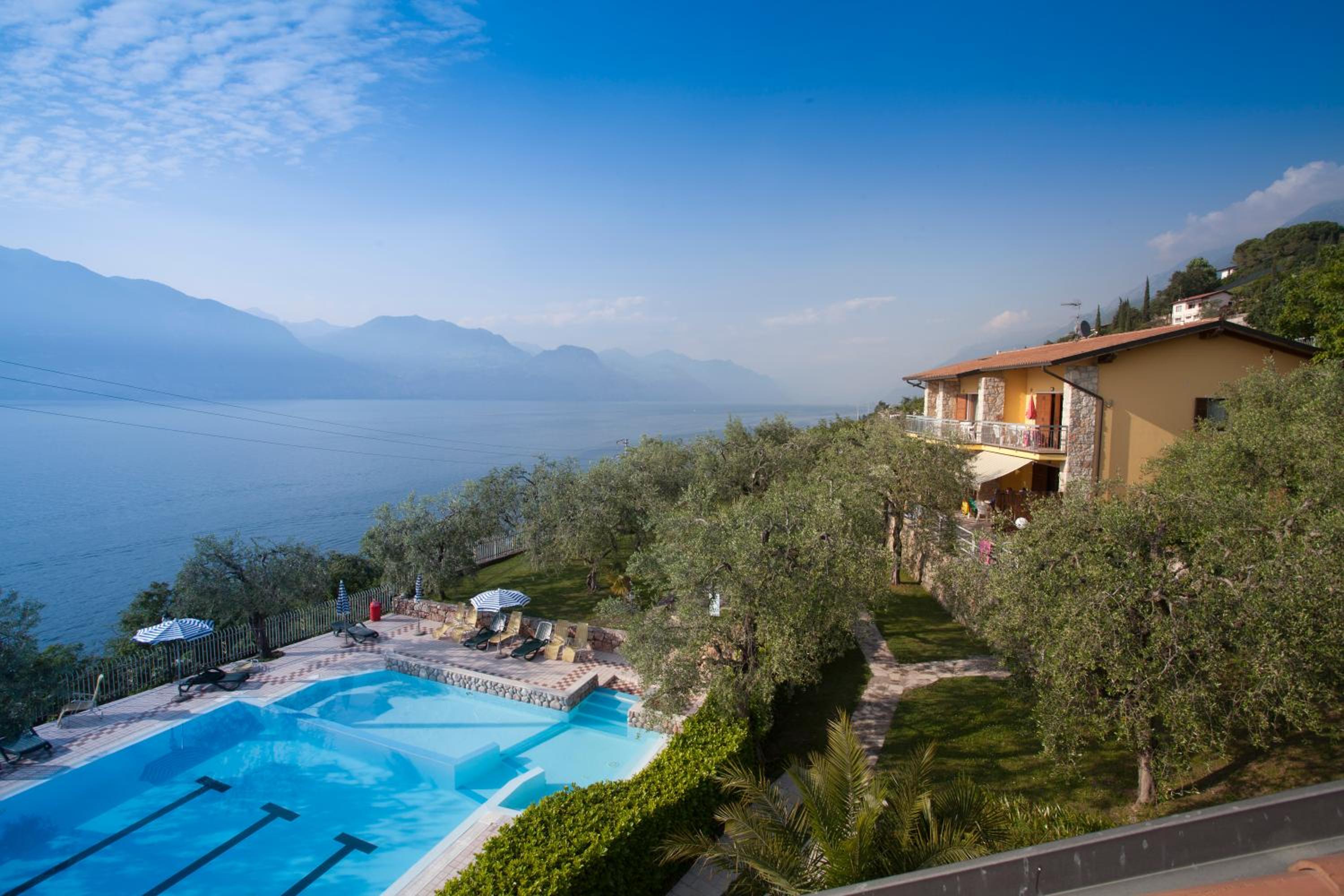 Die Lage direkt am See, der Blick vom Balkon über den See, der Strand und Zugang zum See direkt vorm Haus, der große, oben liegende Pool mit Liegen unter Olivenbäumen und toller Aussicht.