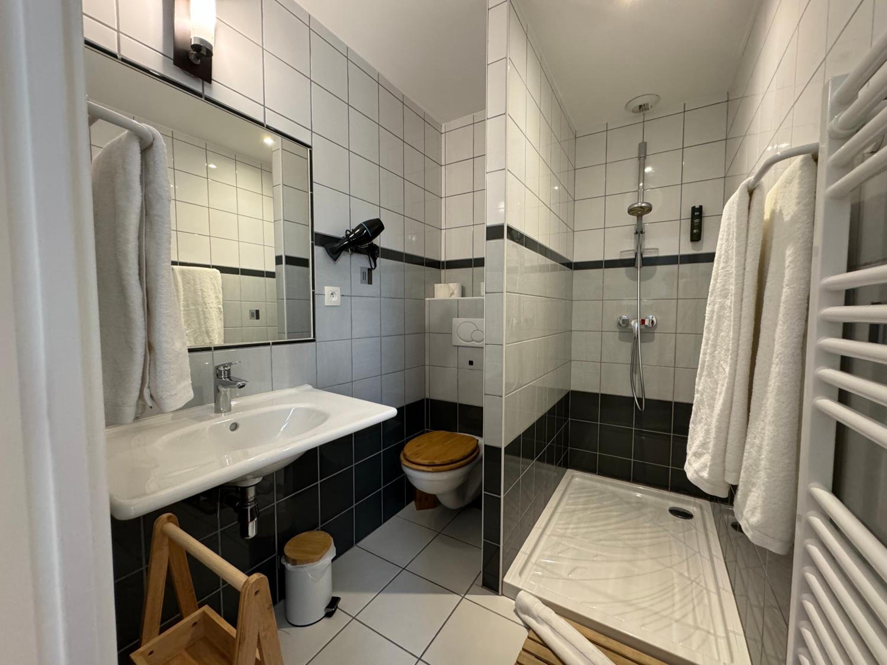 L'amabilité et la disponibilité du personnel. Le calme, les parkings, la chambre était très bien..., petit bémol, l'espace entre les WC et le radiateur...