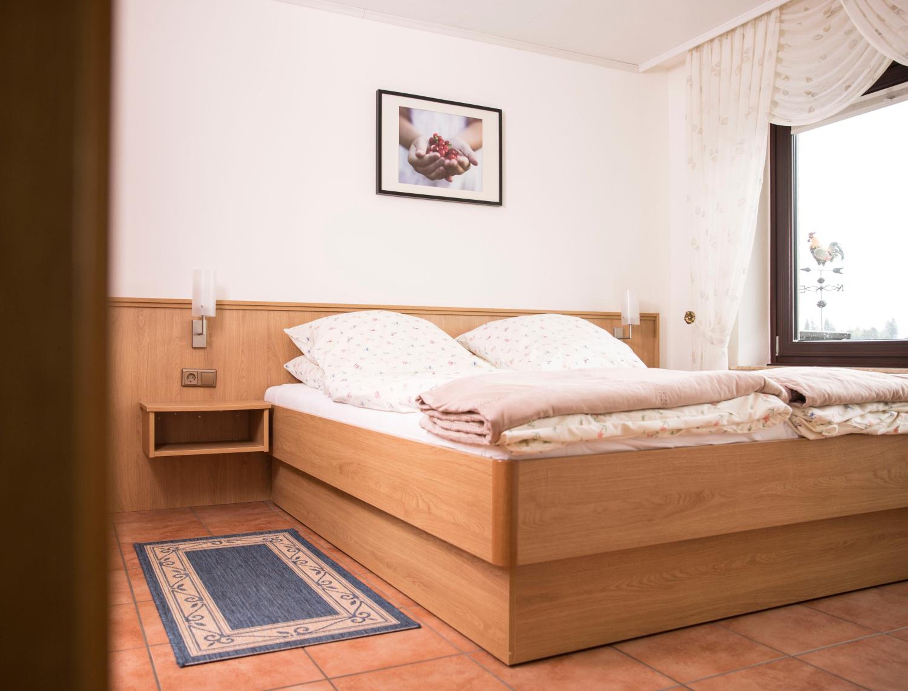 Das Doppelzimmer war sehr sauber, groß und mit einer schönen Sitzecke. Der Balkon hatte eine tolle Aussicht auf die Berge. Die Lage der Pension ist optimal zum Wandern. Unsere Hündin war auch herzlich willkommen.
