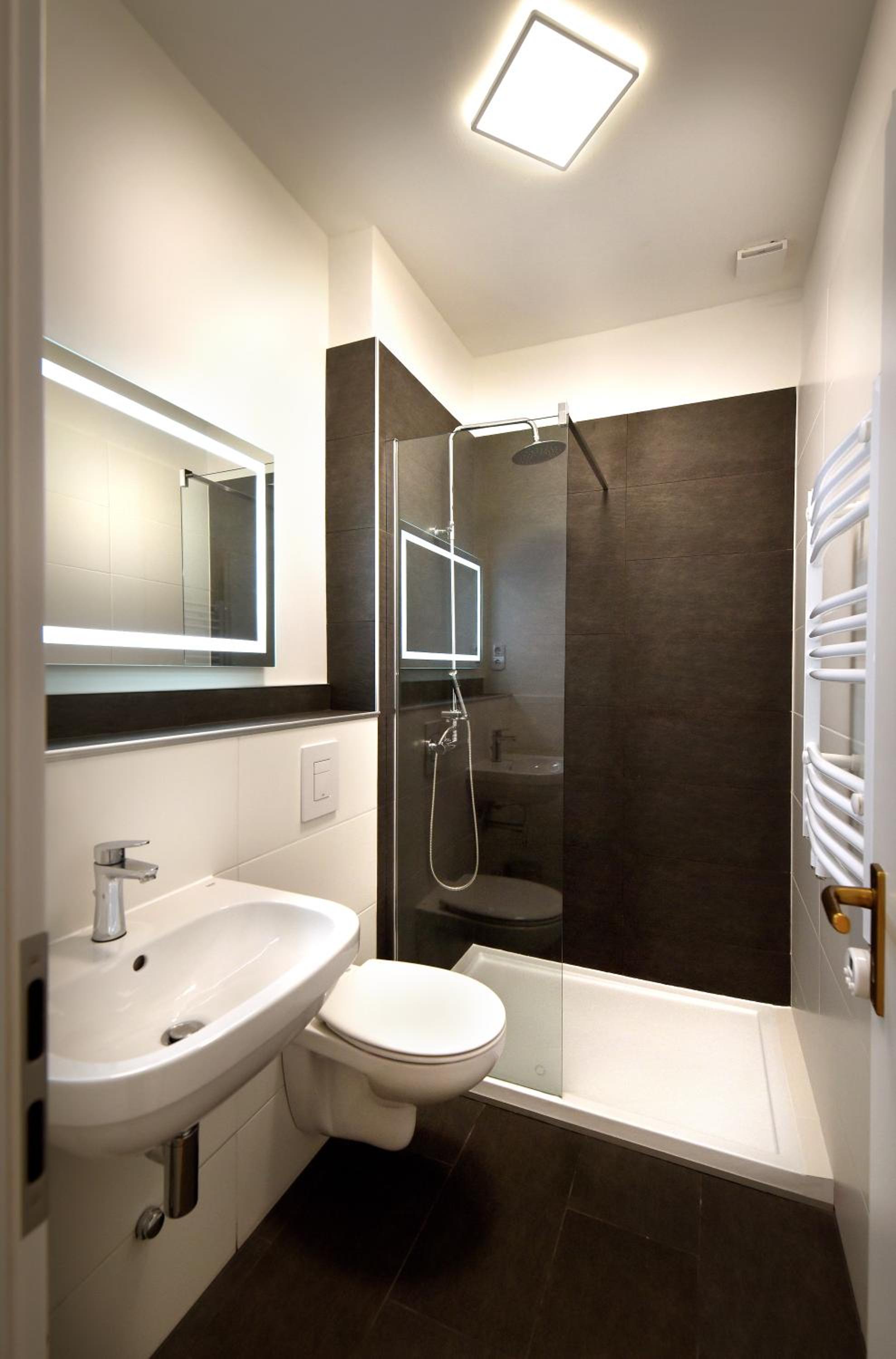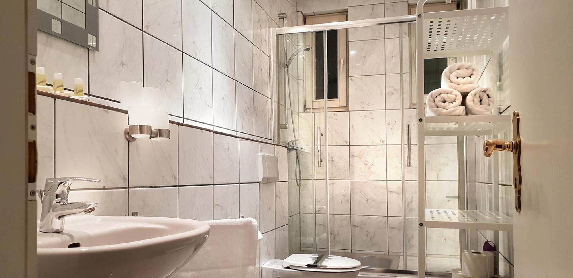 Badezimmer (kalt und spartanisch). Hotelzimmer war eiskalt.
