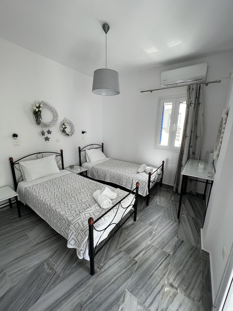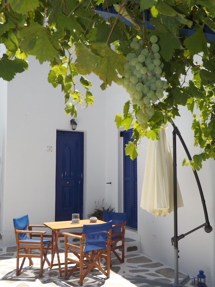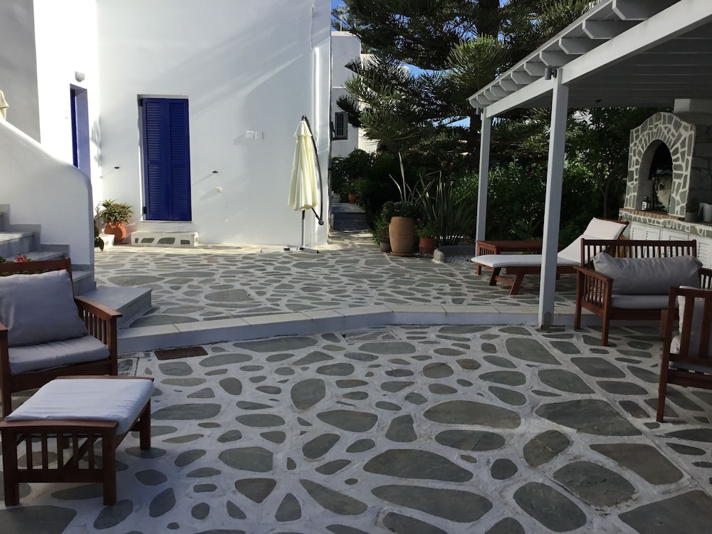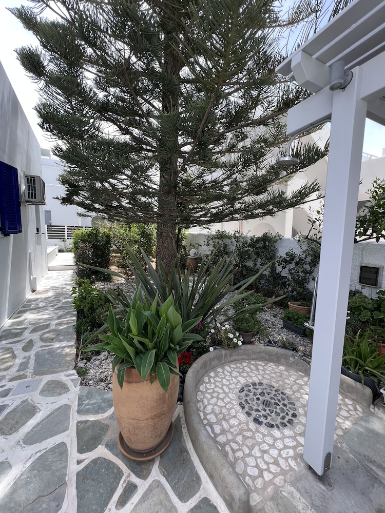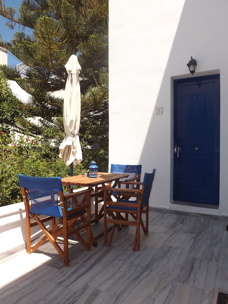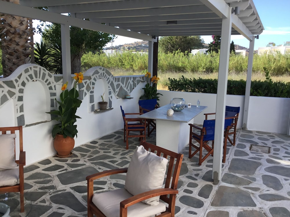 Short walk to the beach and restaurants. About 900m walk to the ferry and Parikia town.