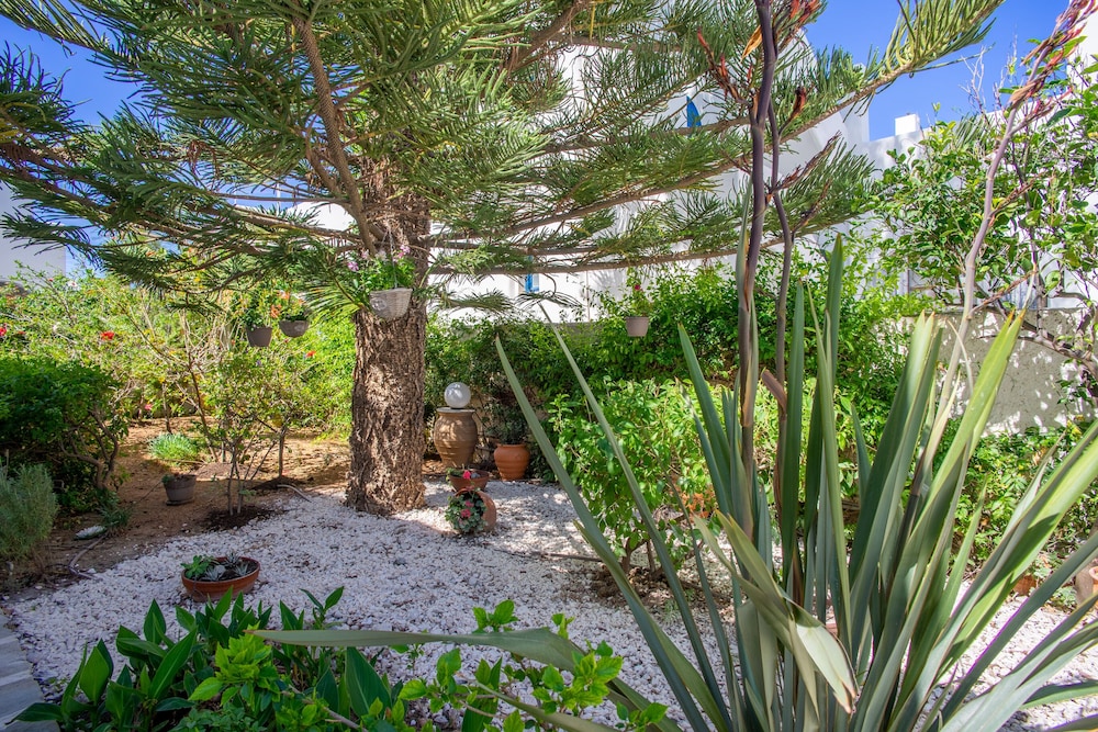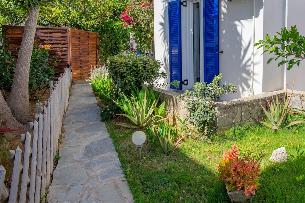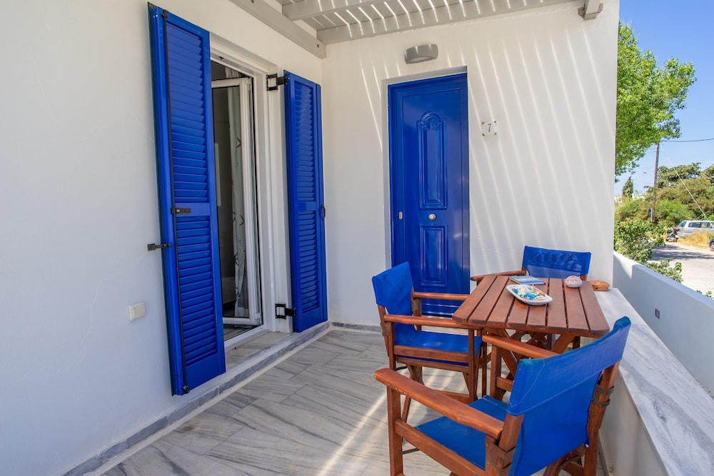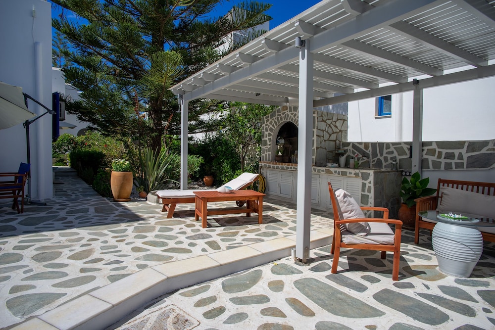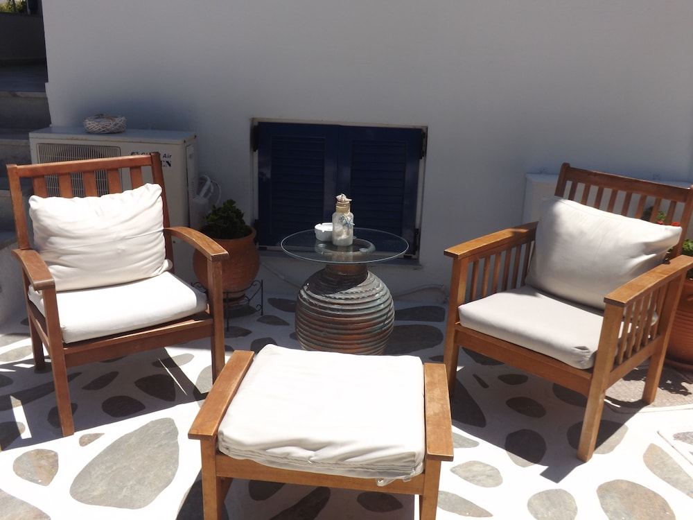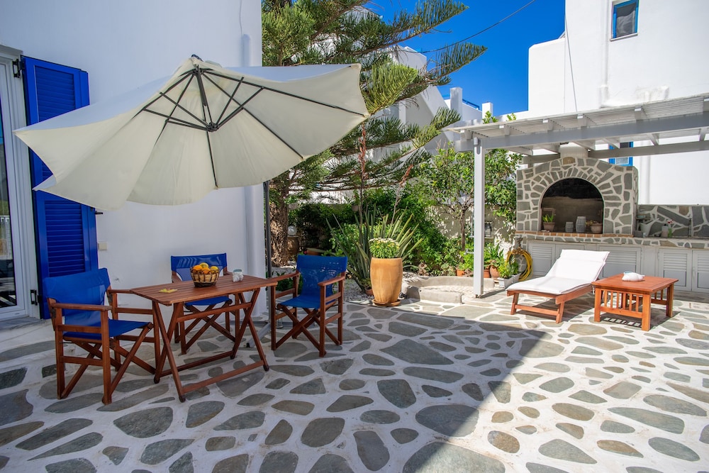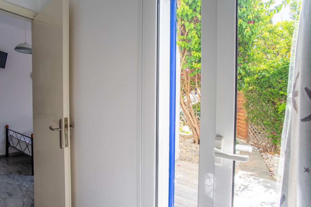 Short walk to the beach and restaurants. About 900m walk to the ferry and Parikia town.