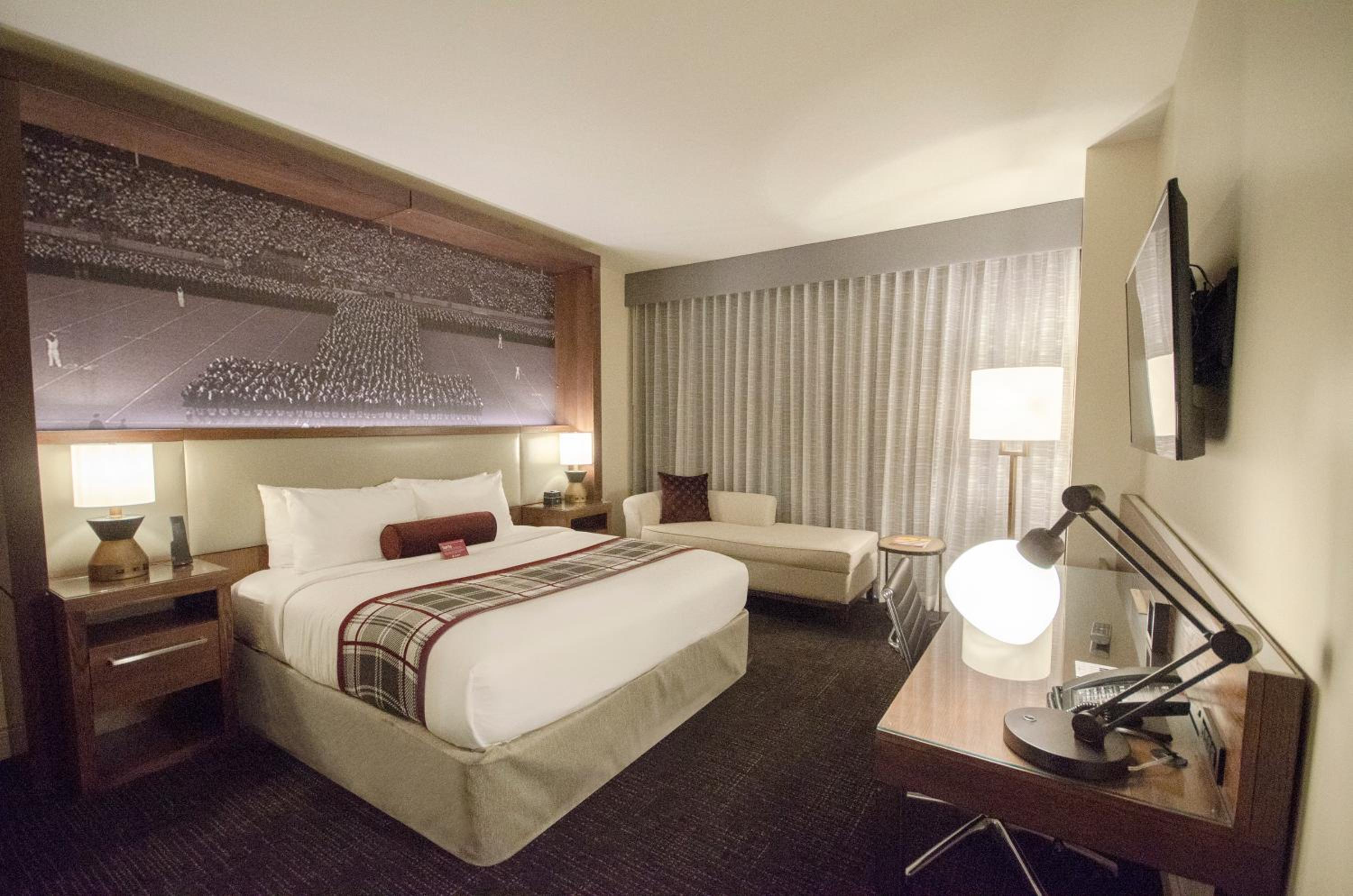 Great hotel located on the campus. Good value because it was during the week. Staff is excellent. Be warned that a railroad track is across the highway. They furnish you with ear plugs. Used them and didn't hear a train. Good restaurant and bar at the hotel. Very clean and nice linens.