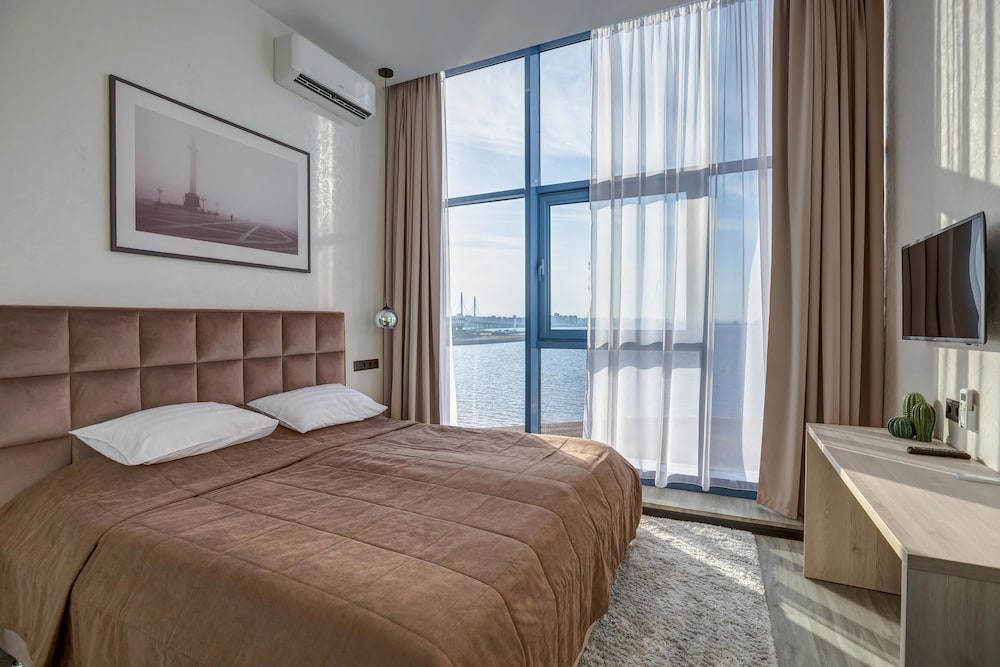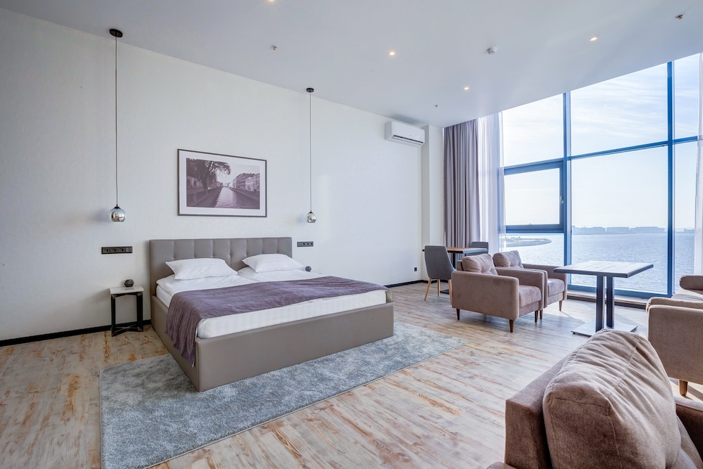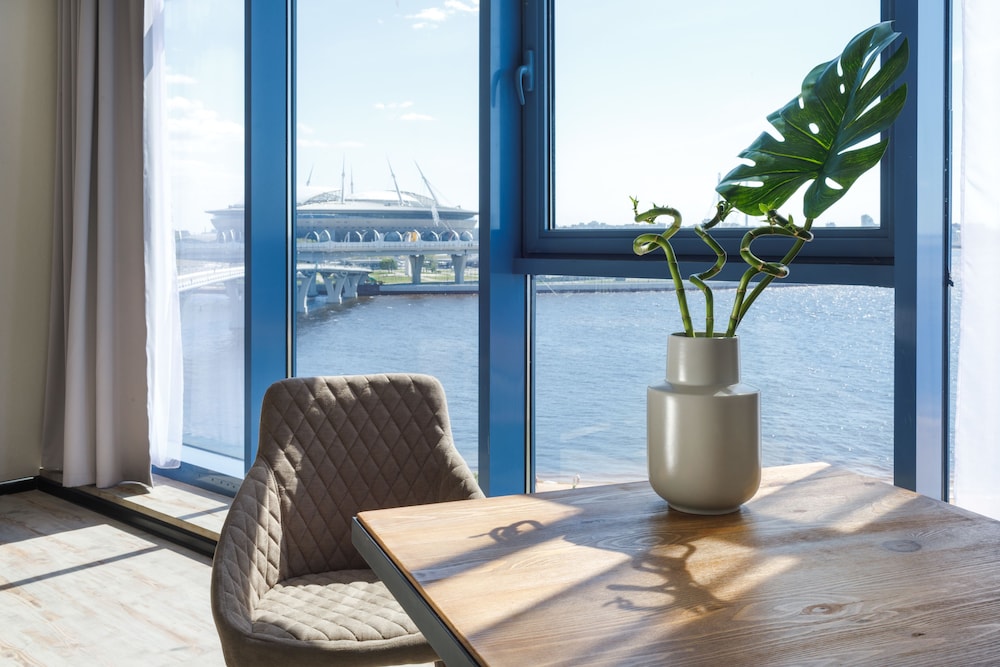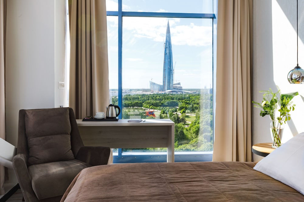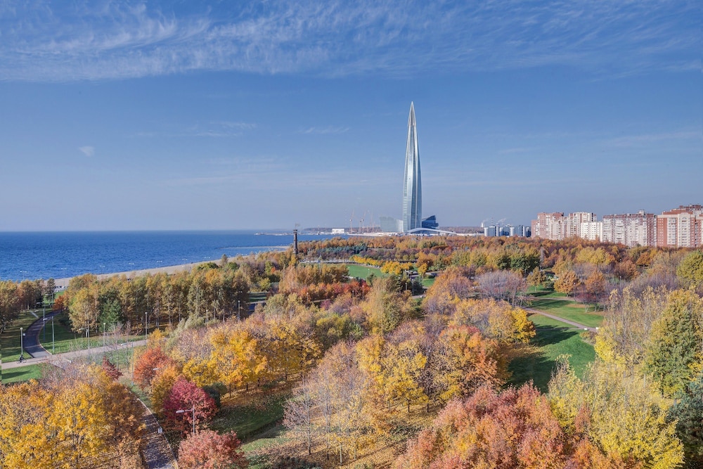 Tapahtumiin stadionilla ei ole parempaa paikkaa kuin tämä, vartin kävelymatkan päässä portit. Hienot maisemat Nevan suunnalla muutenkin ja samassa kompleksissa ostoskeskuksen kanssa, josta löytyy mm. vesipuisto, johon on tosin pitkät jonot aina. Hotellin huoneet kesällä ehkä turhankin valoisia, mutta ikkunallisten huoneiden merinäköala toki upea. Aamupala alakerran ravintolassa, joka ei hirveän häävi ollut, mikä on Venäjän hotelleissa melkein aina tilanne. Ystävällinen palvelu ja avulias henkilökunta vastaanotossa.