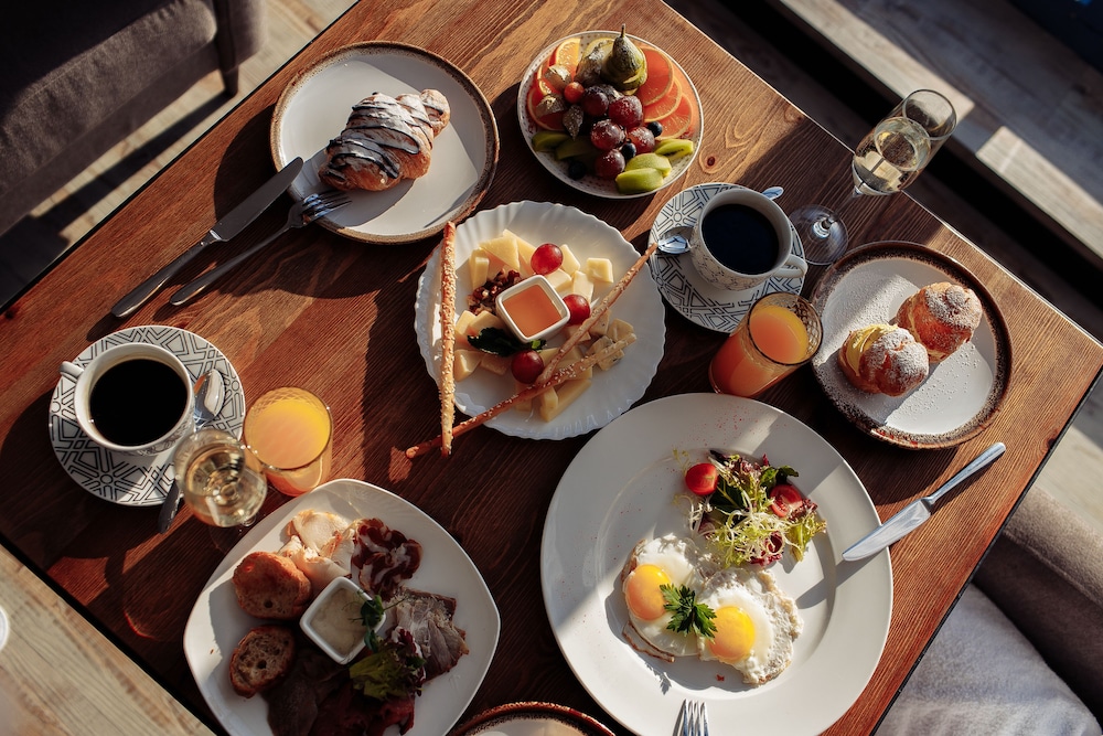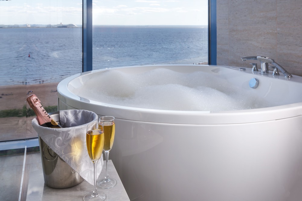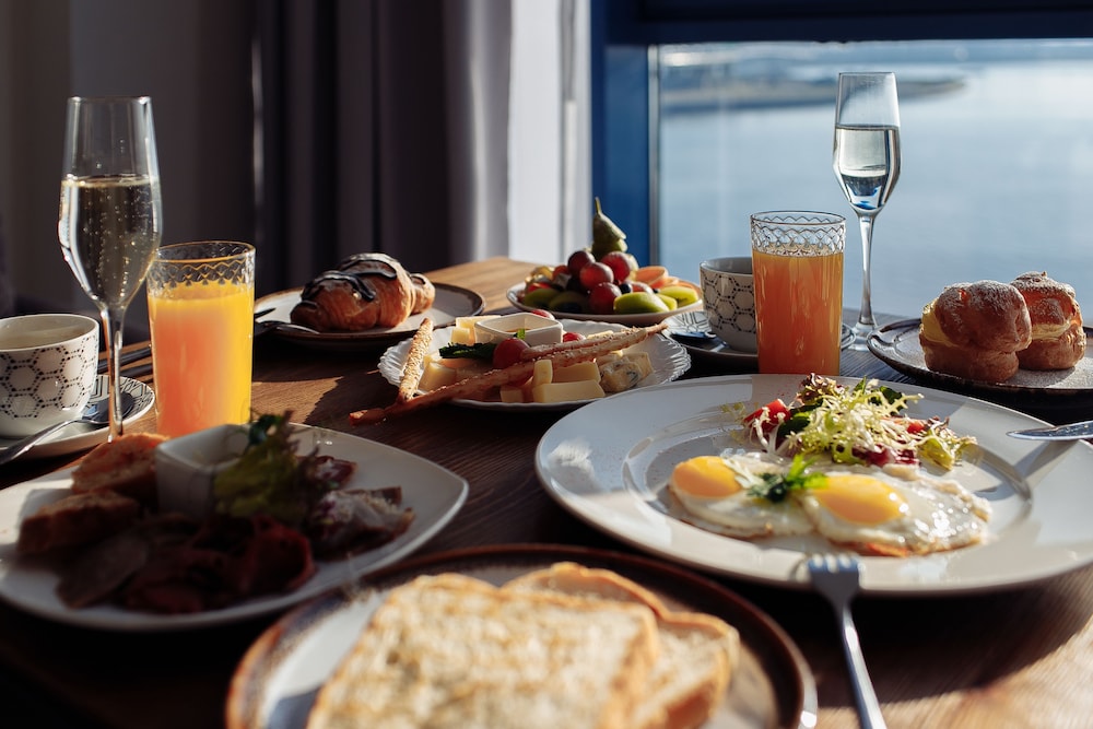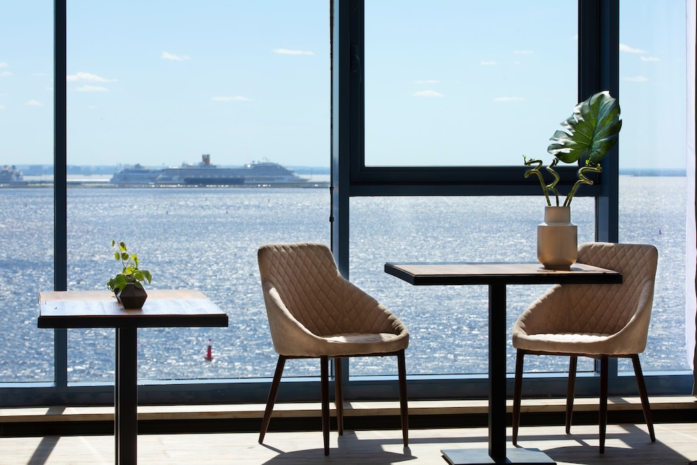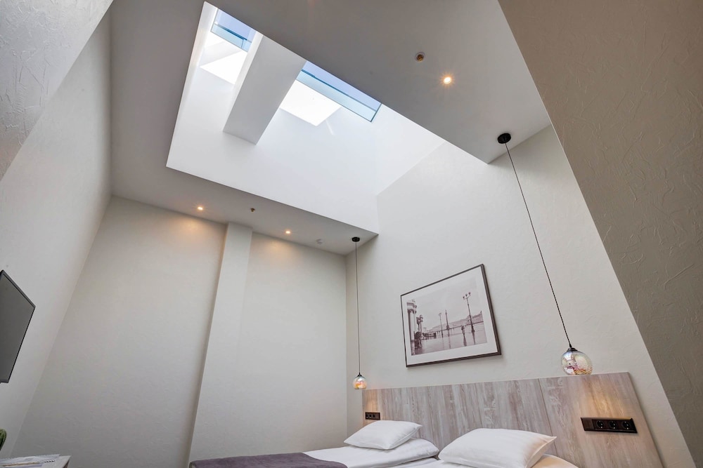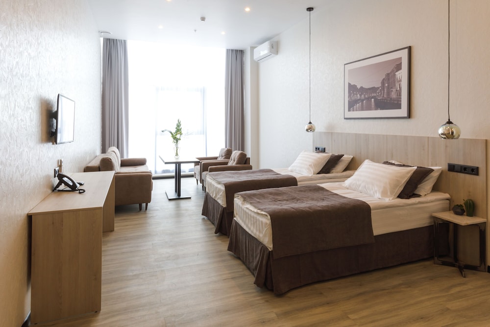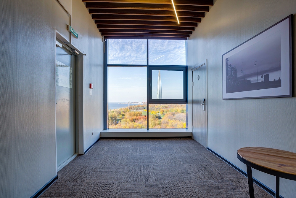 Отель расположен на 5-ом этаже торгового центра. На момент заезда торговый центр закрыли из-за нарушений пожарной безопасности, поэтому в отель можно было попасть через служебный проход. Изначально был забронирован стандартный двухместный номер. При заселении увидели, что в номере имеется окно только в потолке над кроватью. Доплатив на месте, заняли "полулюкс" с панорамным окном на Финский залив. Вид замечательный! Завтраки проходят в ресторане на 4 этаже. Ассортимент предлагаемых продуктов вызвал недоумение. Отсутствовал хлеб, сливочное масло,сахар, кофе был остывший (холодный). Одна тарелка с овощами, одна тарелка с фруктами. Мясная нарезка прокисшая... (( В отелях 4 звезды такие завтраки увидела впервые.