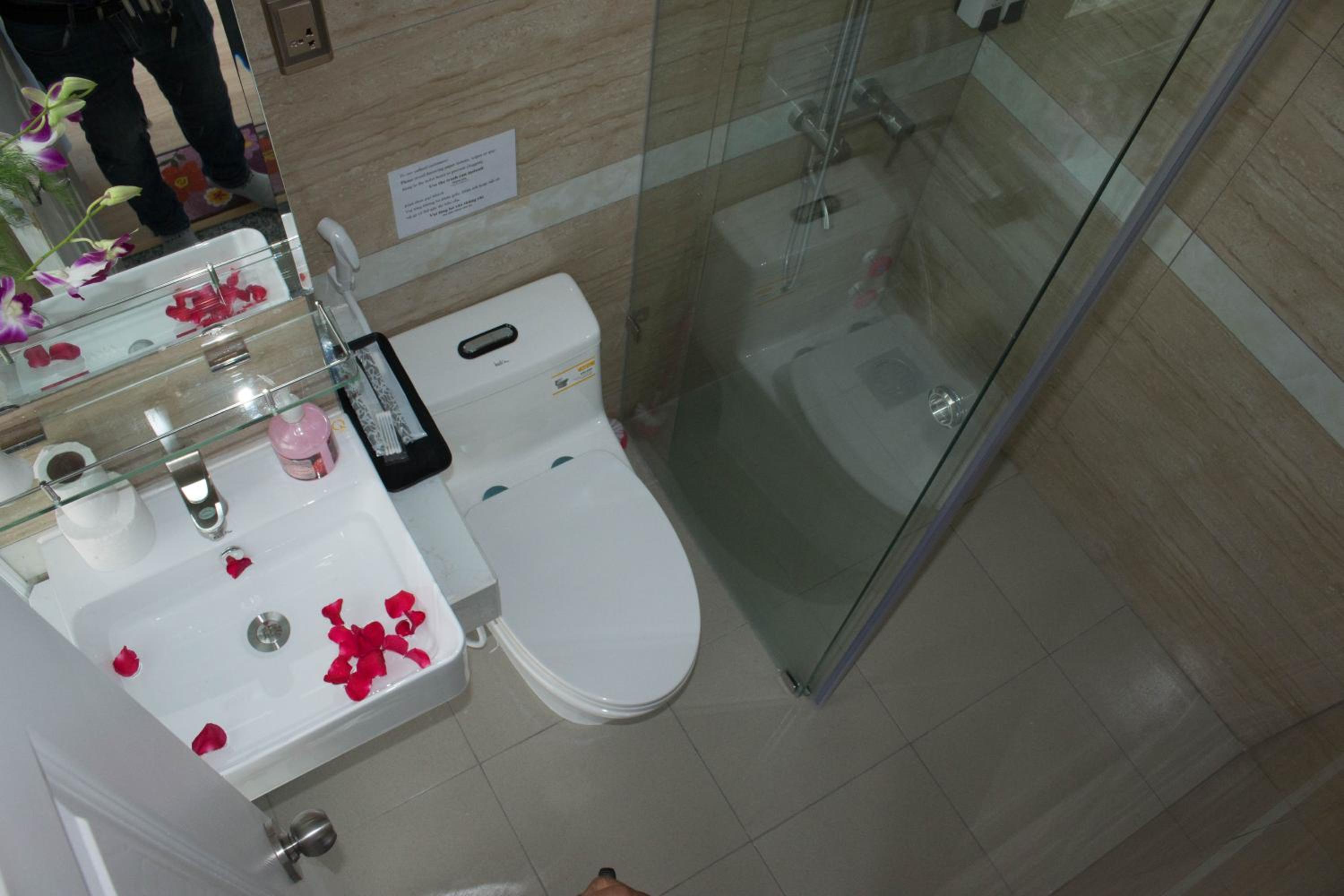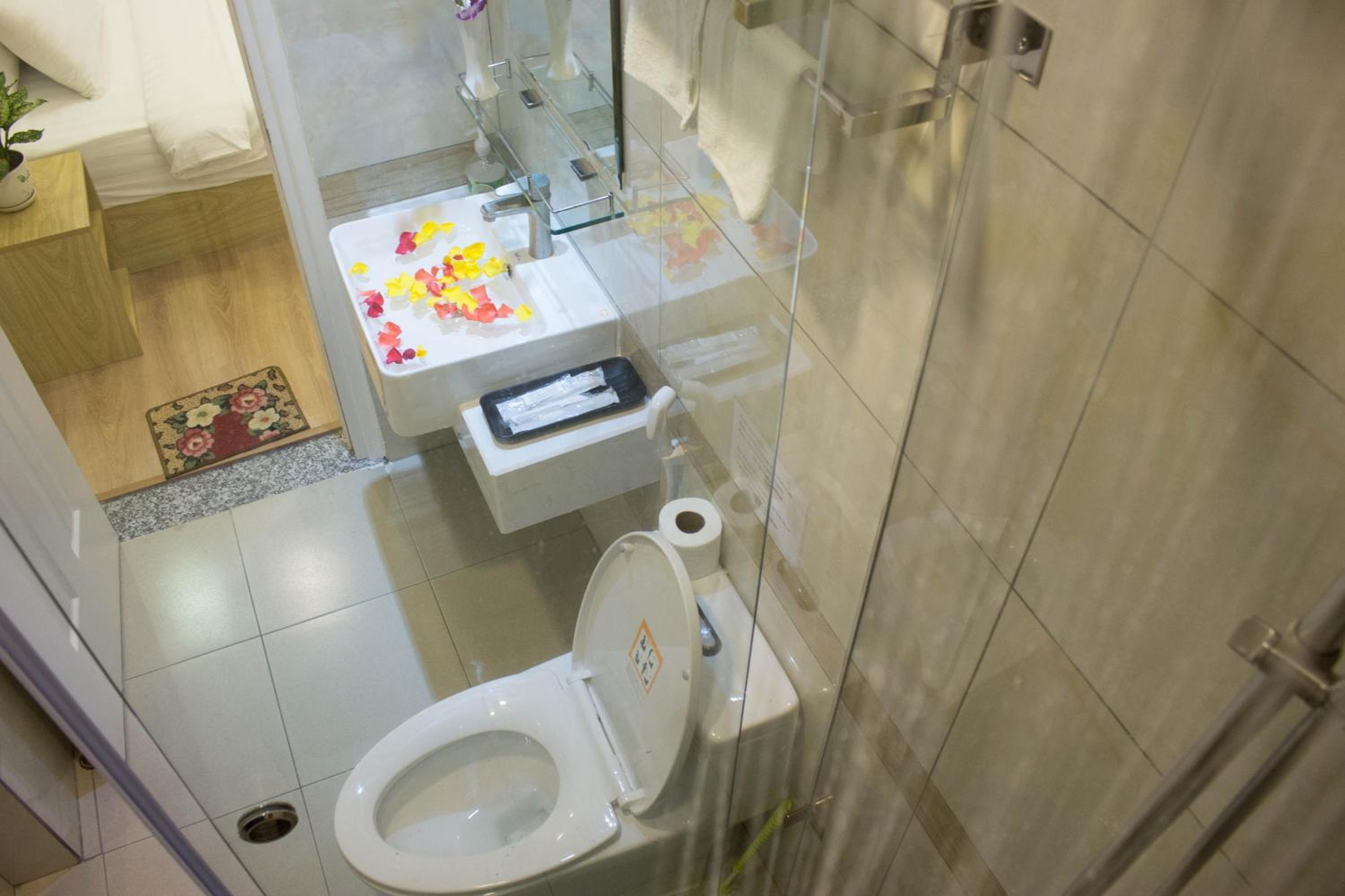 small room. once bathroom door open will bump the people who stand beside bed