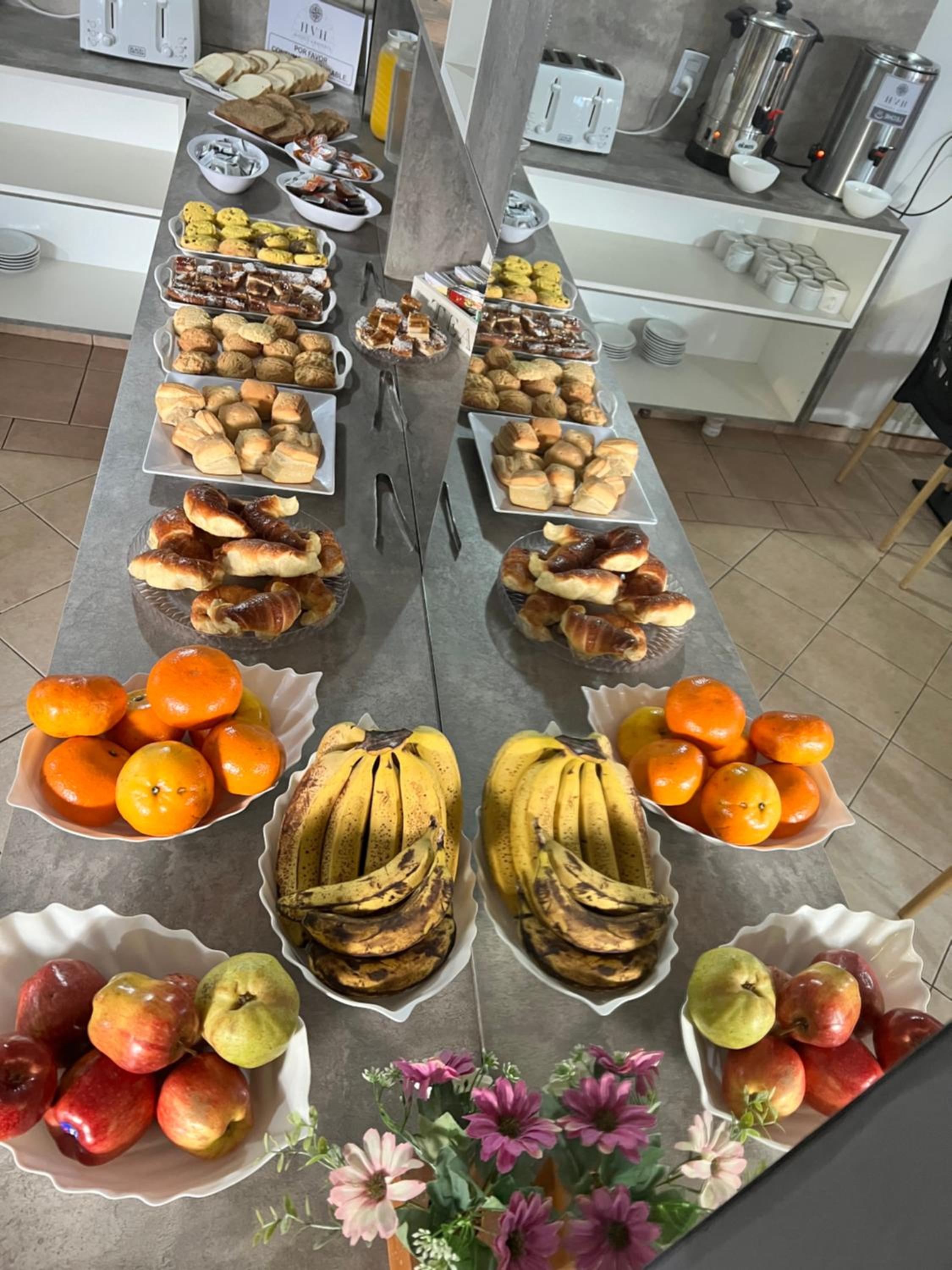 El desayuno es muy malo: tostadas, medialunas y criollos viejos, duros y claramente de días anteriores, jugo en sobre y cocido en polvo. Nada fresco, nada cuidado.