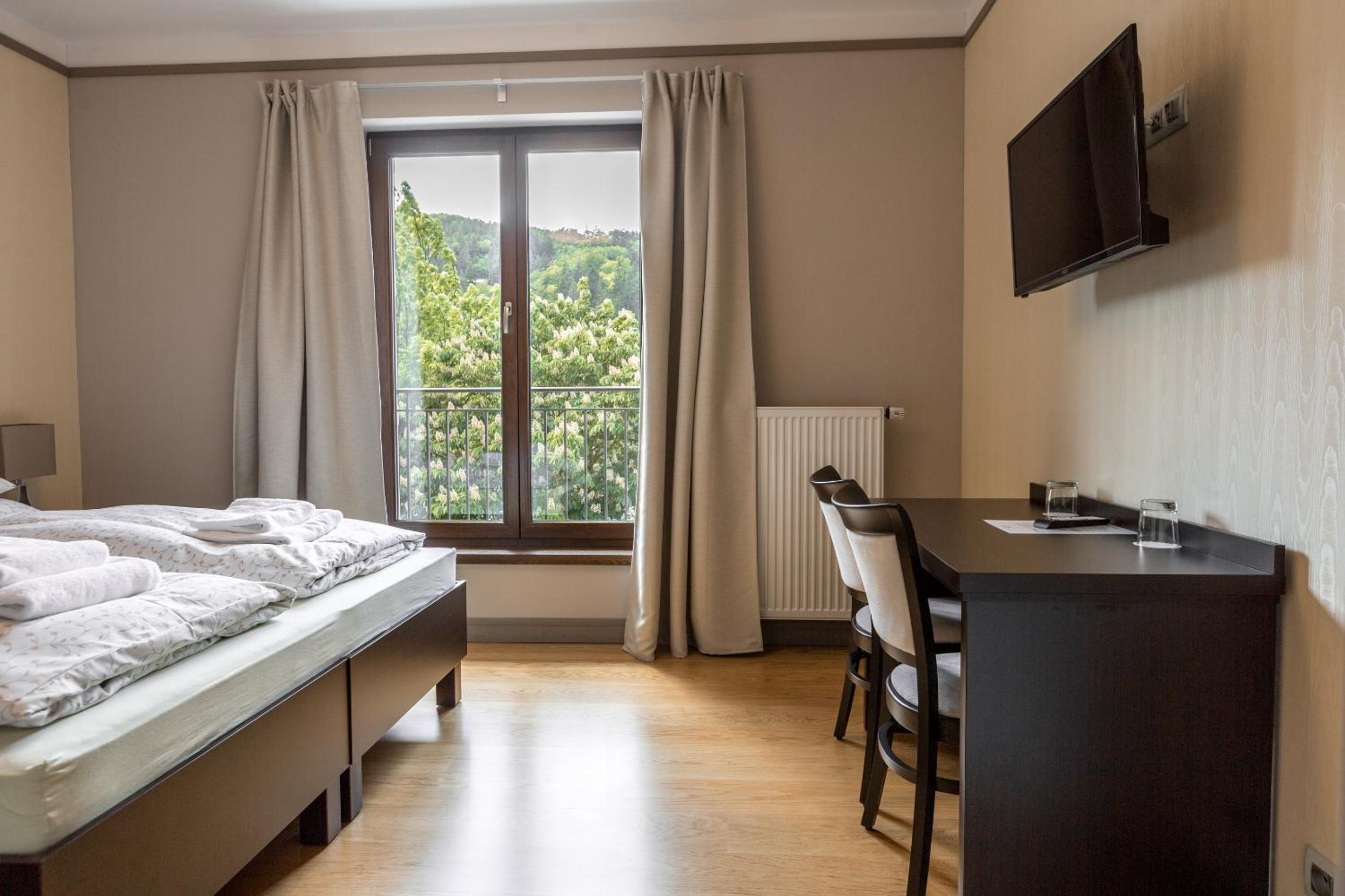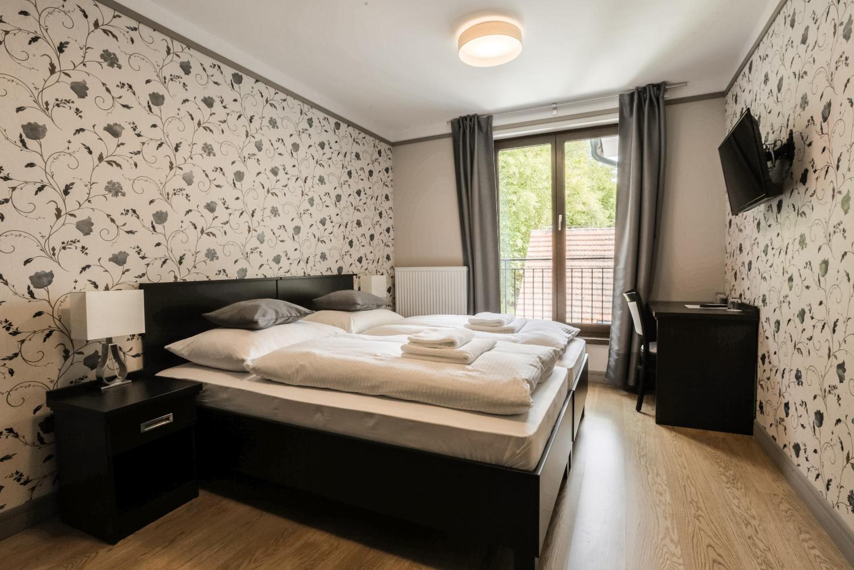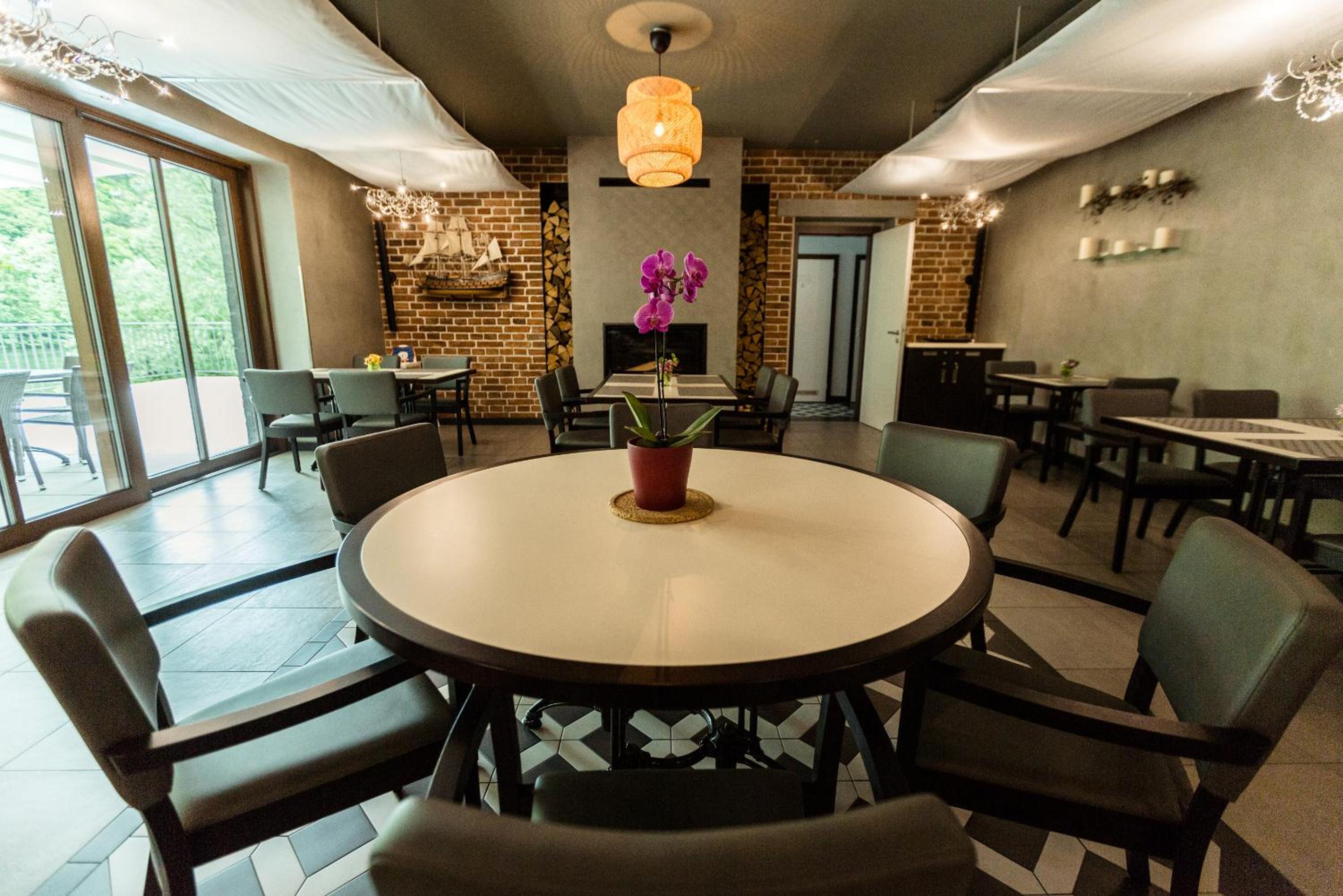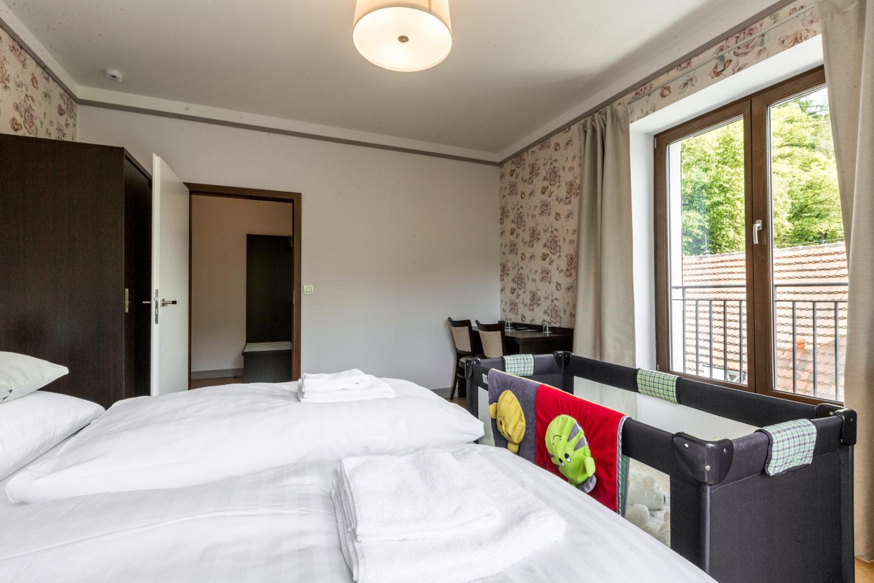 Hotel Mandát boasts a tranquil garden, perfect for relaxing strolls or enjoying a delicious meal at the on-site restaurant. Guests can also unwind on the terrace with a refreshing drink from the bar.
