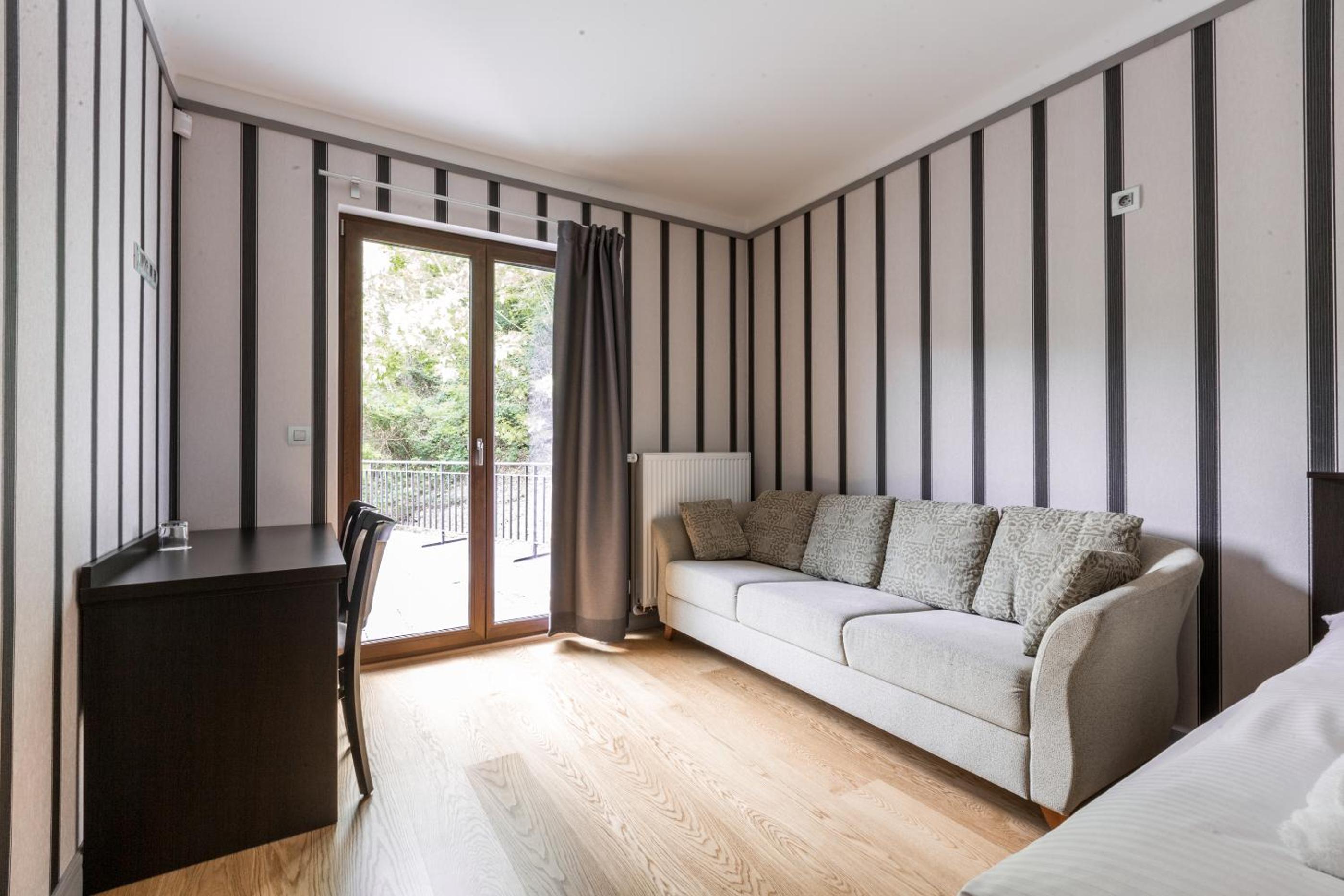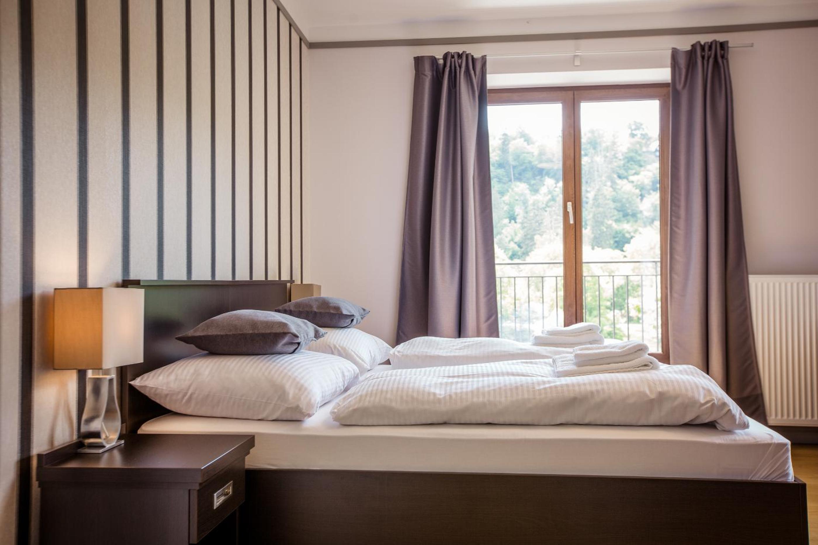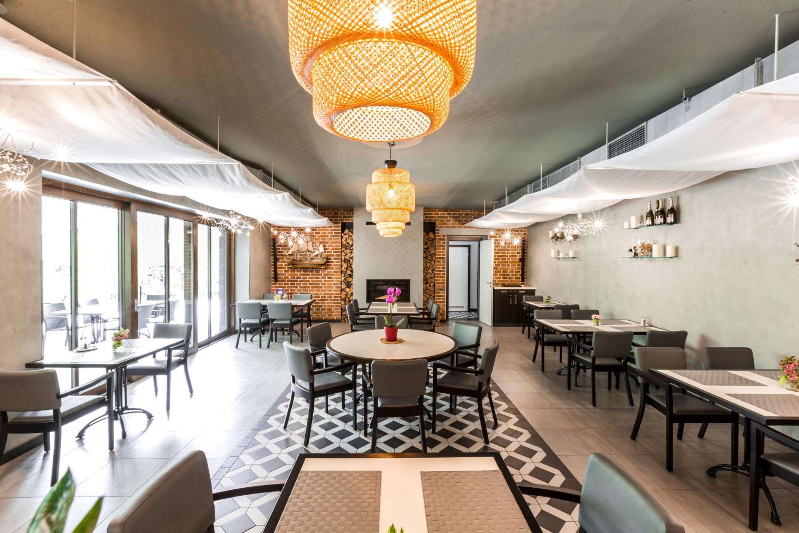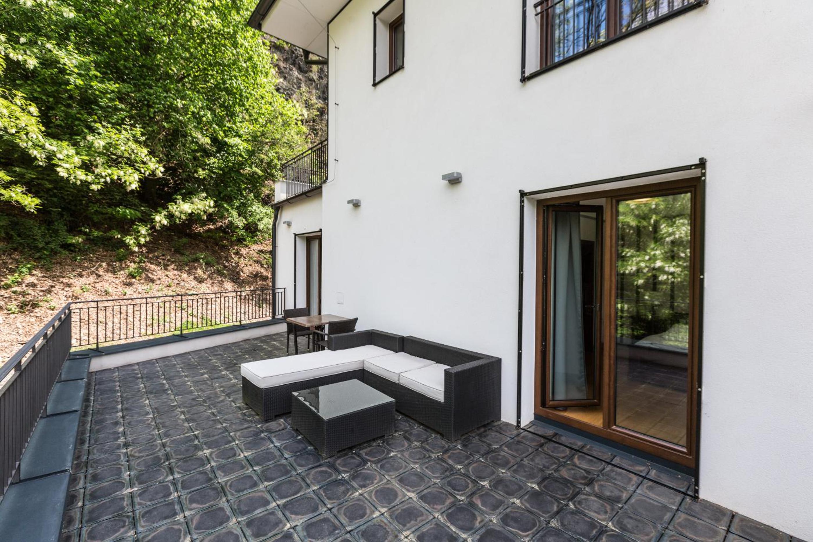 Hotel Mandát boasts a tranquil garden, perfect for relaxing strolls or enjoying a delicious meal at the on-site restaurant. Guests can also unwind on the terrace with a refreshing drink from the bar.