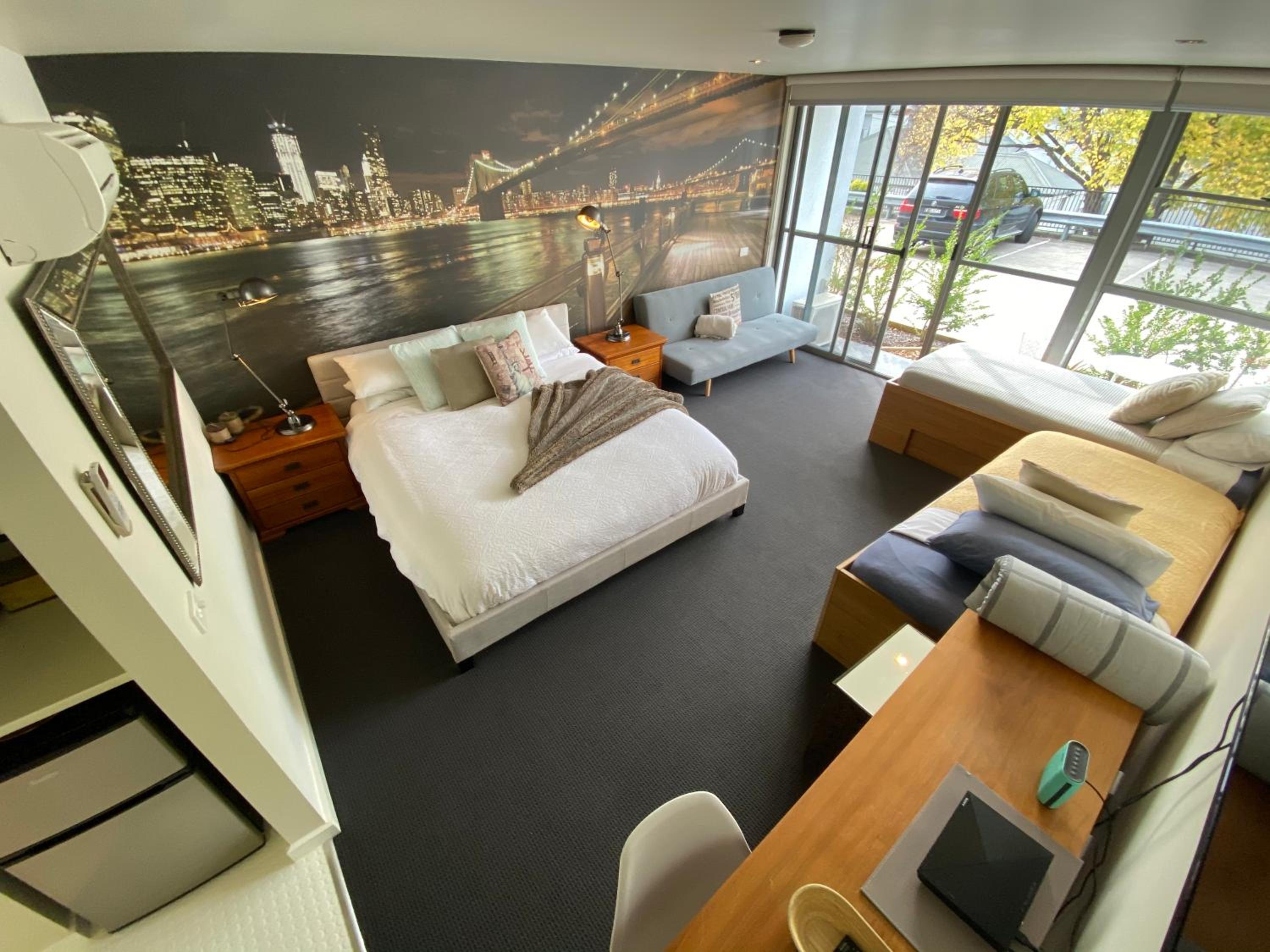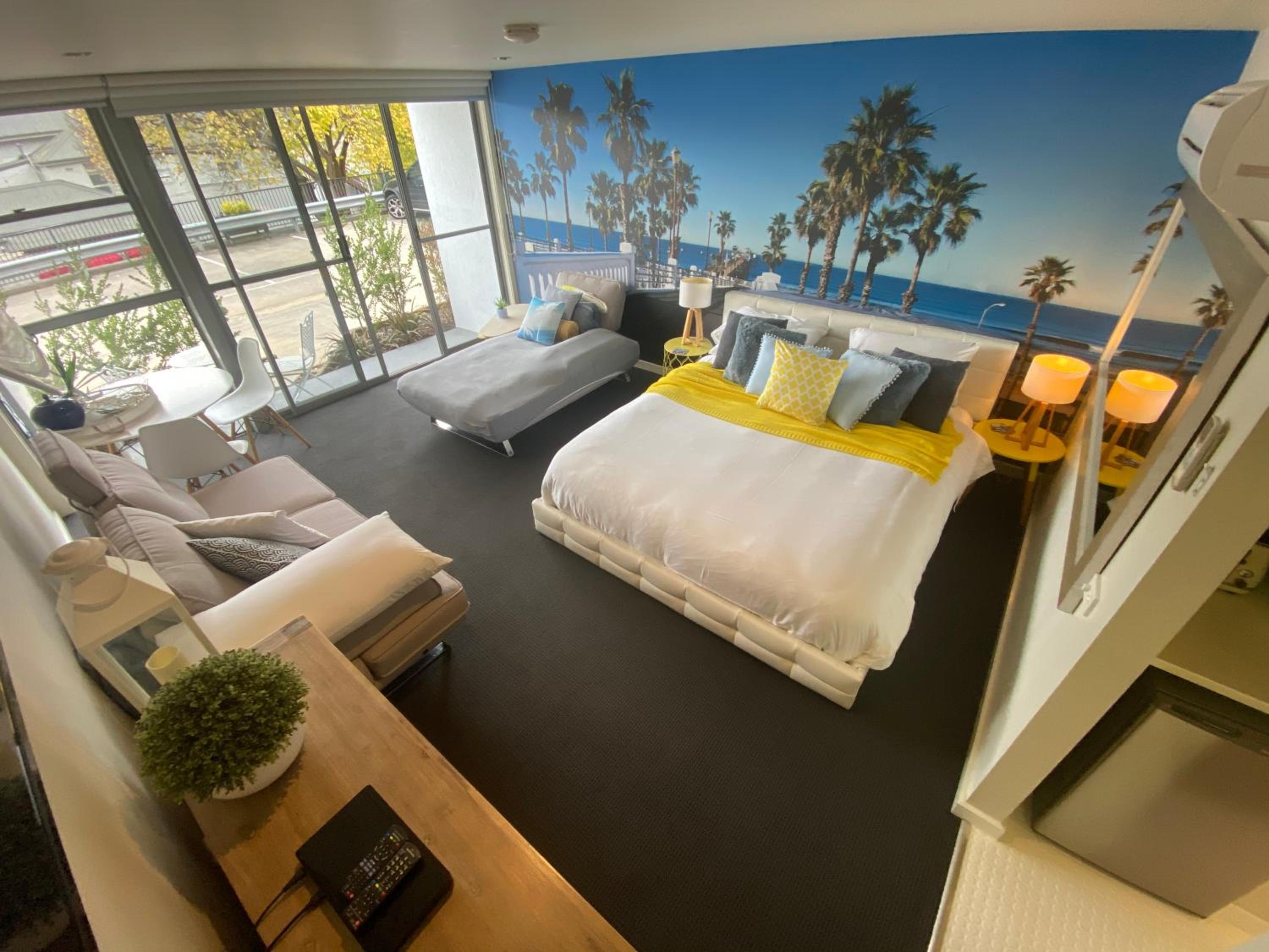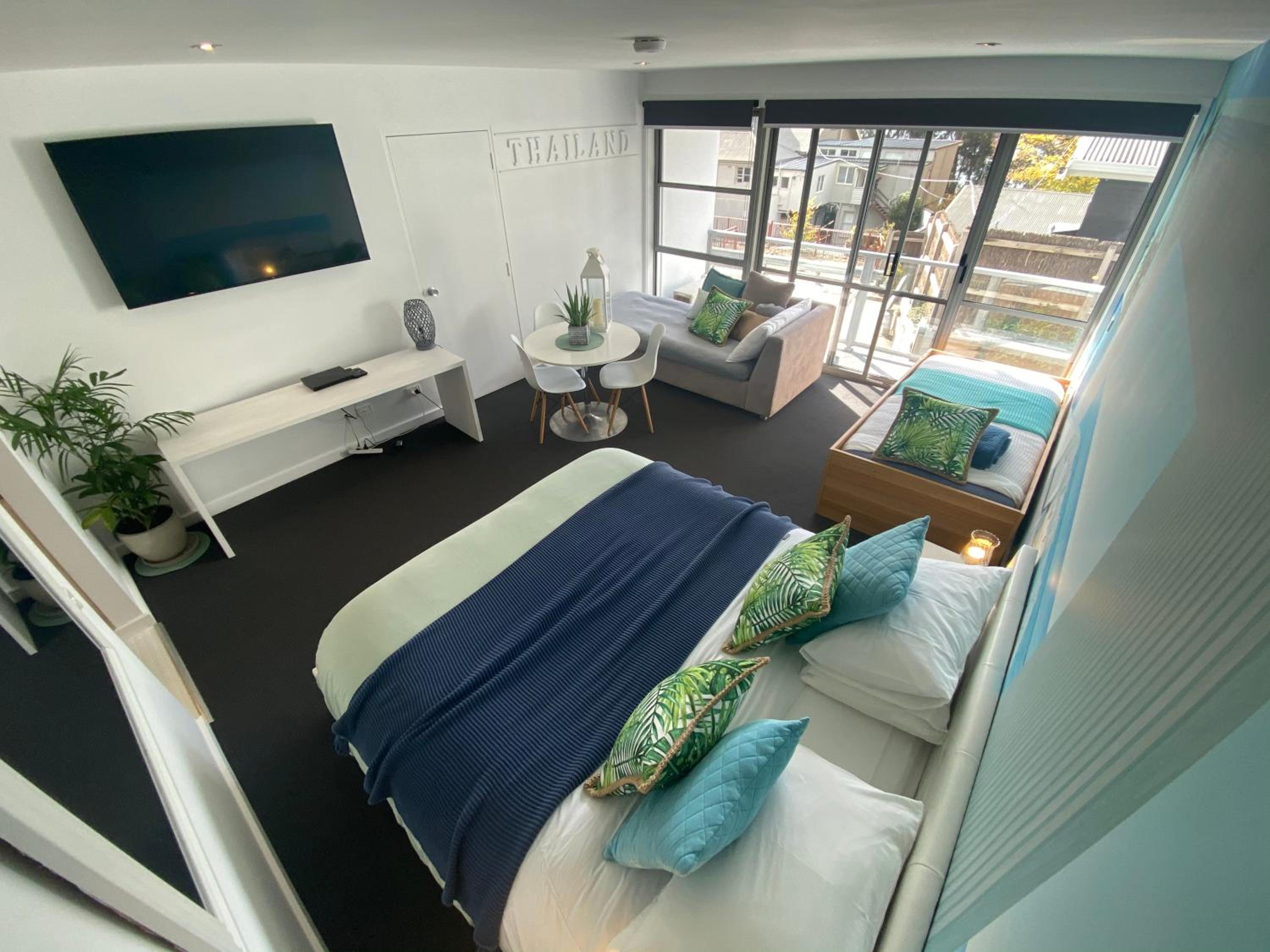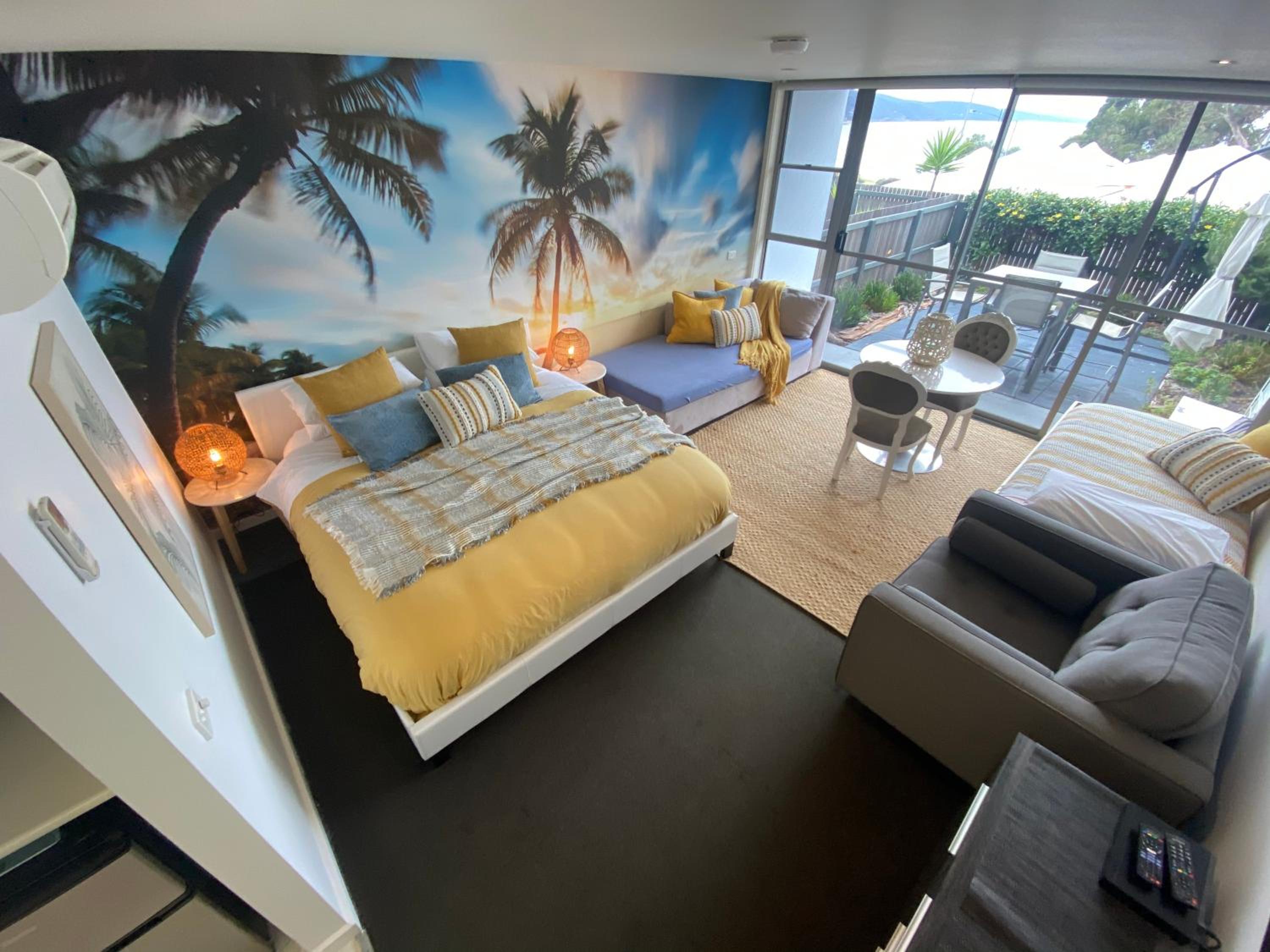Relax in the air-conditioned studio apartment featuring a TV, DVD/Blu-Ray Player, and a fully equipped kitchen. The vibrant wall murals add a touch of color and character to each room.