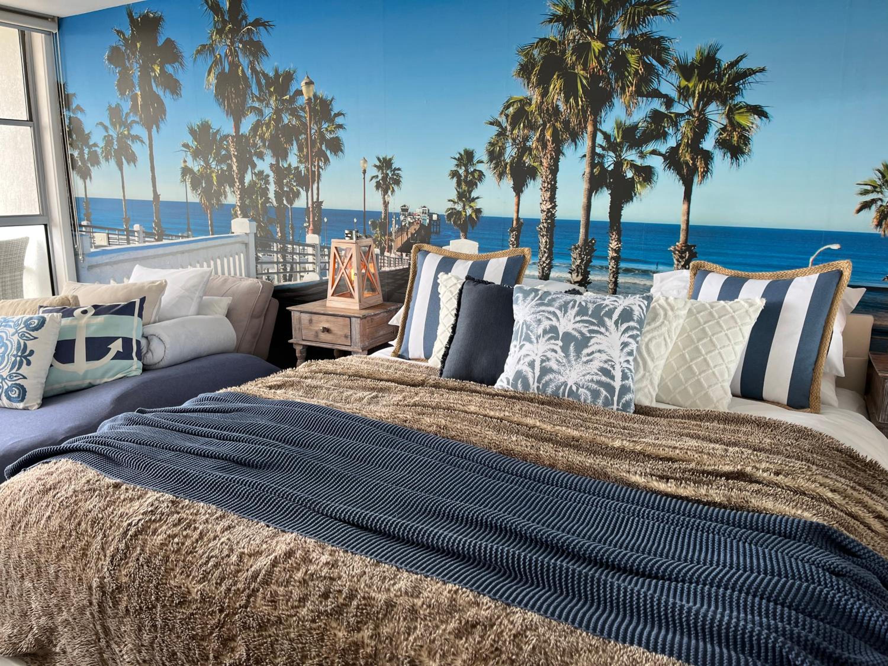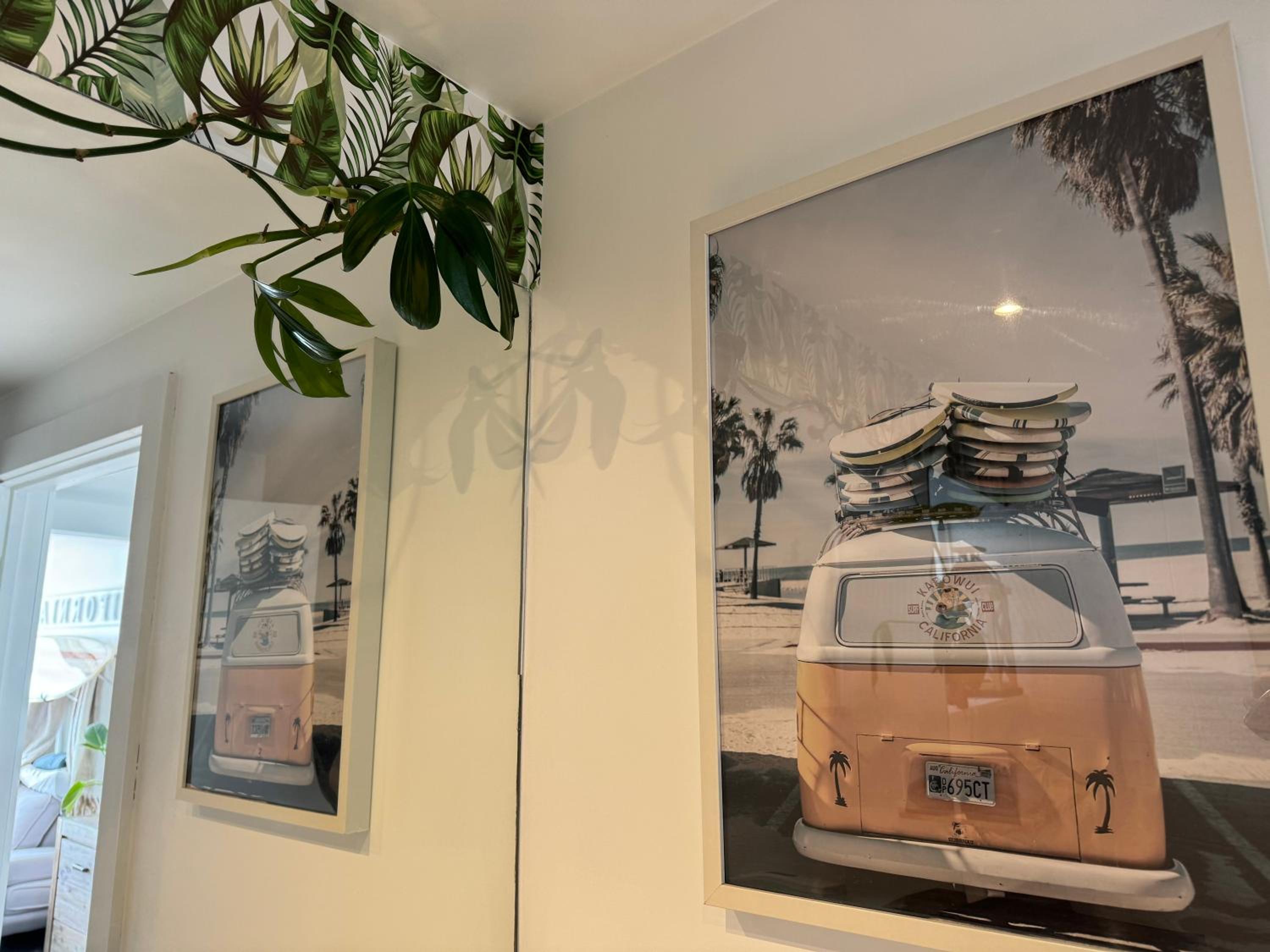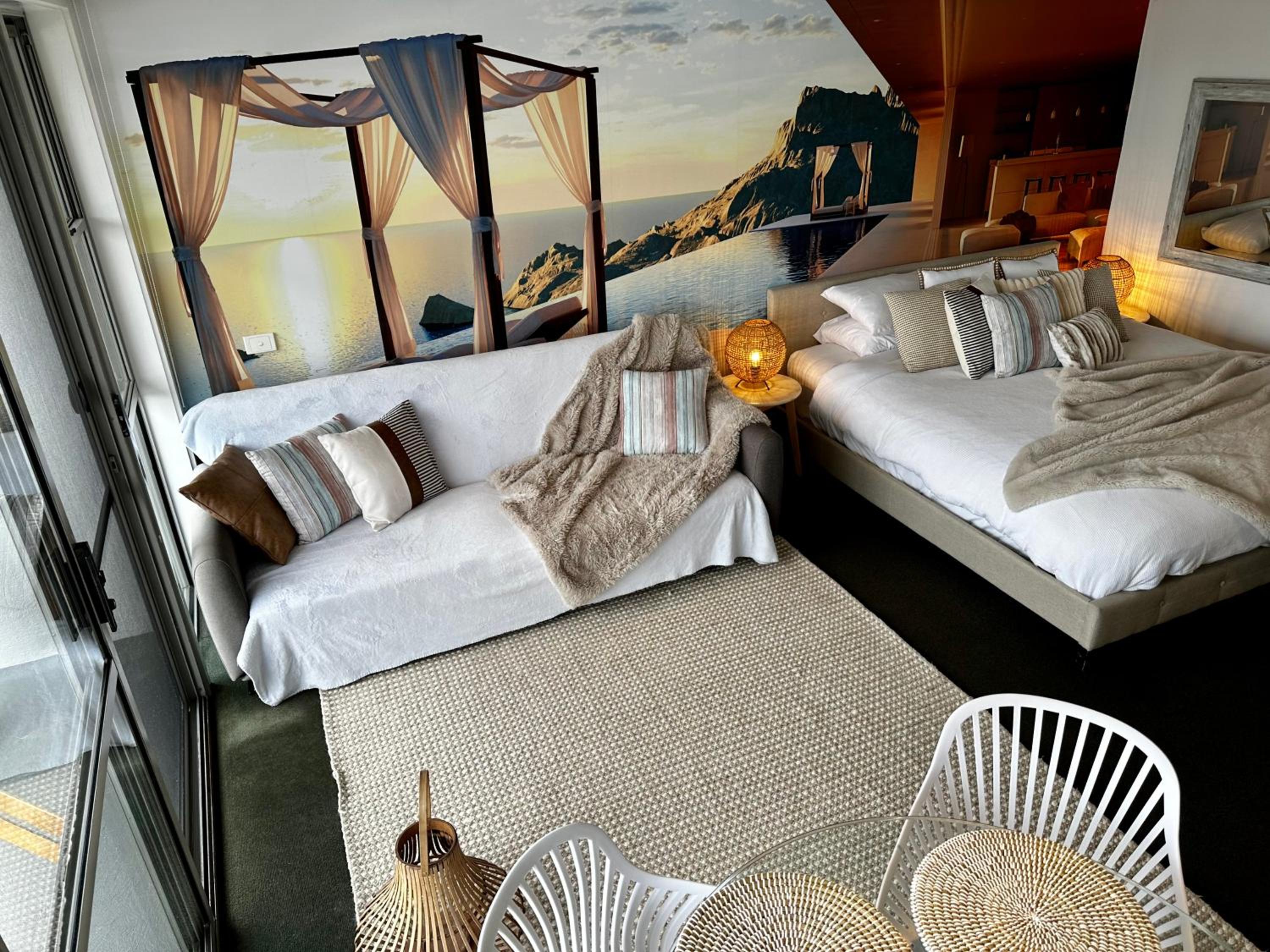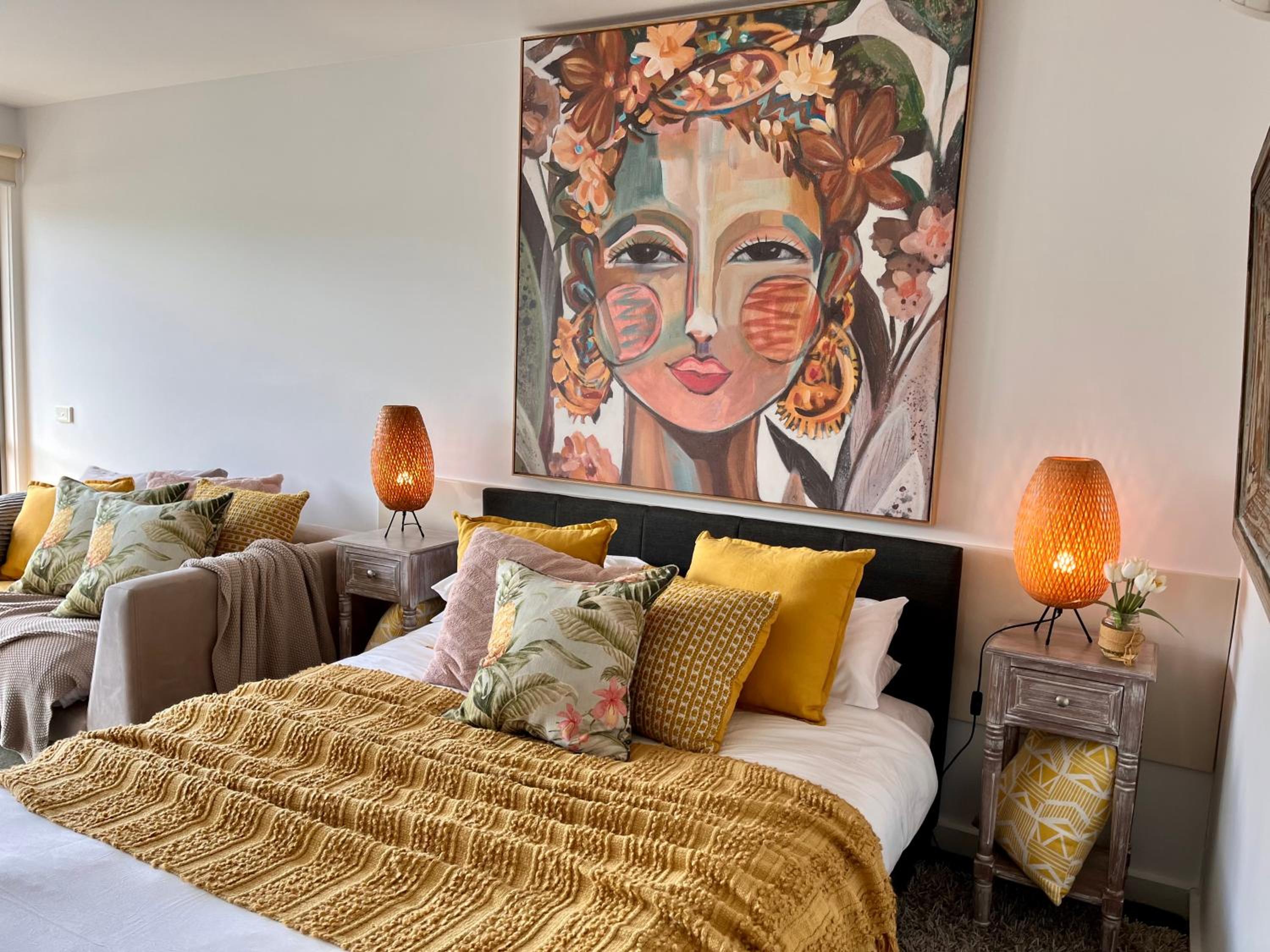 Relax in the air-conditioned studio apartment featuring a TV, DVD/Blu-Ray Player, and a fully equipped kitchen. The vibrant wall murals add a touch of color and character to each room.