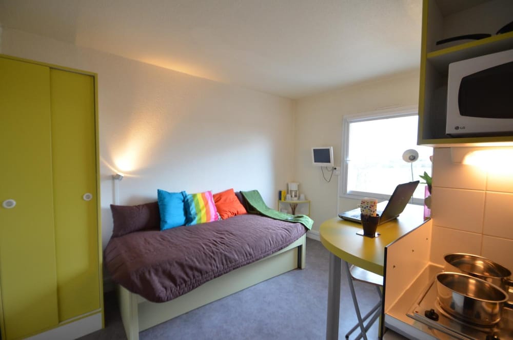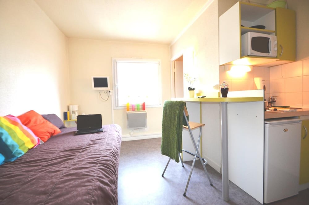 Et vous trouverez un studio assez spacieux, avec "tout ce qu'il faut" pour un séjour de courte durée.