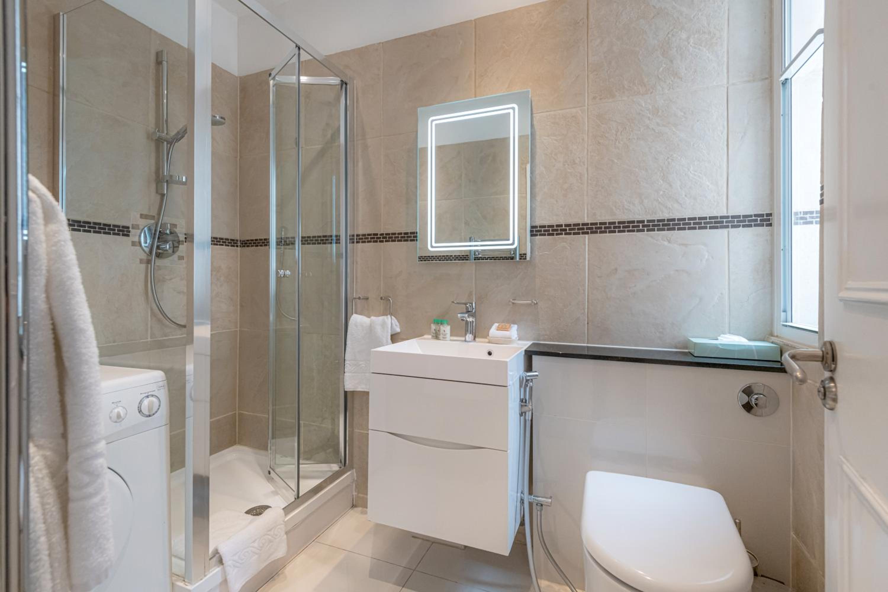 Great location, good sized lounge, bathroom, bedroom and kitchen. Well presented, tiny lift but at least there was one. We were on the first floor so easy walk up. Only problem was that there were no instructions for the washer/dryer and the TV which had over 600 channels but needed instruction how to search them. Both were solved by the concierge and they demonstrated the solutions.