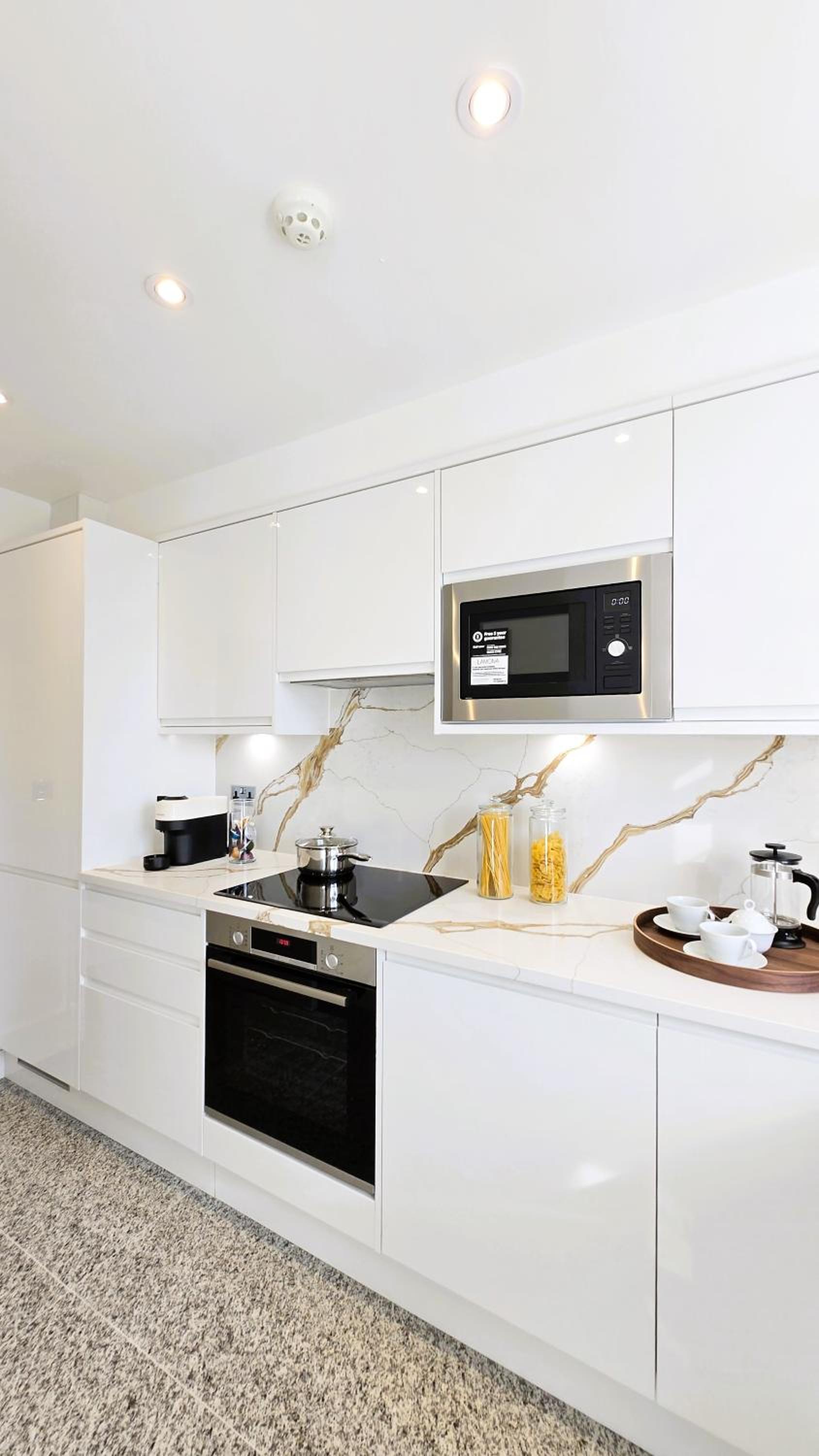 Each apartment at Fountain House is decorated in light brown and grey tones. The lounge includes a sofa and a TV, while kitchen facilities a washing machine, dishwasher, a hob, oven, a fridge, toaster, and kettle.