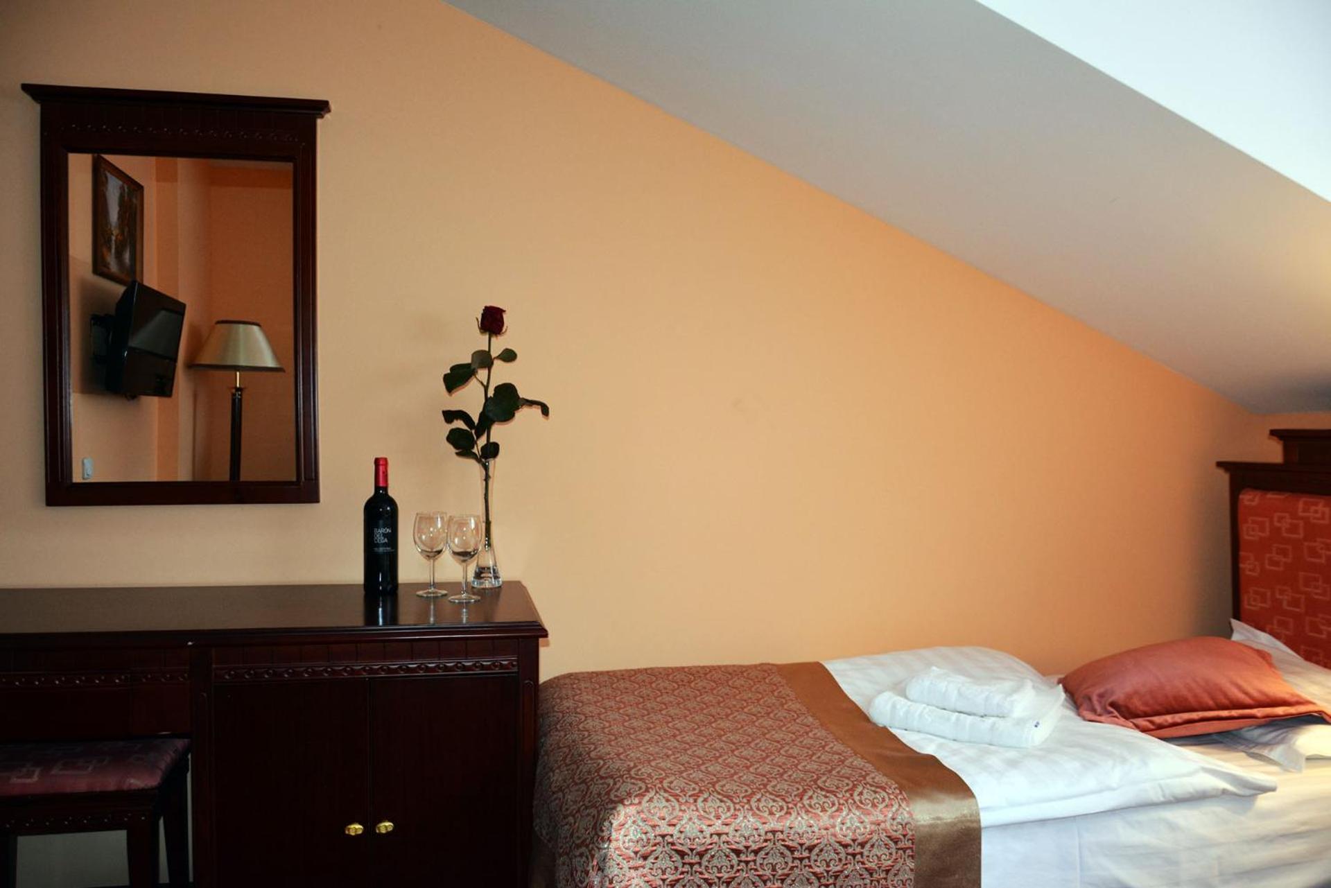 W cenie powinny być dostępne sauny suche, turecka miała za wysoką temperaturę. Mieliśmy pokój na poddaszu z pojedynczymi łóżkami, niestety były wąskie, bałam się w nocy, że spadnę.