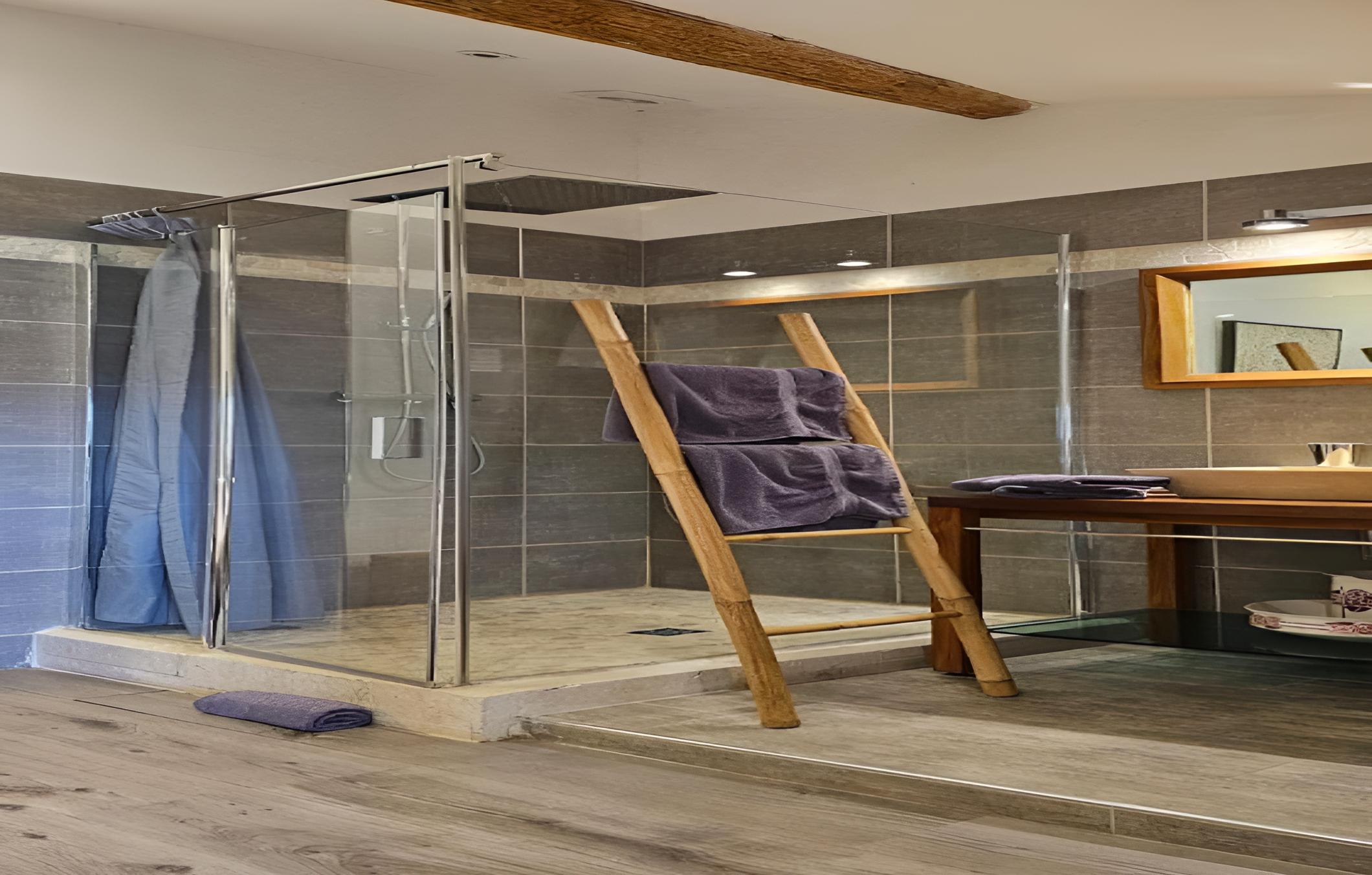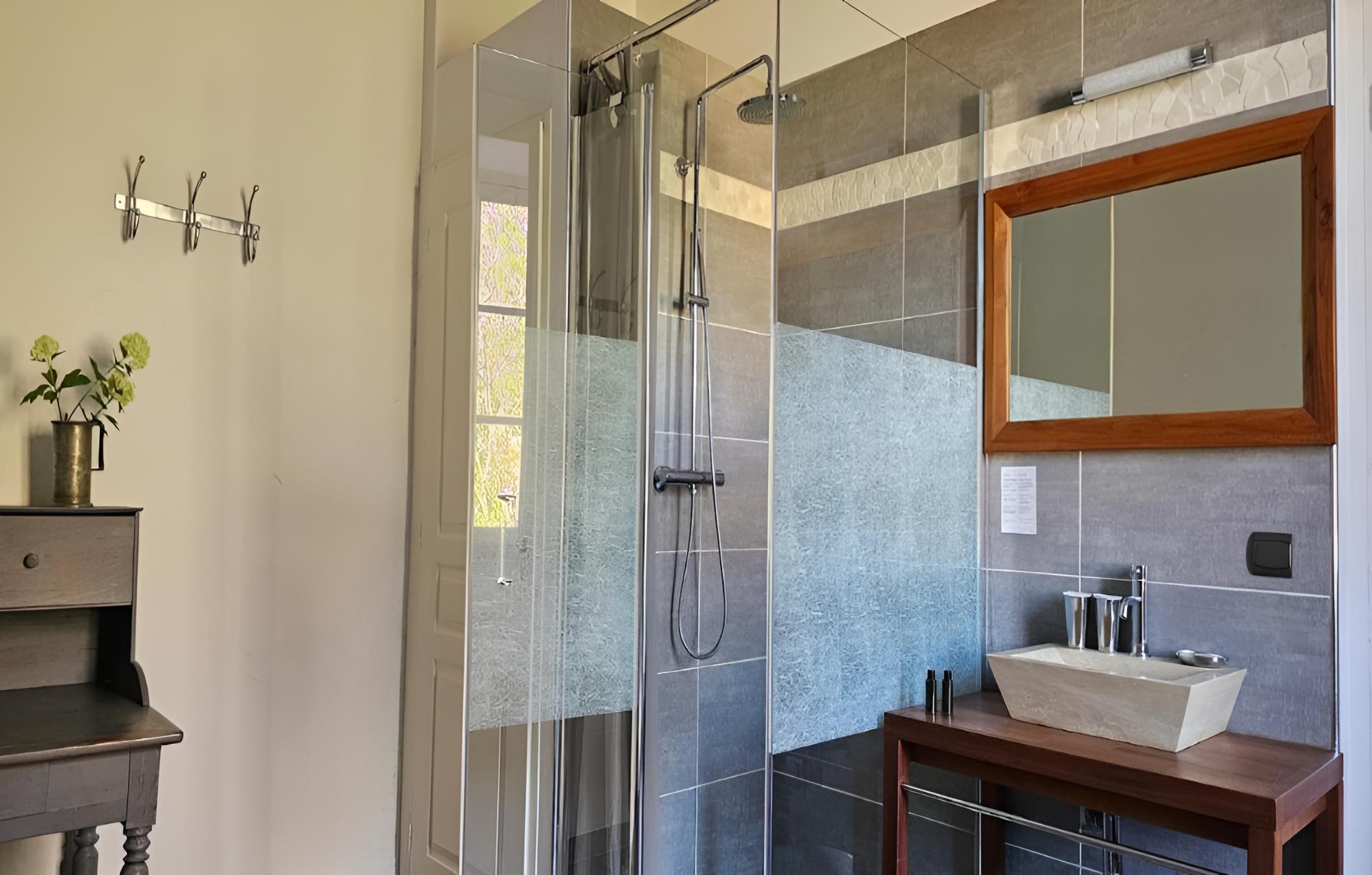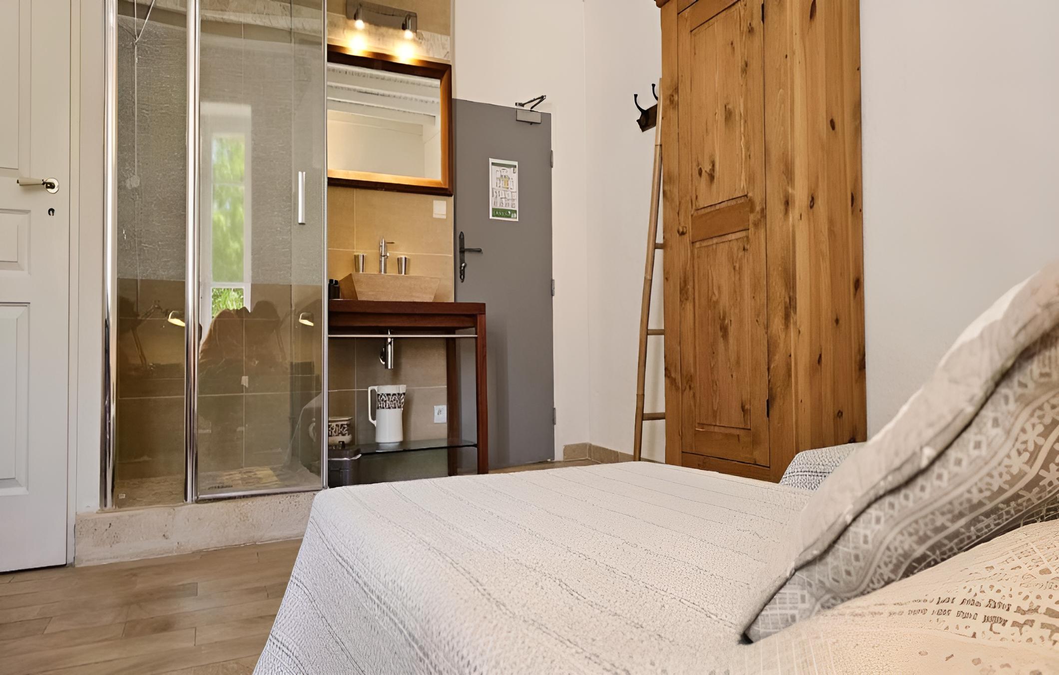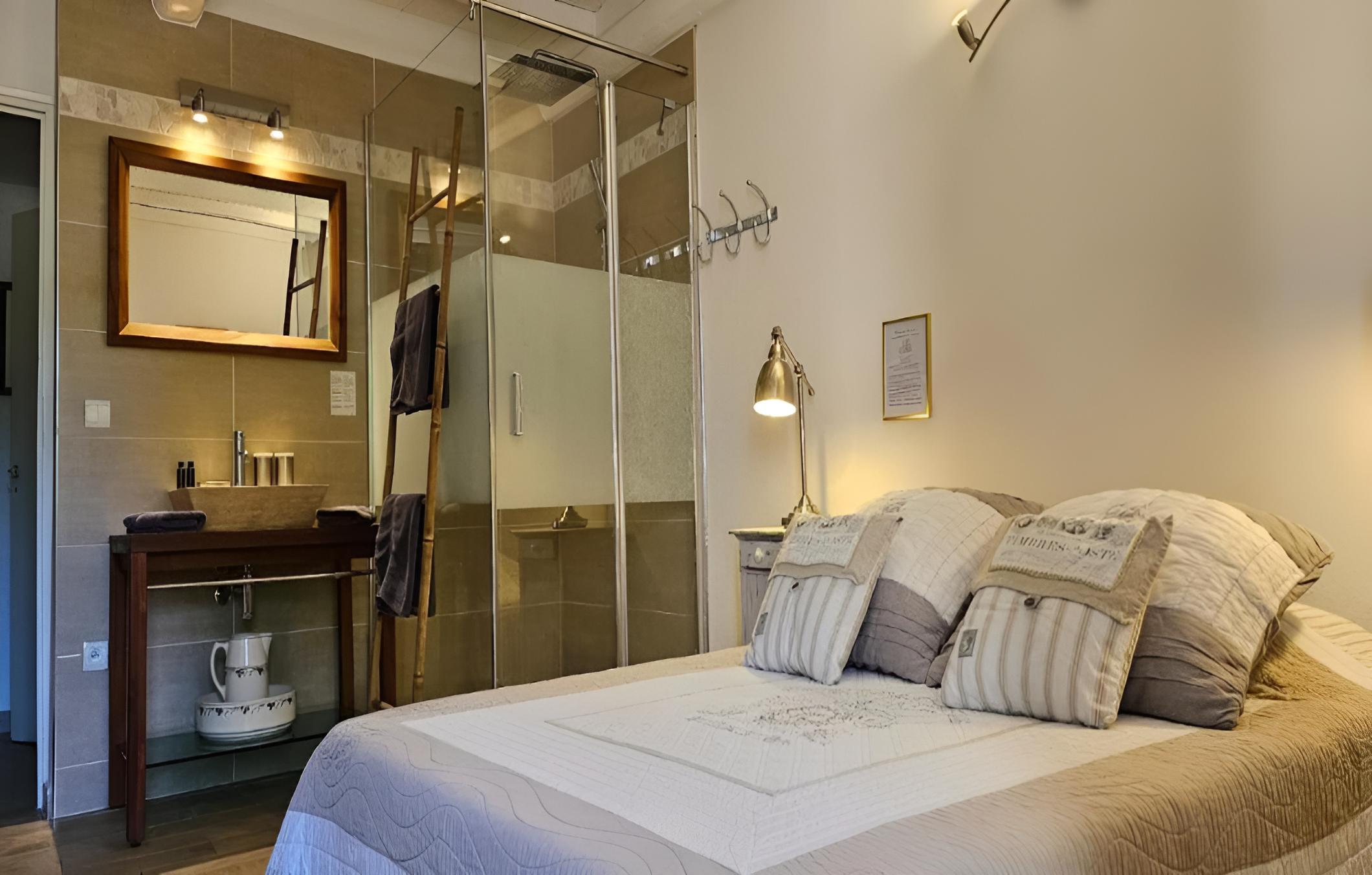 Indulge in picturesque countryside views from each guest room at Chez Rosette - Auberge de Lussan. The suite goes a step further with a spacious private terrace, perfect for unwinding in a serene setting. The modern en suite bathrooms with walk-in showers add a touch of luxury to your stay.