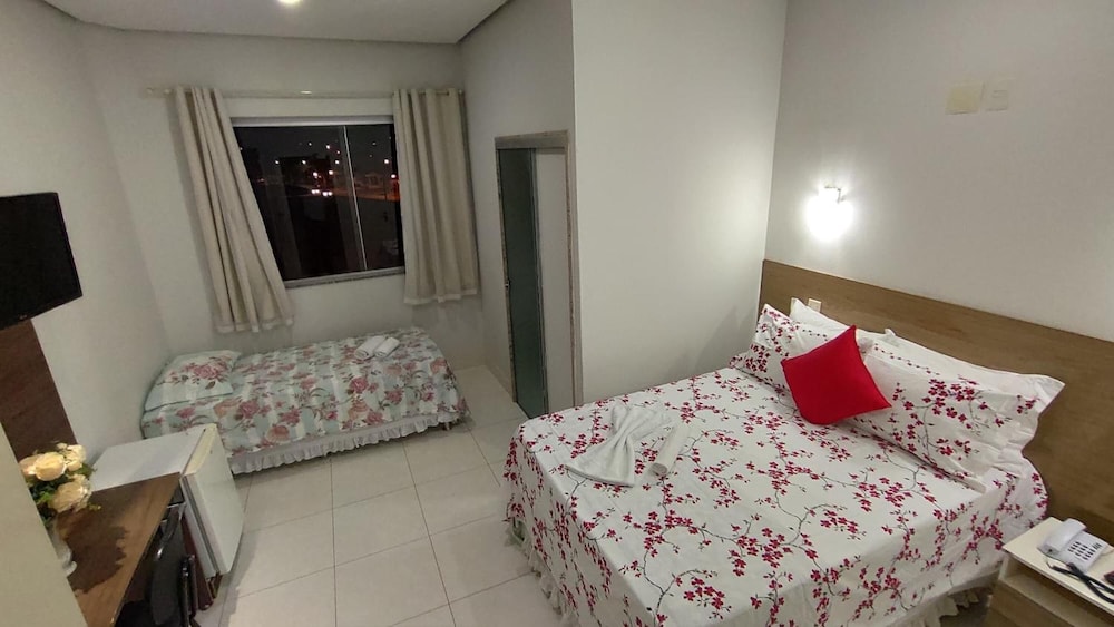 Hotel possui garagem, cama boa.