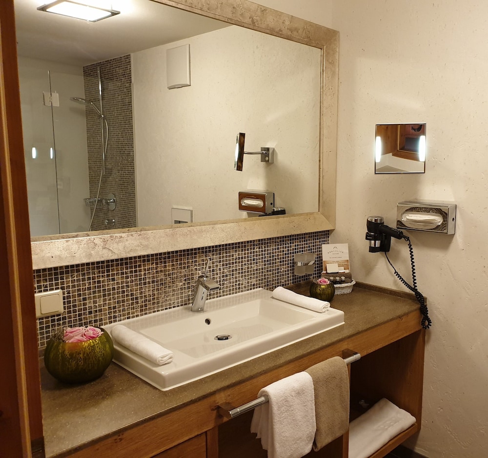 Sehr schön gelegenes Hotel mit sehr persönlicher Note. Geschmackvoll eingerichtet, ausgezeichneter aber unaufdringlicher Service, ausgezeichnete Küche-. Sehr schöner Wellnessbereich, allerdings ohne Schwimmbad. Das ruhig gelegene Hotel mit riesigem kostenlosen (so etwas geht also auch noch, halt dann ohne Gewinnmaximierungsinteressen und im Sinne der Gäste) Parkplatzangebot ist sehr zu empfehlen. Wir haben uns sehr wohl gefühlt und kommen wieder...