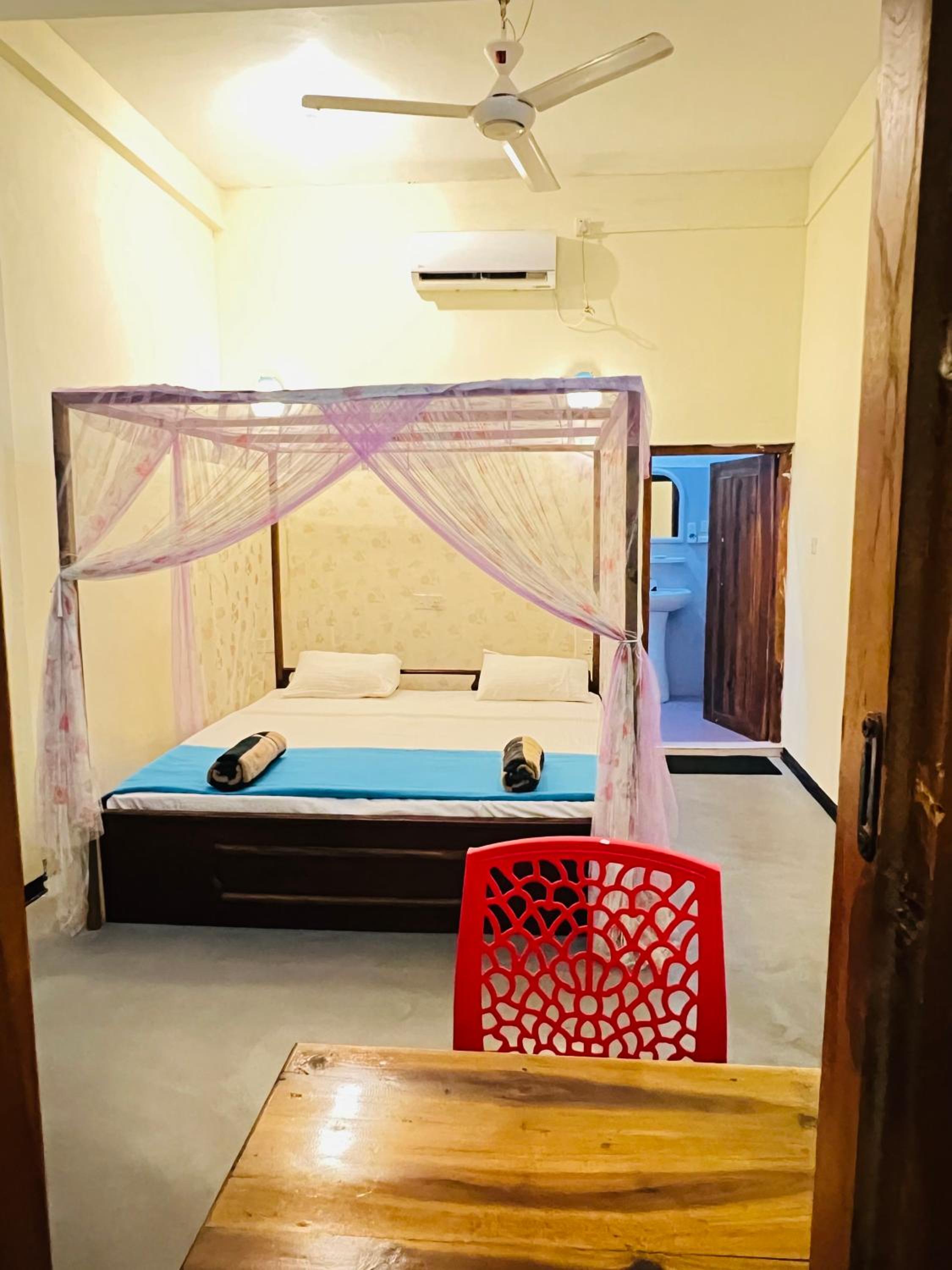 The room was quite dark, with only a small window that needed to be constantly covered by a curtain to prevent anyone from seeing inside from the courtyard. The relatively small room had a black floor, which did not create a good atmosphere and the plaster was peeling from the walls. Instead of proper bedside lamps, there was a harsh bright bulb on one side, while the other side had an equally strong green-tinted bulb, both were unpleasantly intense. There were no bedside tables, nor was there any wardrobe or shelf in the entire room. The bathroom walls were moldy, and there was a persistent, disgusting strong urine odor, with the ventilation not functioning! Several of the ceiling lights were burnt out. The entrance door could not be opened properly as it stuck to the floor and made a loud creaking noise. The ceiling fan was covered in thick rust and dust, so I didn't dare to turn it on, even when the A/C broke down.