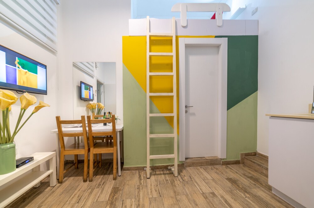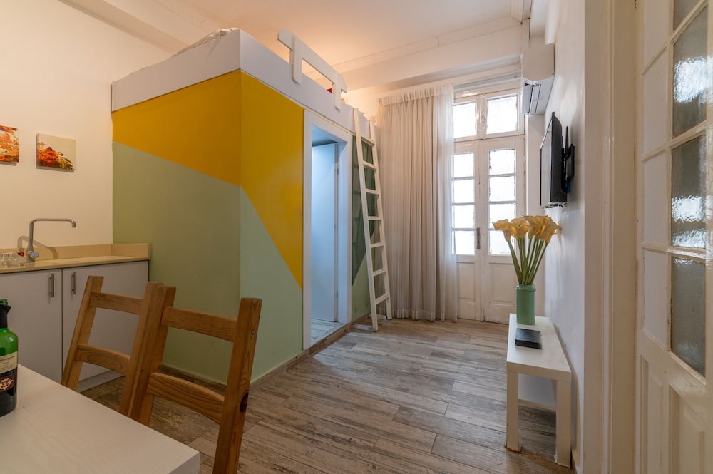 I found this to be a really excellent and good value option. The studio was smart with minimalist decor and made good use of space. The balcony and table offering some outdoor space was a very welcomed feature. The location was very central and convenient. Staff at check in were friendly and very helpful. True they the building housing the apartment was not the smartest, but it felt entirely safe and the studio itself was attractive. The bed being up a ladder and above the bathroom would not suit everyone- though I found it entirely comfortable. The pictures on the booking site are entirely accurate. Overall this was very good value for money and I had a great stay. Thank you!