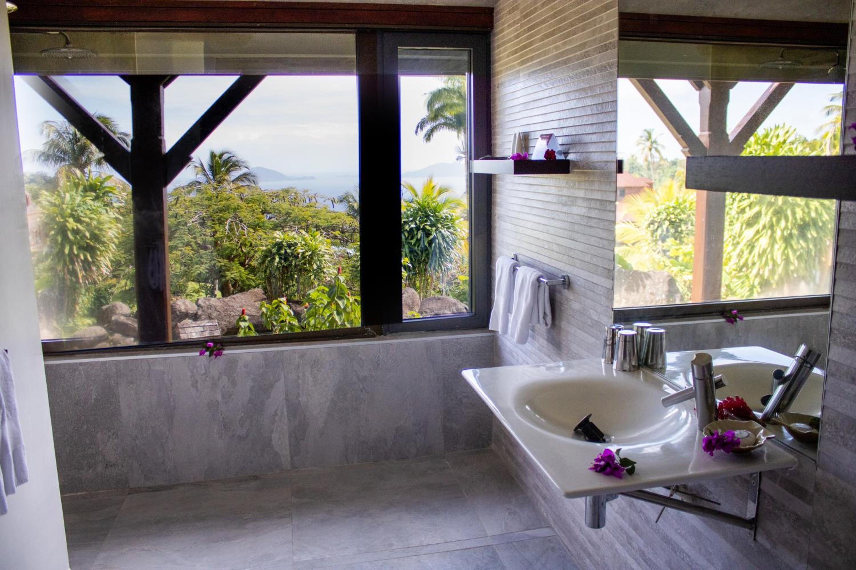 Tropical Paradise: Immerse yourself in the beauty of the Saintes Archipelago with sweeping views and lush tropical surroundings at Jardin Malanga Trois Rivieres.