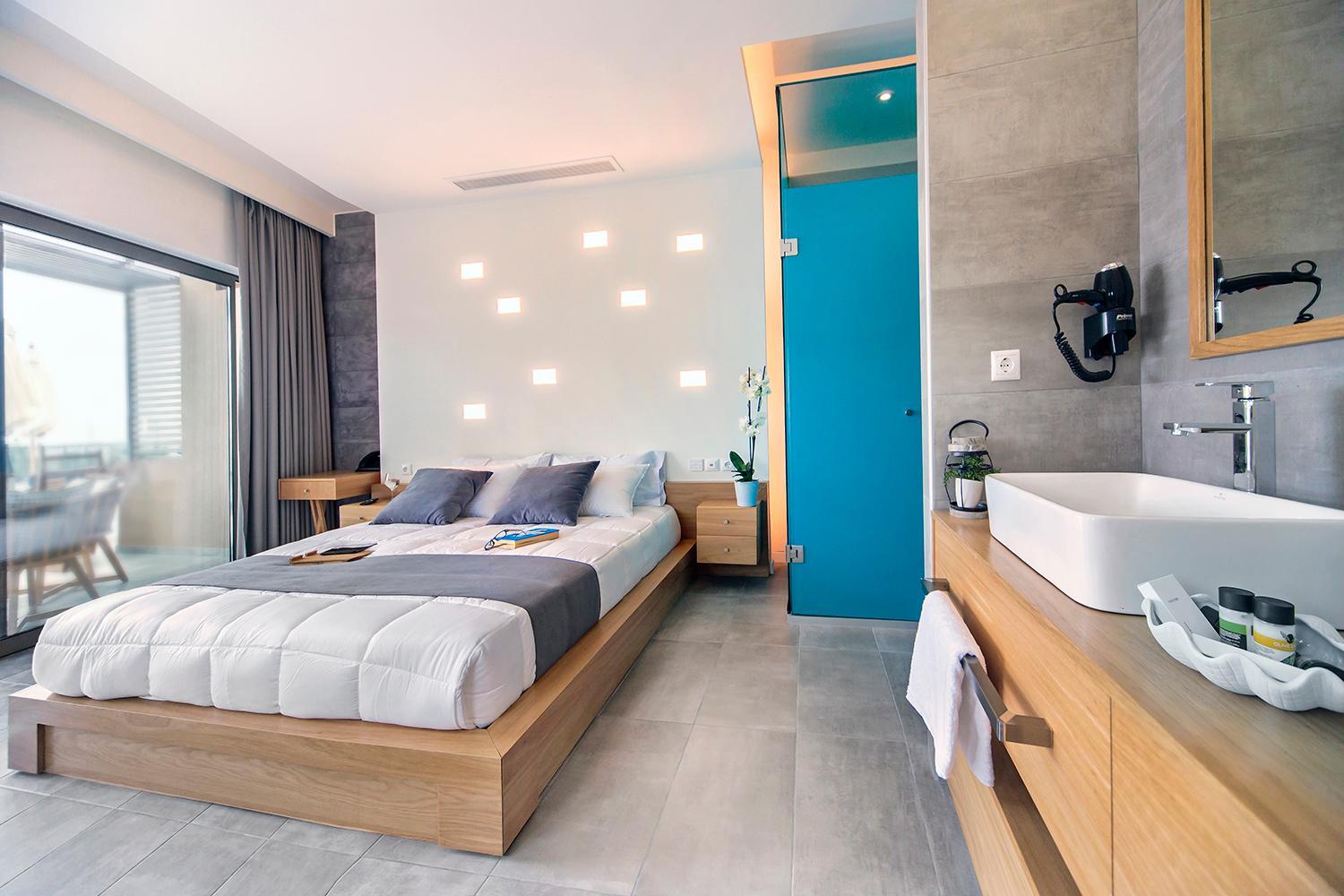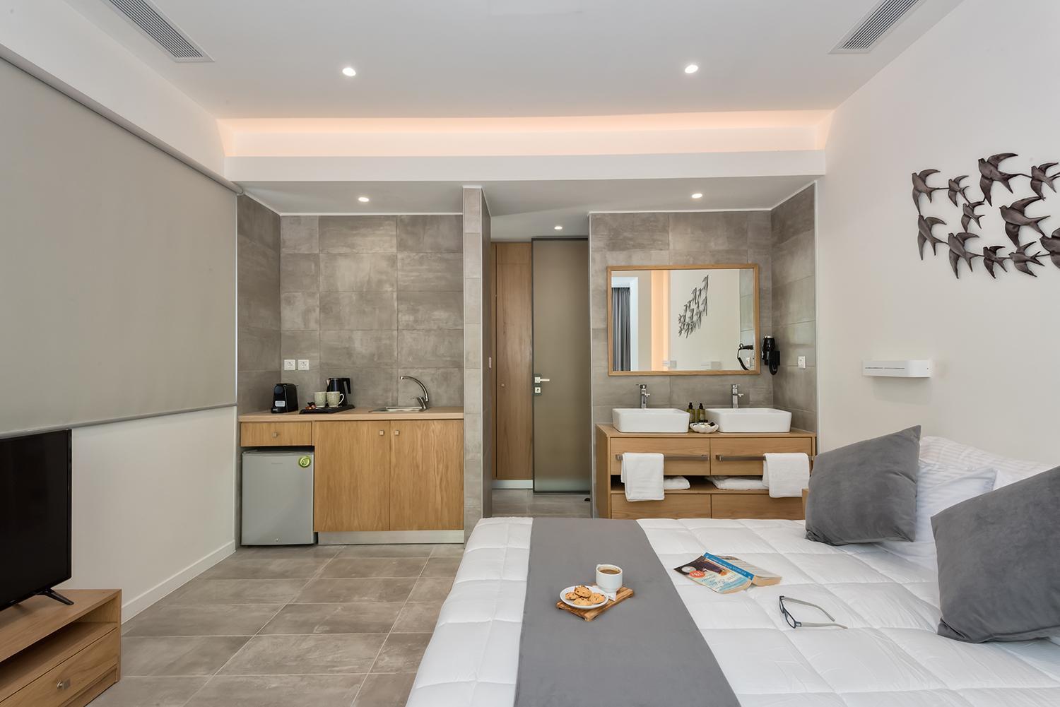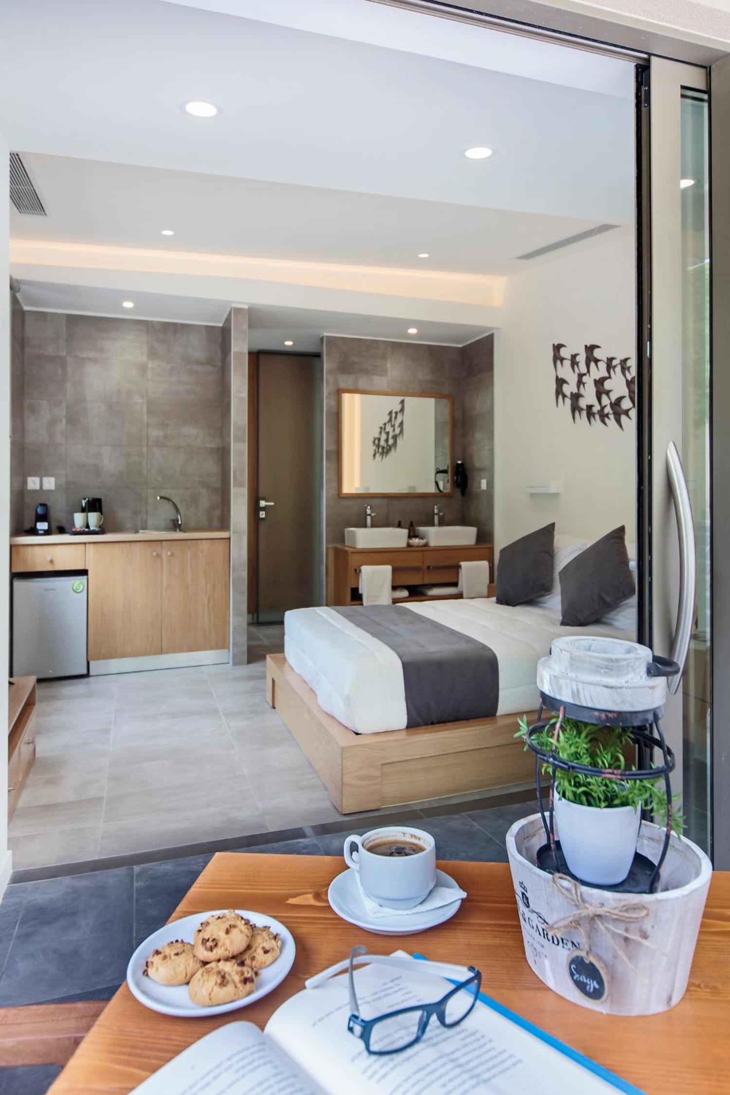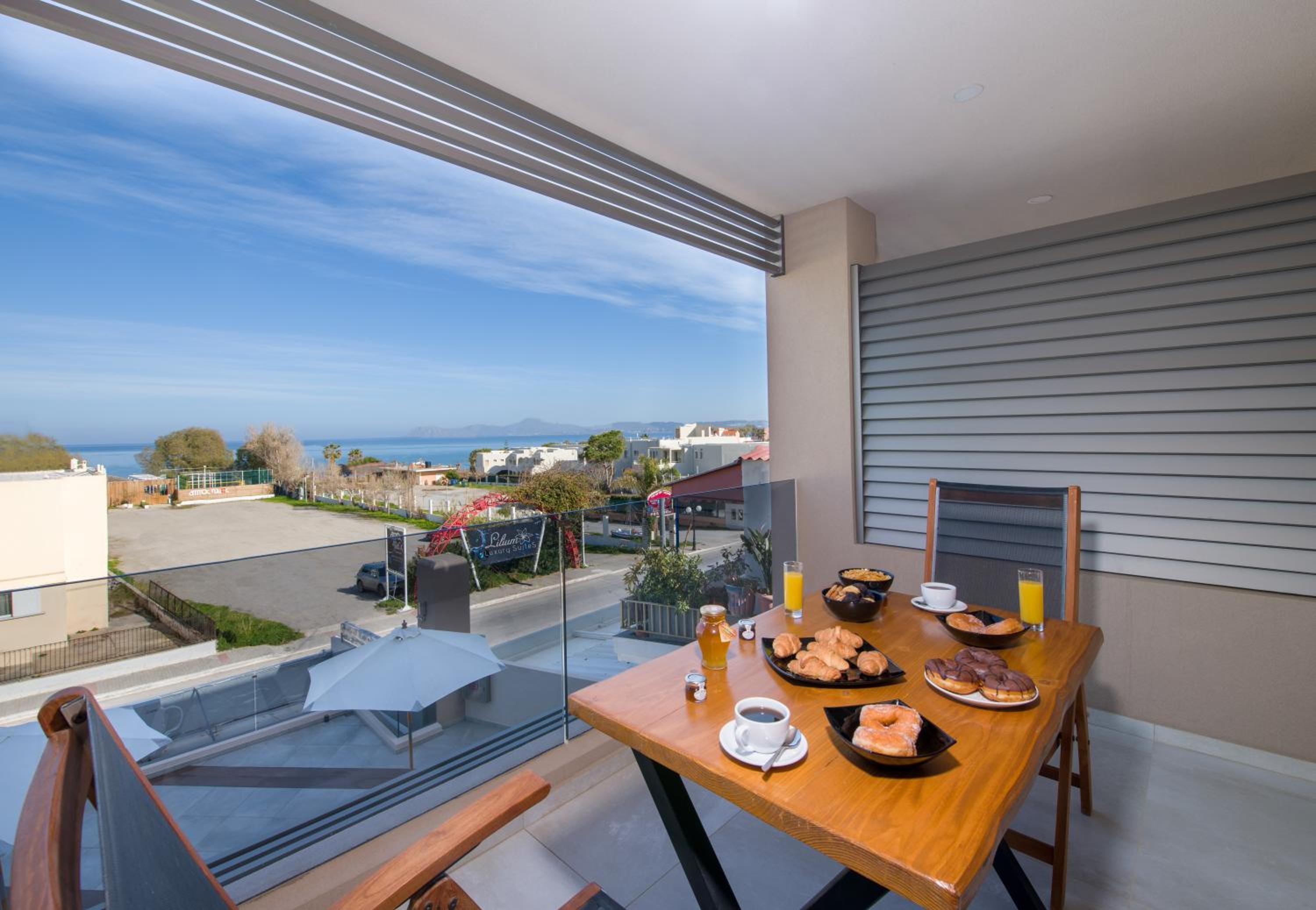 Indulge in the elegant air-conditioned rooms at Lilium Luxury Suites, complete with modern amenities like a coffee machine and flat-screen TV. Some rooms even offer breathtaking sea views from a private balcony.