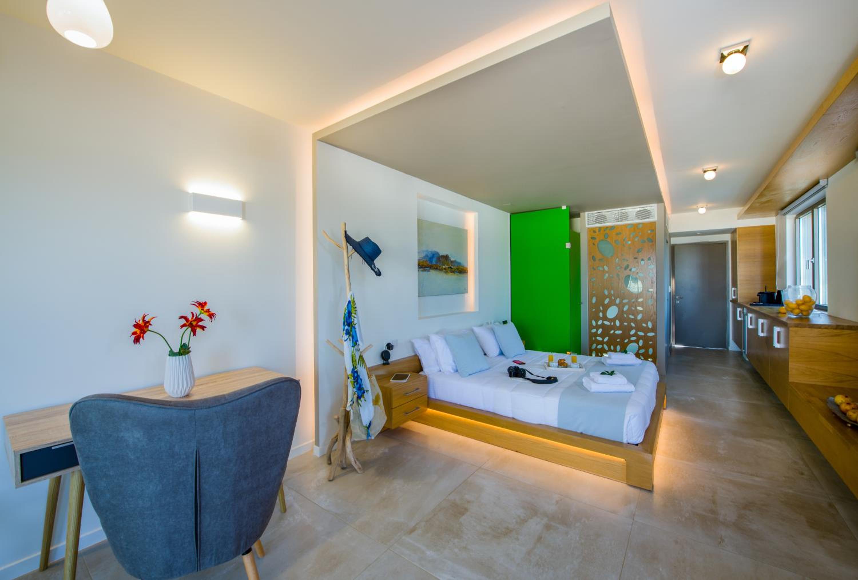 I was impressed with how modern the hotel is. You have a tablet next to your bed which controls all the lights and curtains! There are of course manual switches placed everywhere in the room. It’s perfectly planned out as the rooms are huge and enough wardrobe space. The staff is one of the friendliest I have ever met, very helpful with anything you may need from them. The location is amazing as well, the beach is not even 5minutes away, there is a supermarket below the suites (which have the prettiest magnets and souvenirs), and great restaurants are right next to it. The bed was extremely comfortable, and the AC is one of the fastest and strongest I’ve seen. It cooled off the big room in a minute. I was sad to leave this amazing place, would definitely recommend.