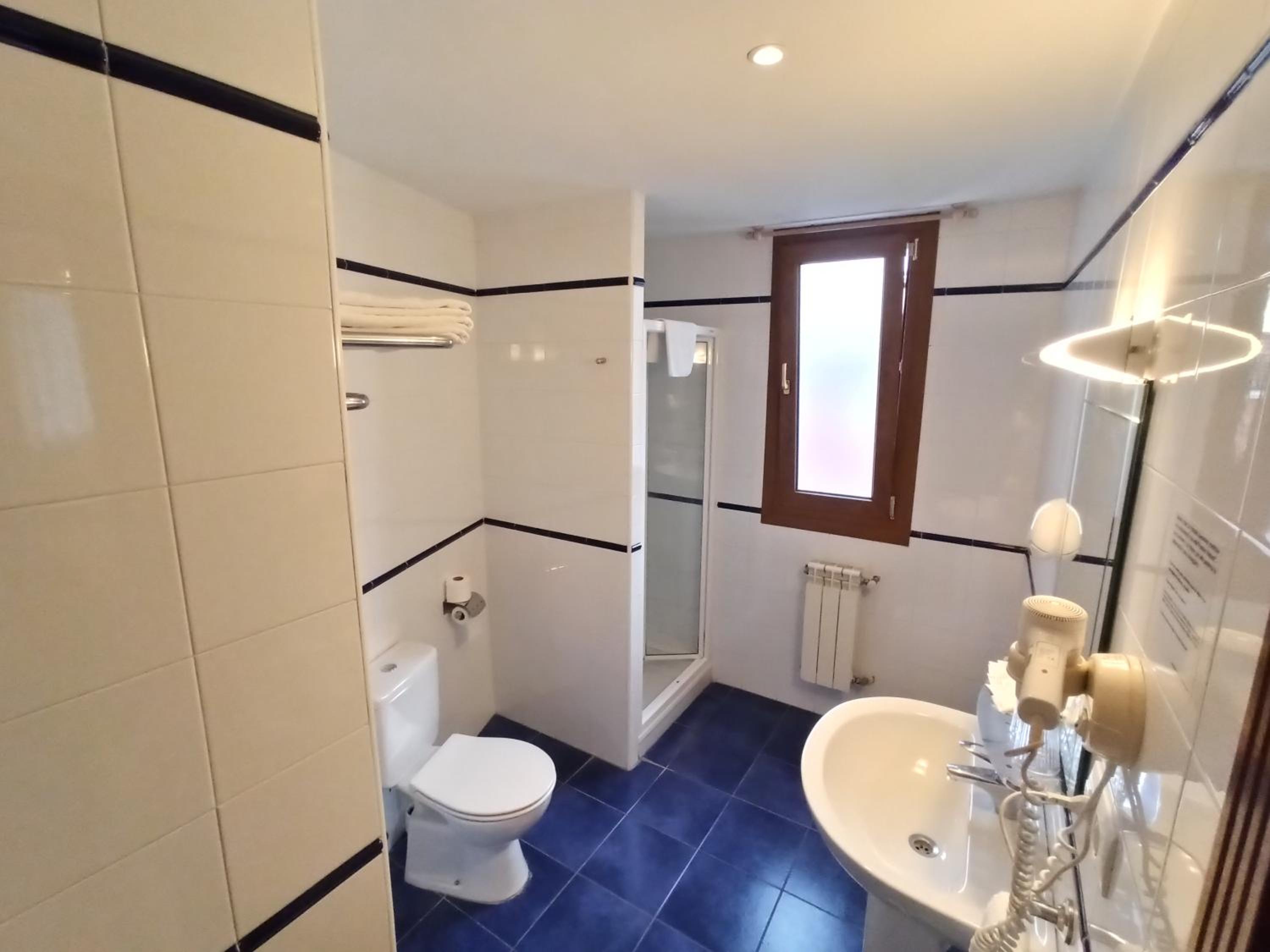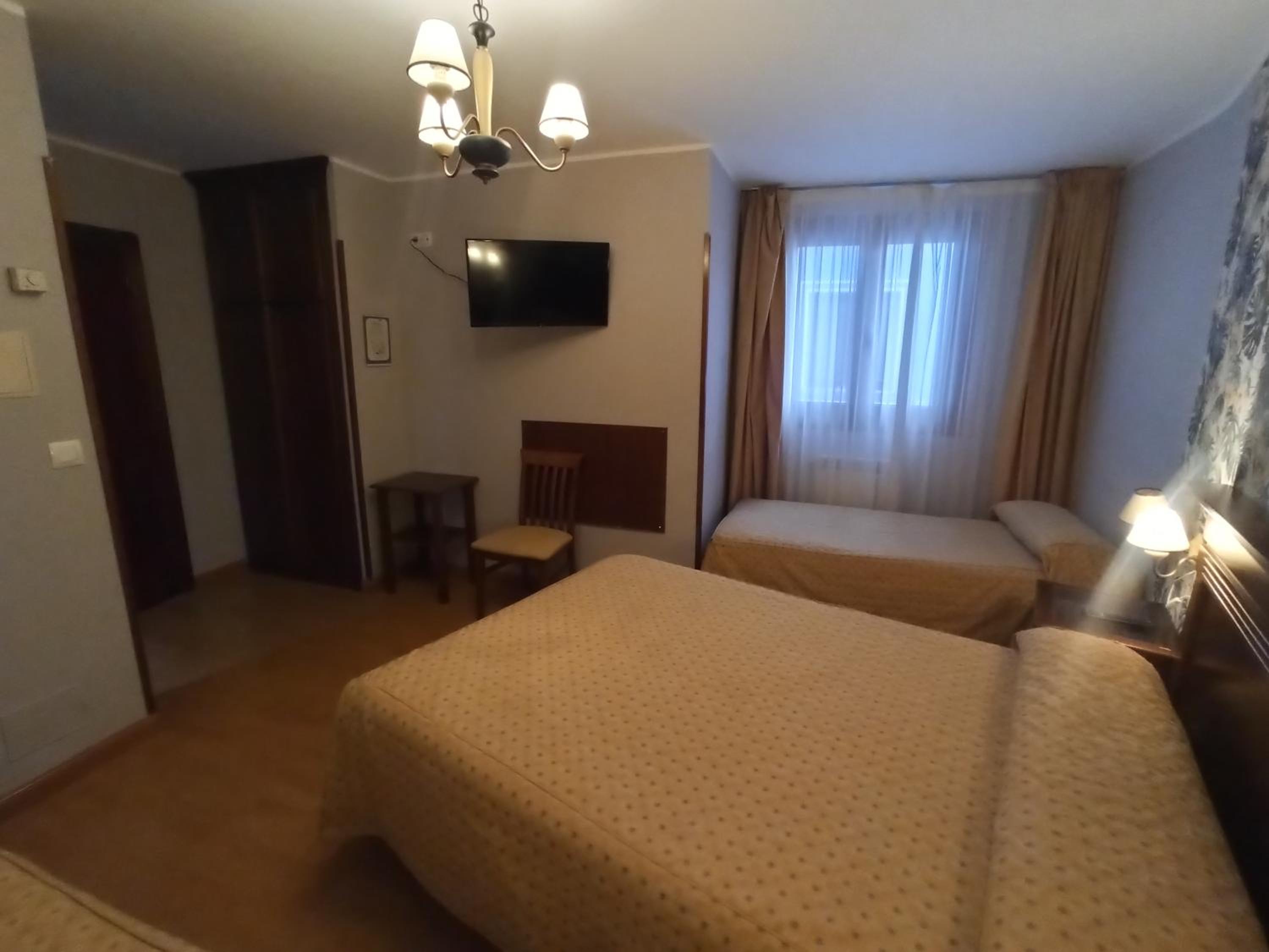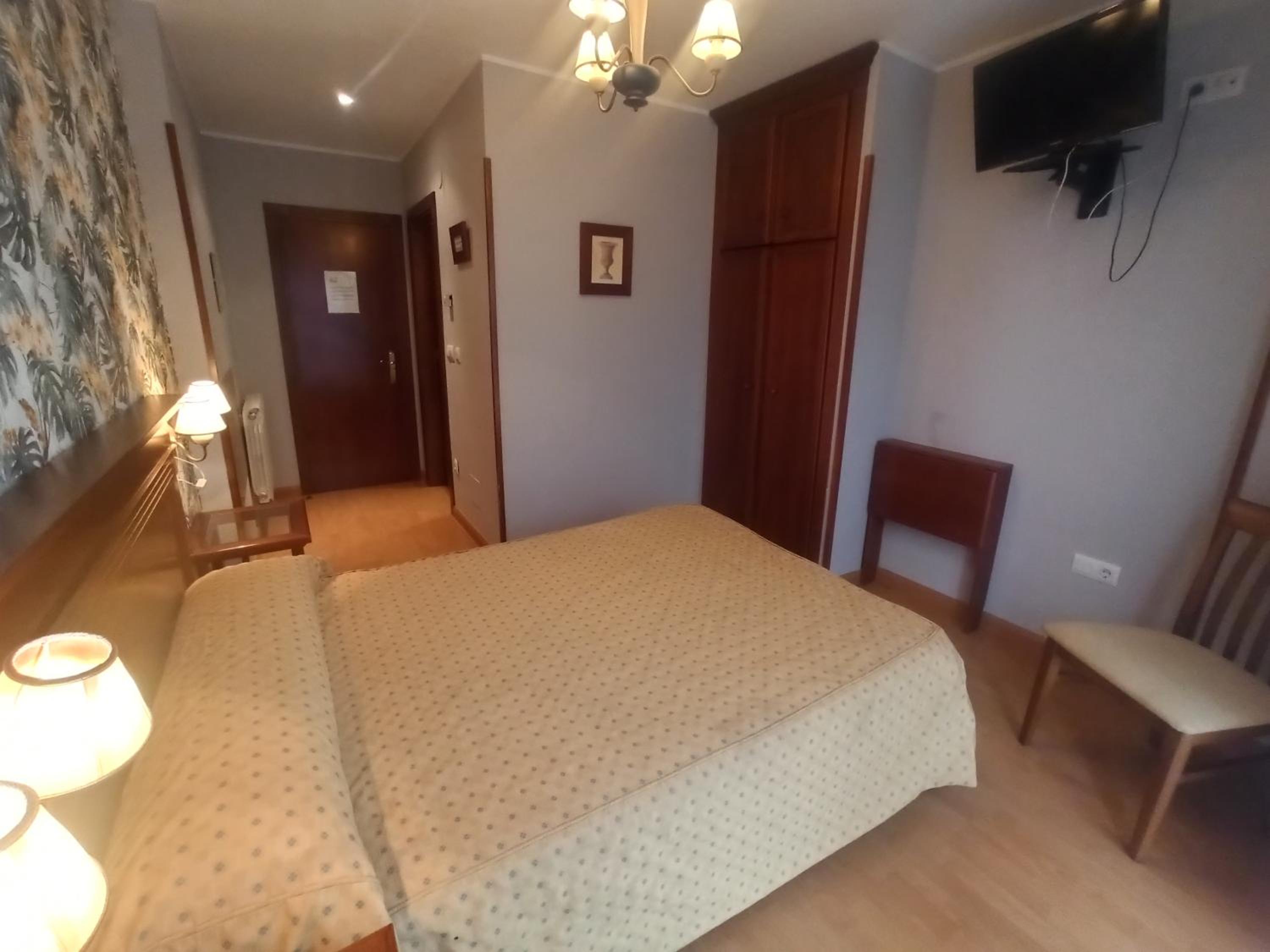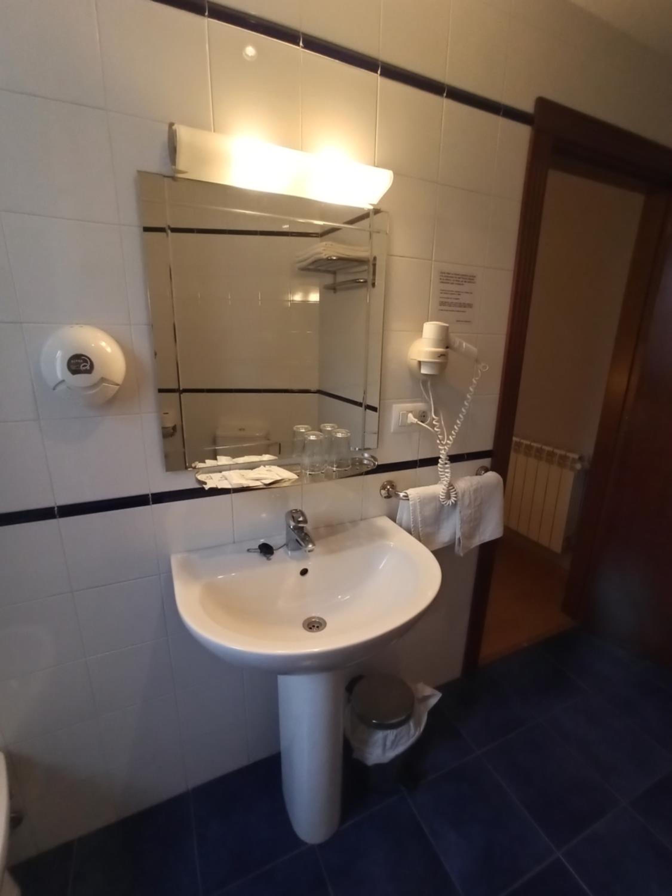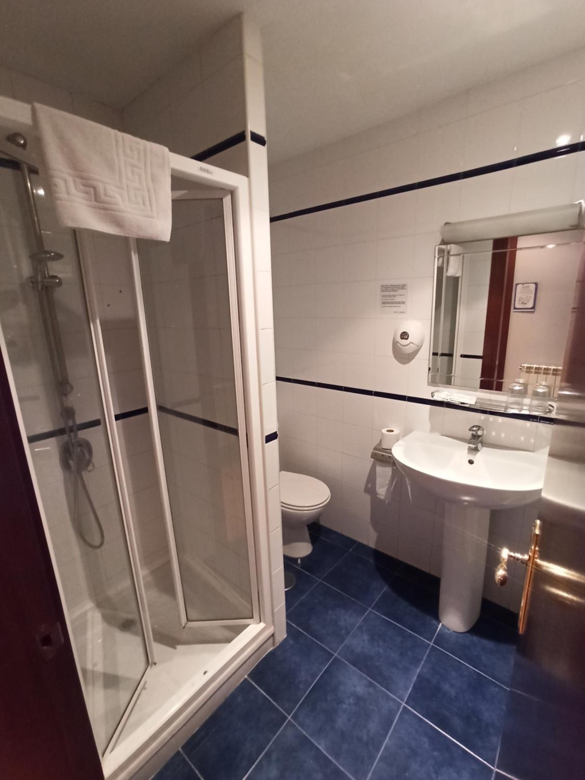 la habitación doble un poco pequeña y el baño minúsculo, excesivamente sobrio y un poco cutre, el hotel no tiene nada más que las habitaciones y una recepción con un sofá y un televisor. Me resultó un poco caro para lo que ofrece, pero para pernoctar tampoco hace falta más
