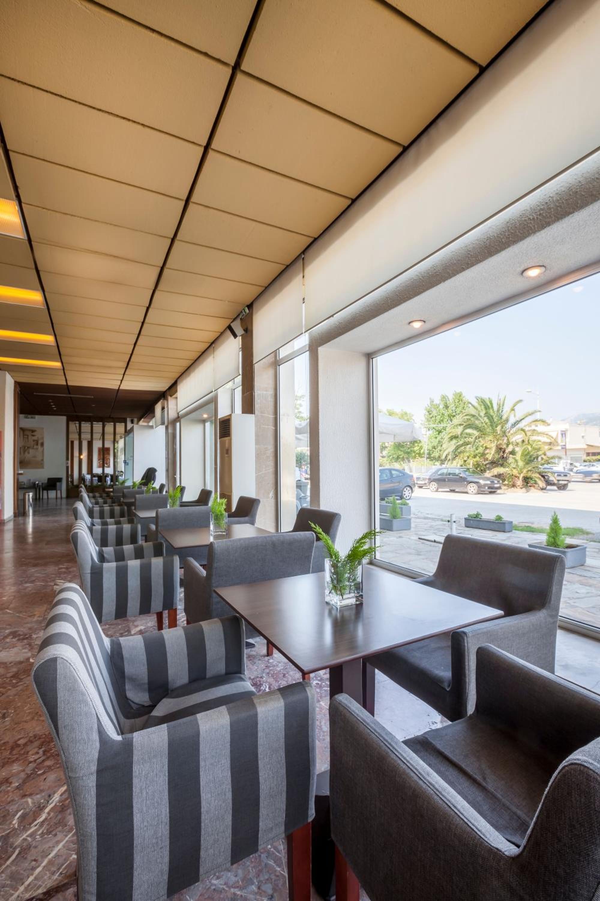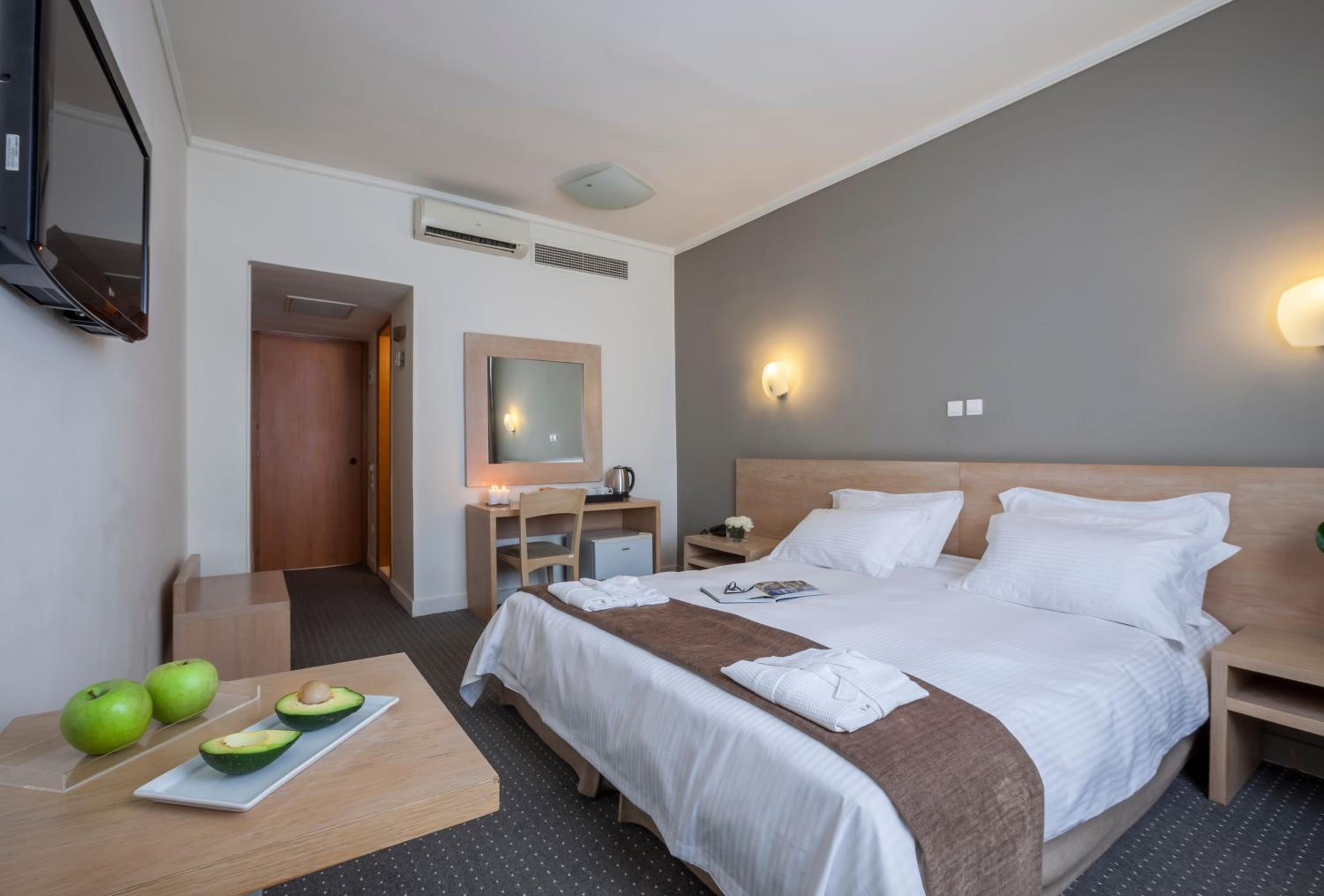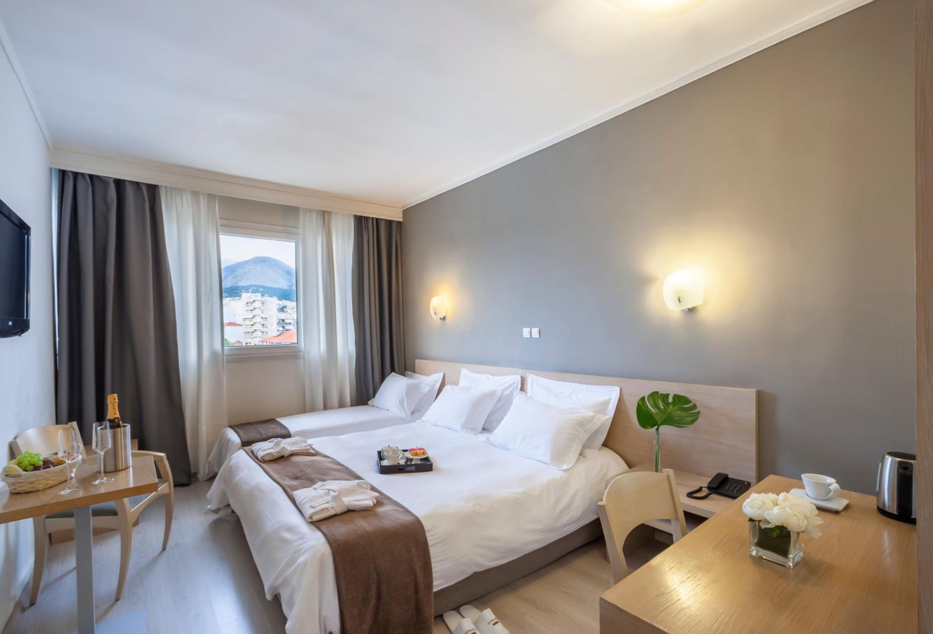 Hotel Nestos offers modern and comfortable rooms with spacious layouts and large windows that fill the rooms with natural light.