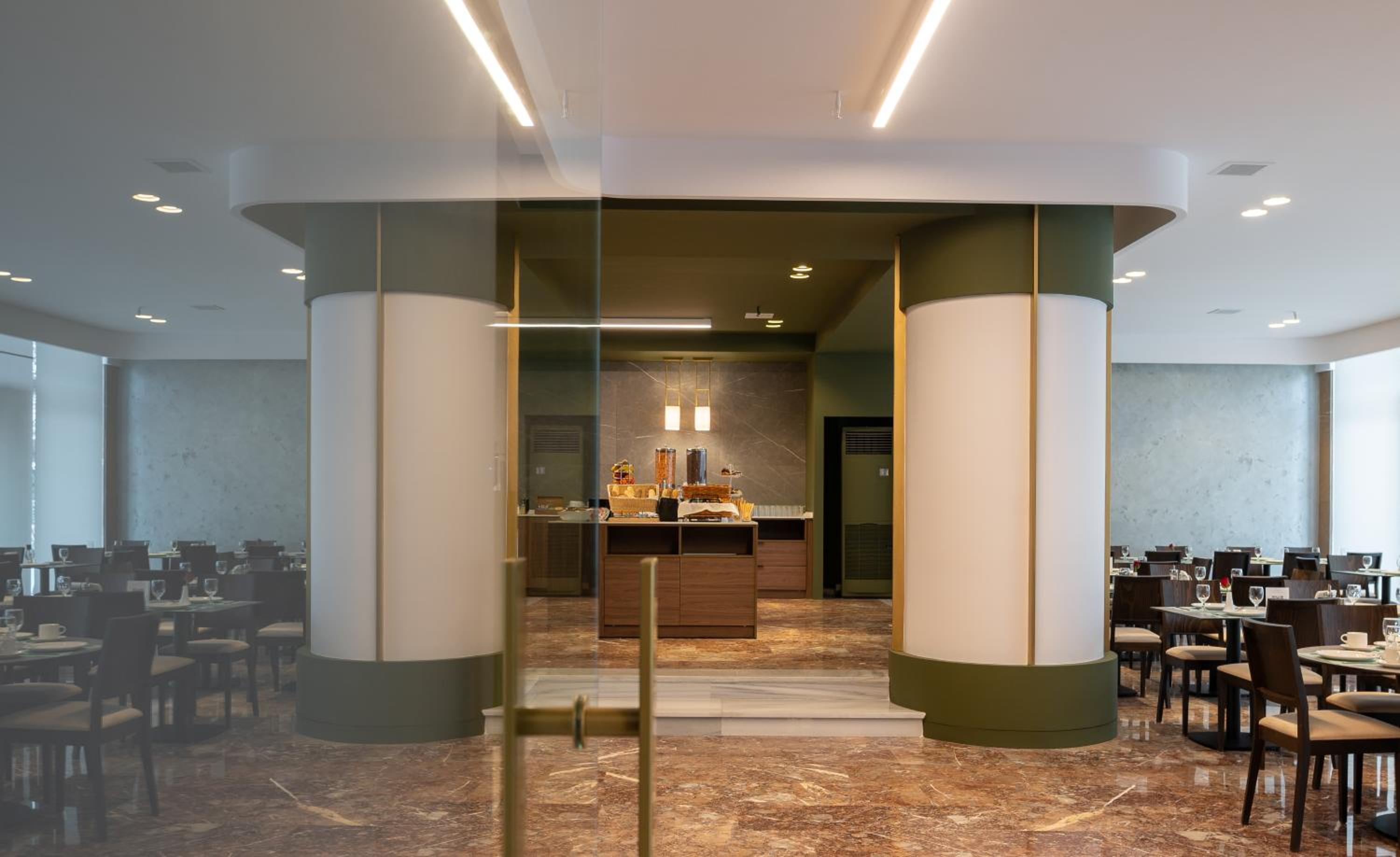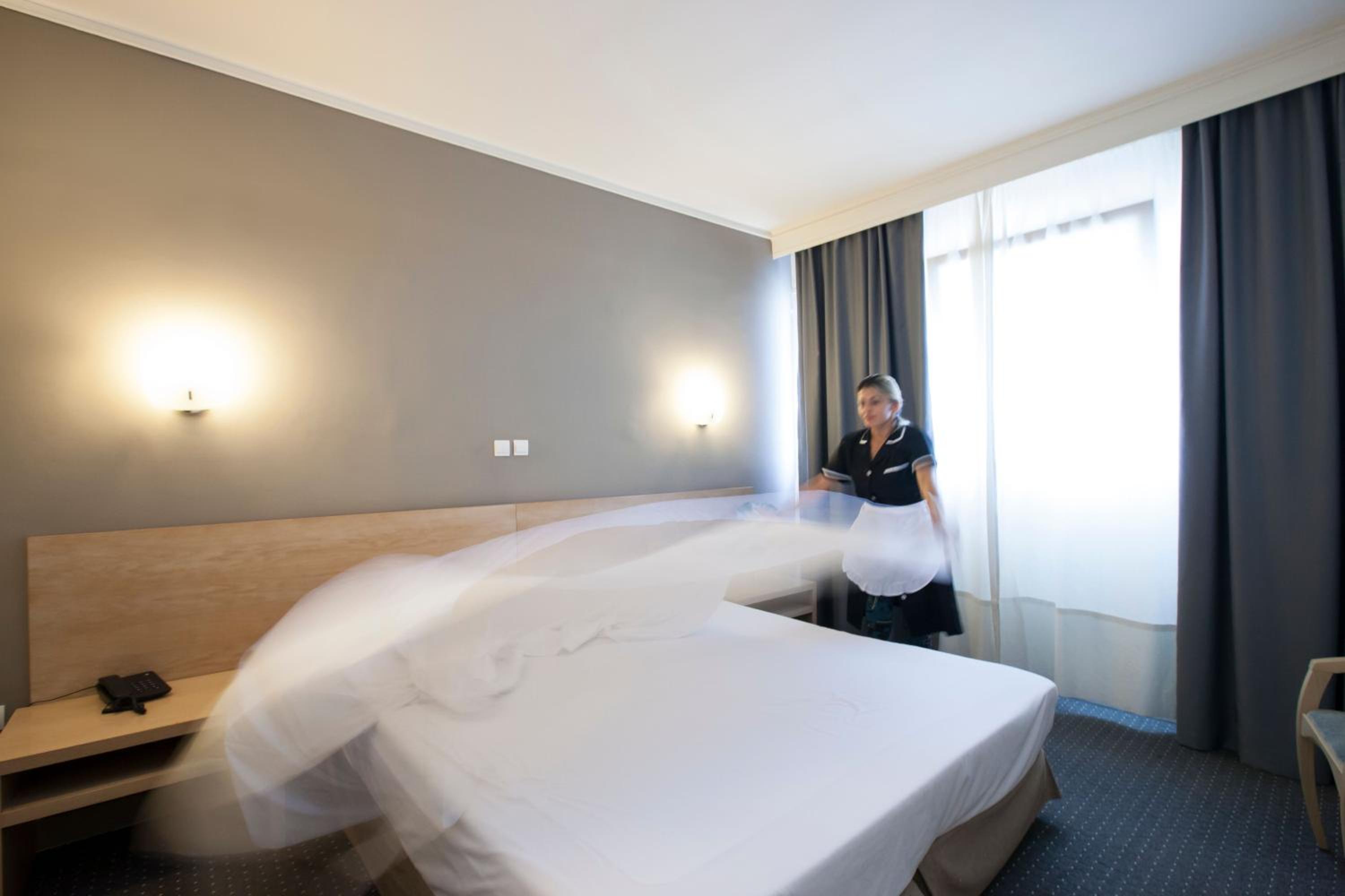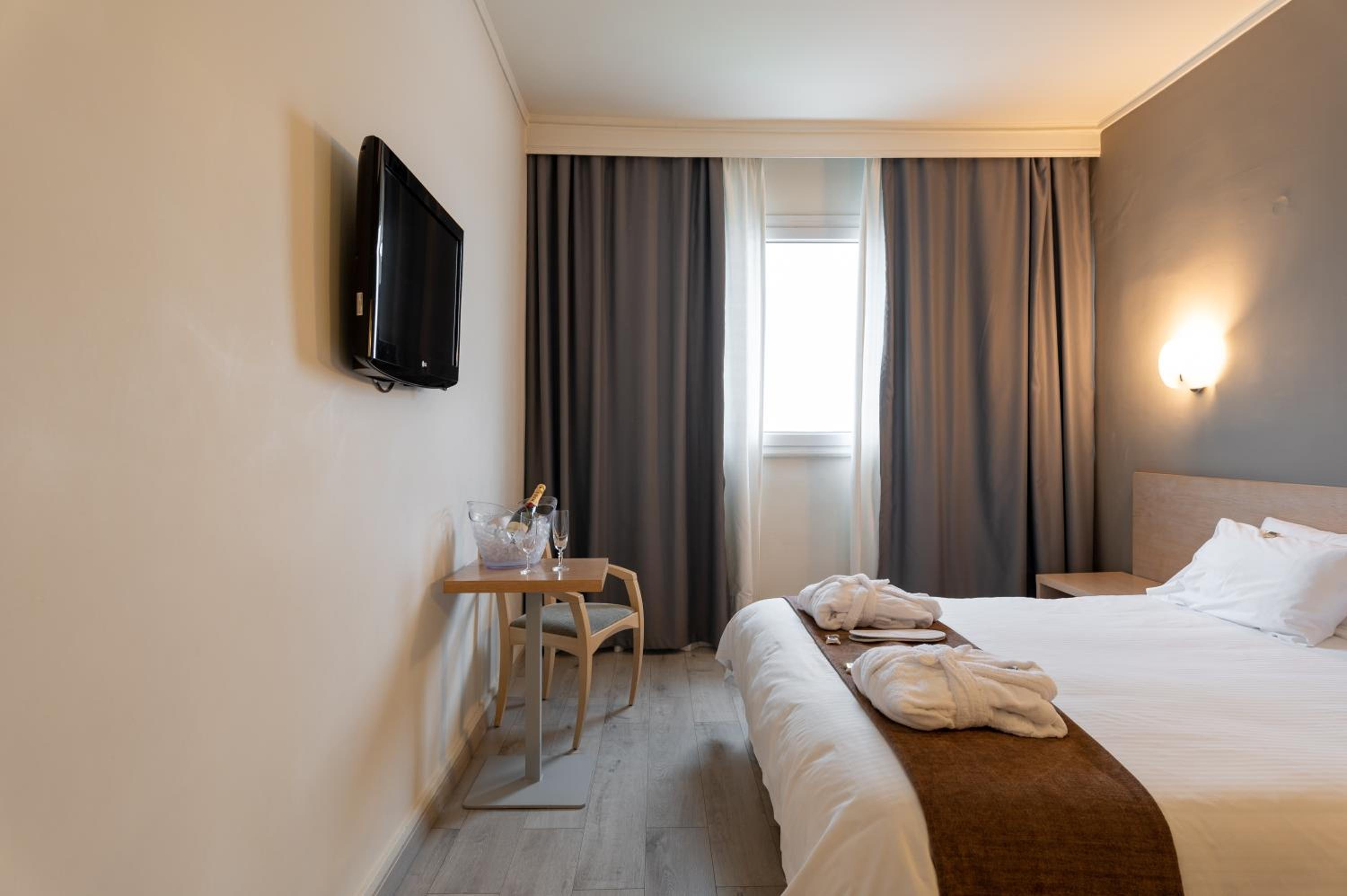 Hotel Nestos offers modern and comfortable rooms with spacious layouts and large windows that fill the rooms with natural light.