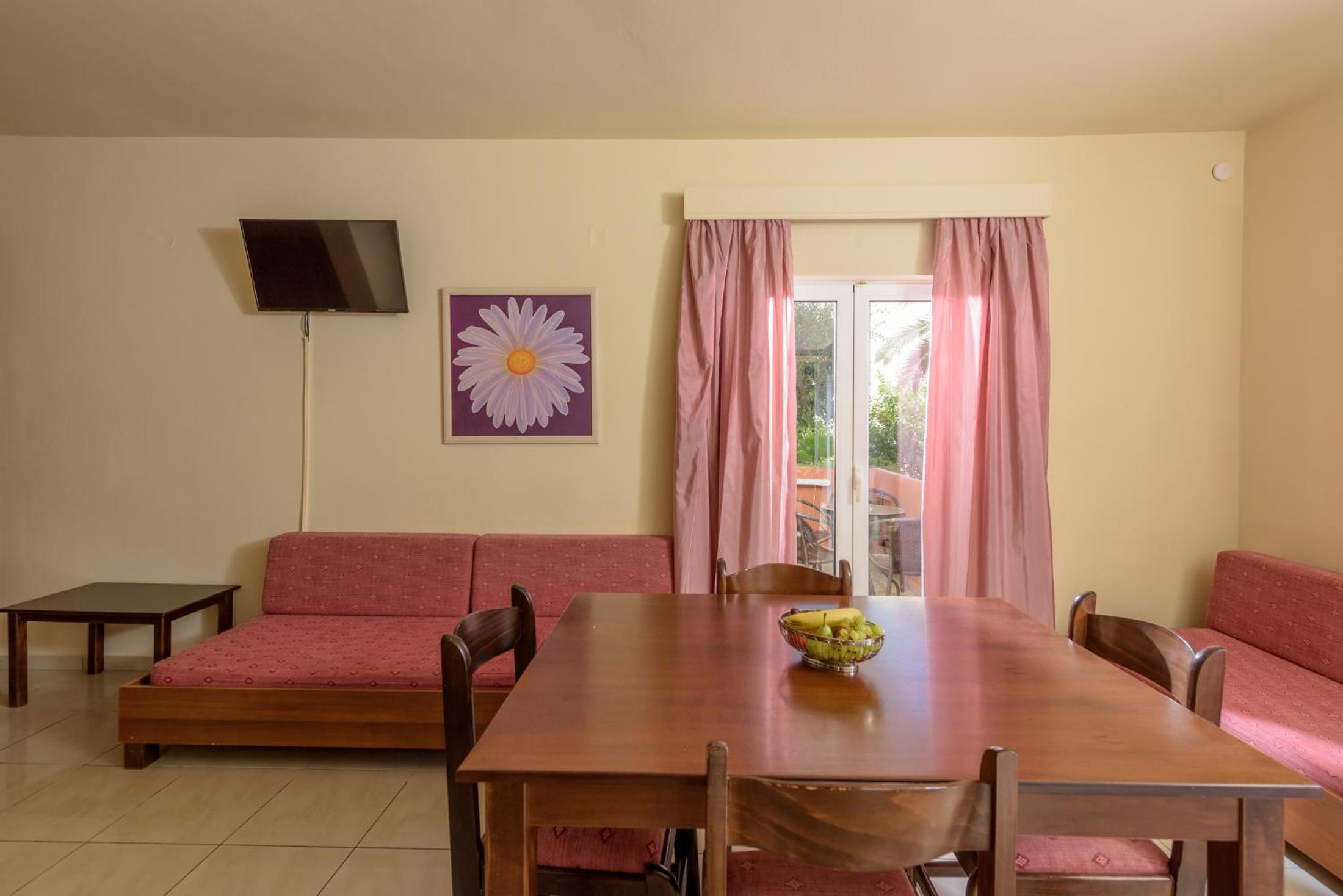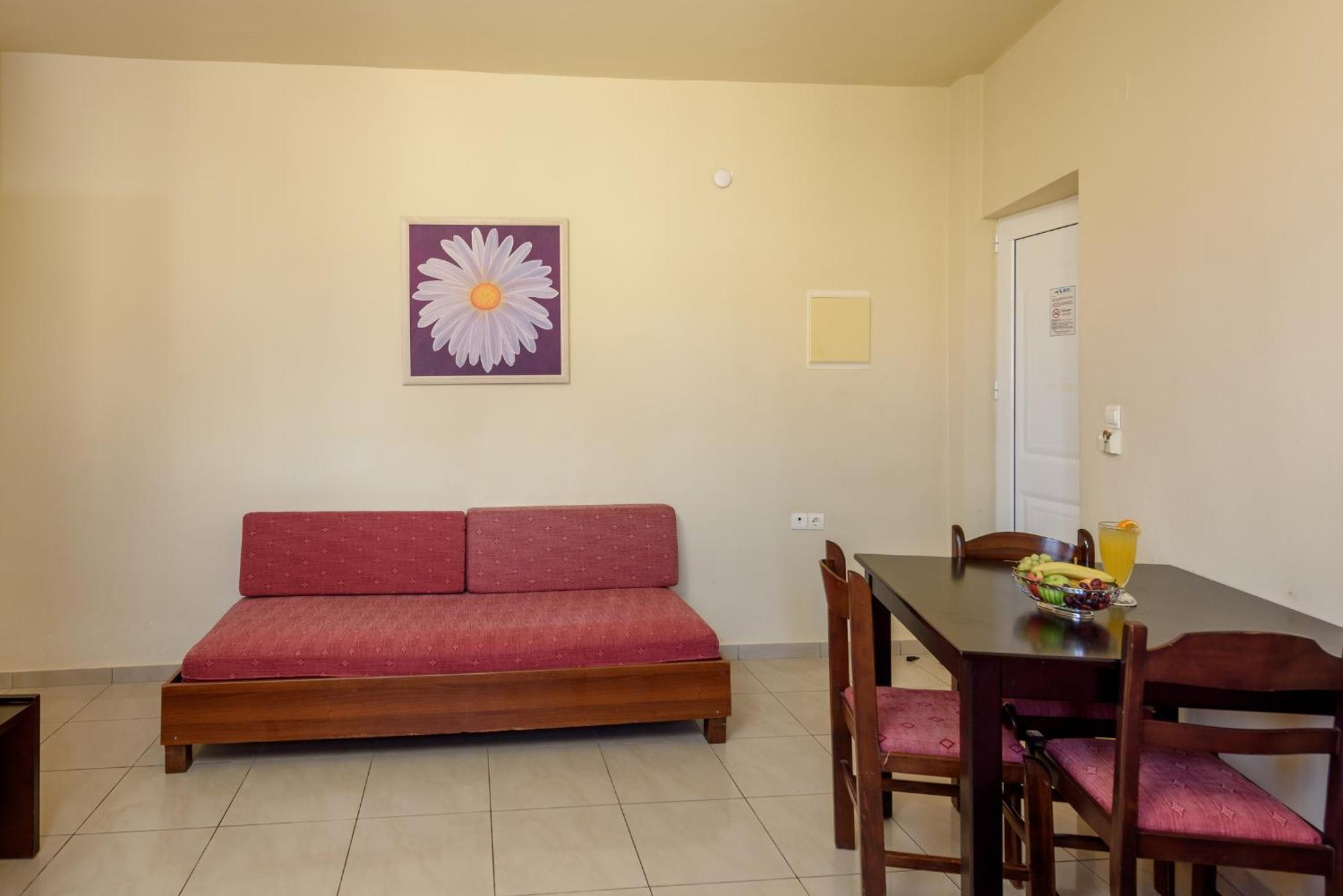 4 stars but should be 5. The hotel is in a great area. Only 2 minutes away from the sandy beach and bus stop taking you to Chania and another tourist excursion called The little fun train which I really recommend. Again 2 minutes to get to the main road where there are shops,bars and restaurants. The staff are incredible, especially Elli and Manousos. Both are incredibly kind and welcoming and just stood out. Everyone is happy to see you and has a smile on their face. The food is spectacular ( I was pleasantly surprised by the varied salad options and combinations you'd never think were good but were delicious!) selection may not be huge but it is fantastic , not something you would expect at a hotel buffet but more a high end restaurant . We were at Room 106 which was very spacious , clean and tidy and had everything you need ! ( a fridge, freezer, hob, kettle, coffee machine, cutlery). Swimming pool is a good size , beautiful garden and lovely view around. Honestly I highly recommend!