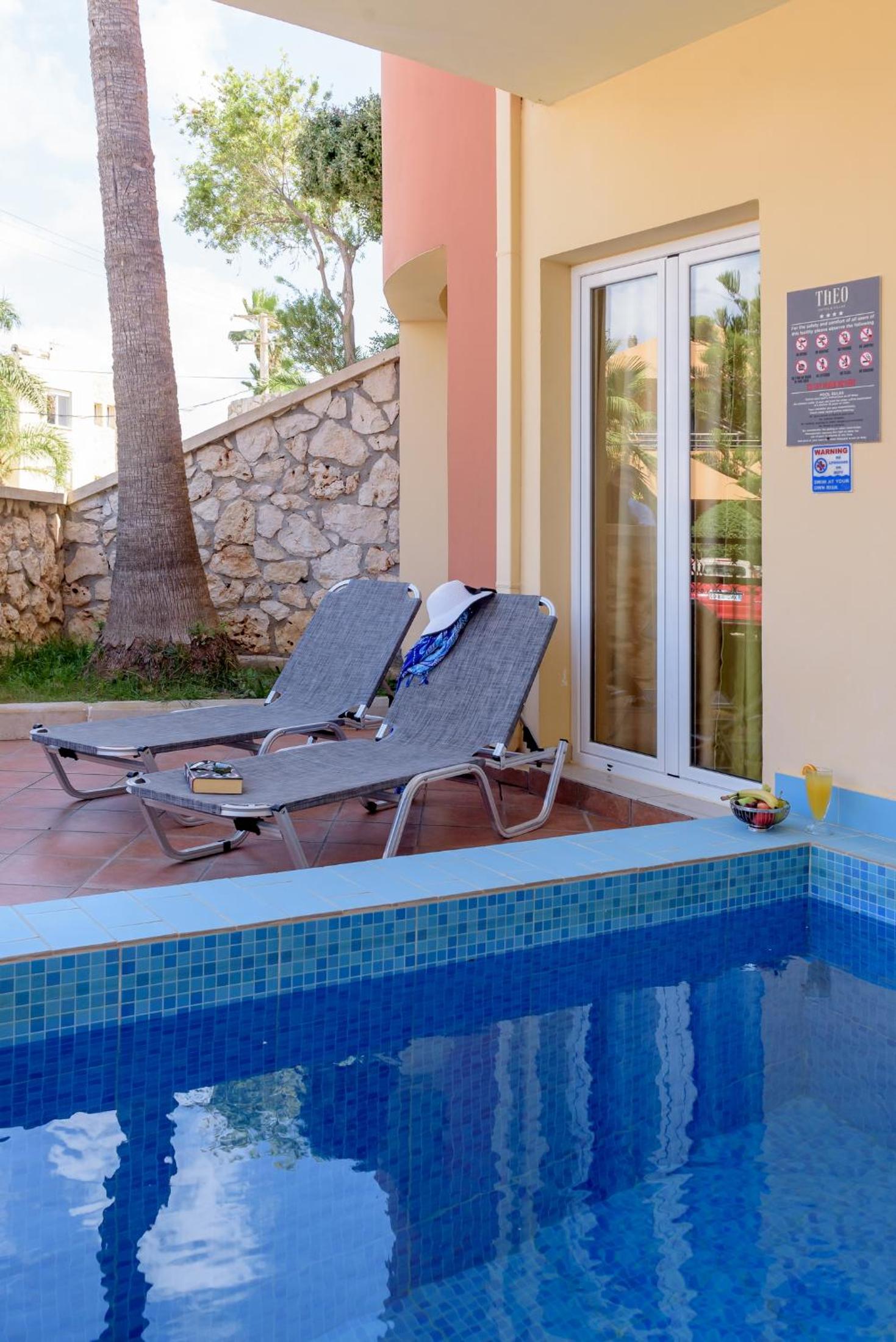 As good as it gets for every reason you can think of. This was our second year in a row as a family visiting Theo hotel and we have never been back to the same place more than once until now. The staff are excellent and polite always happy to see you and help with anything. The rooms were very clean and tidy with excellent views all round. Location is a big part of why we went back as it’s close enough to the beach and bars and restaurants but far enough away to enjoy the peace and quiet. The food is top notch and a great breakfast everyday full of choice for everyone. The beer and cocktails are tremendous and brought to you by the pool 😃. We hired a car for the week with plenty of space to park right outside the apartment.