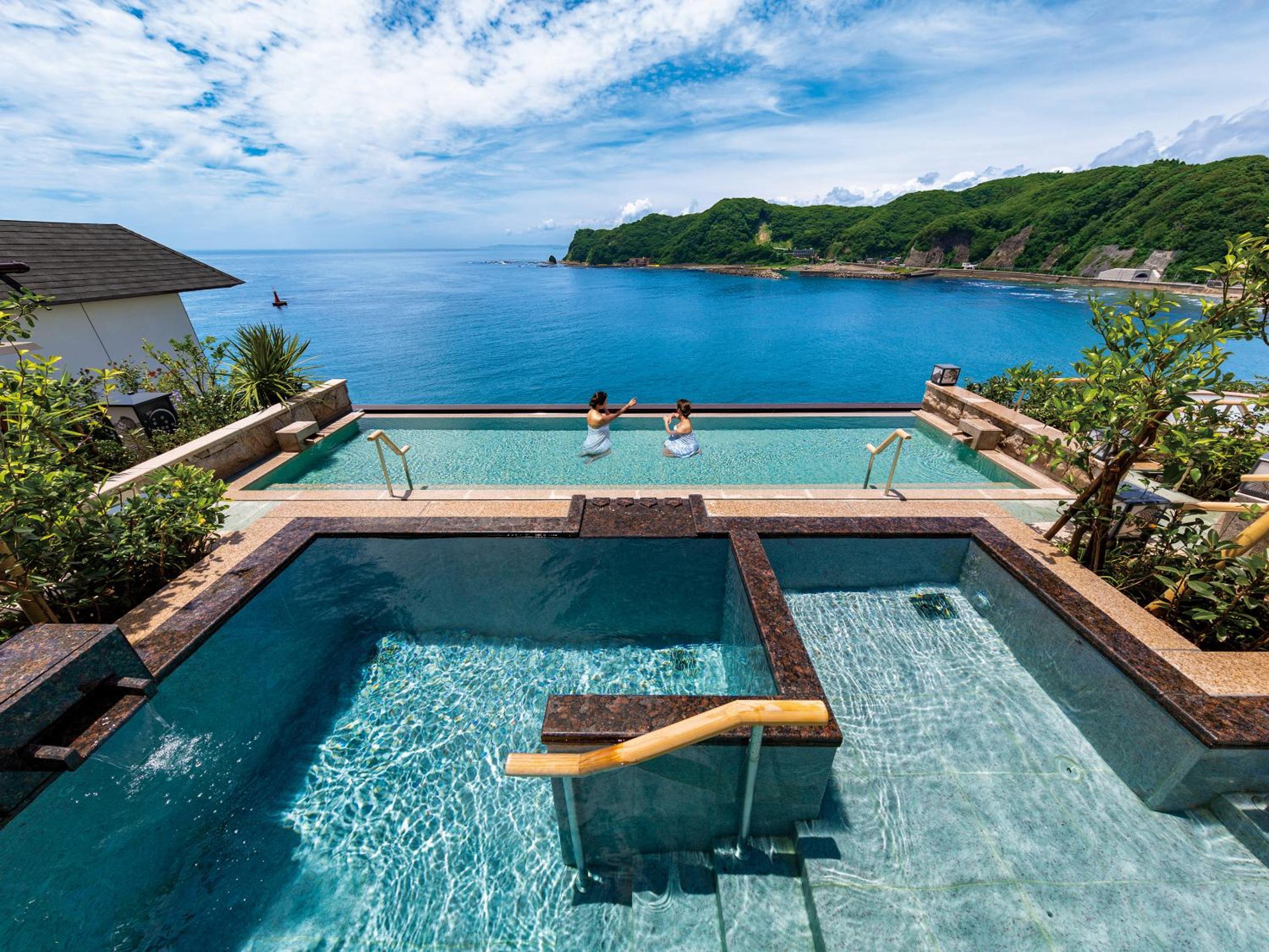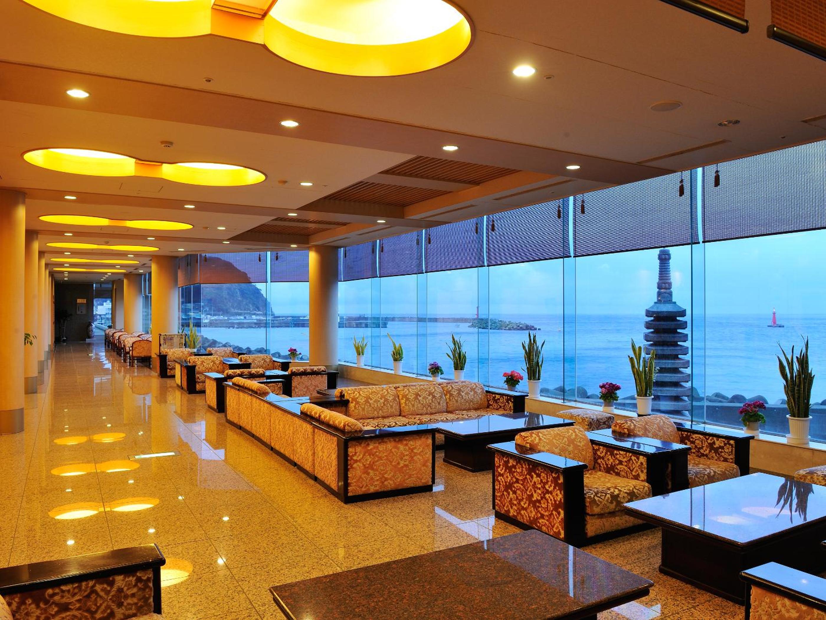海が眼下に広がっていて綺麗で静か。温泉は一里千望の湯が想像以上に良かったし、お風呂の後のマッサージチェアも無料で気持ちいい。お食事は家族がそれぞれ好きなものを好きなだけ食べられて、特にお刺身とステーキが美味しかったです!
