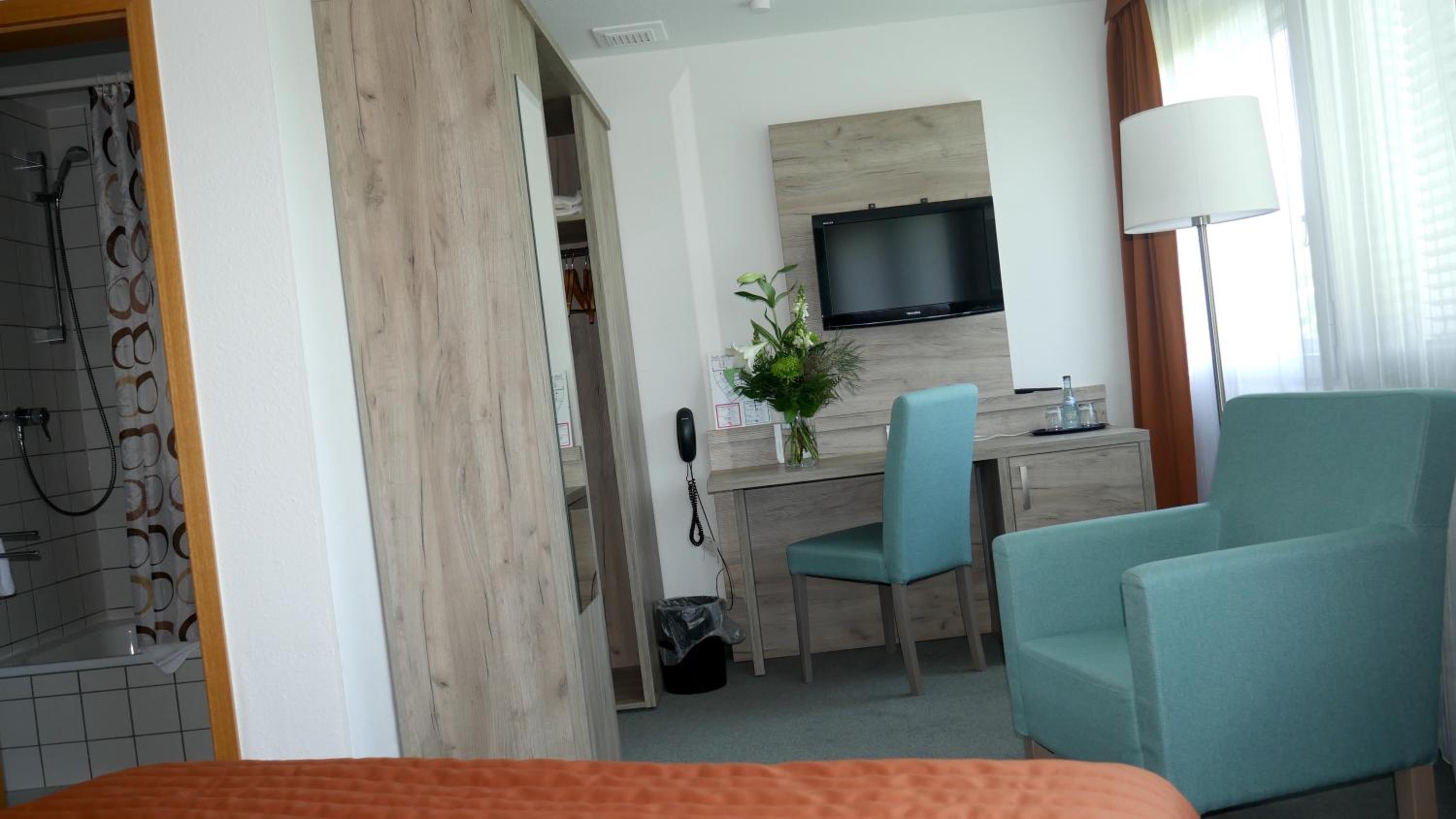 Indulge in the charm of our classically furnished rooms at Komfort Hotel Ludwigsburg, each equipped with satellite TV and a cozy en suite bathroom complete with complimentary toiletries and a hairdryer.