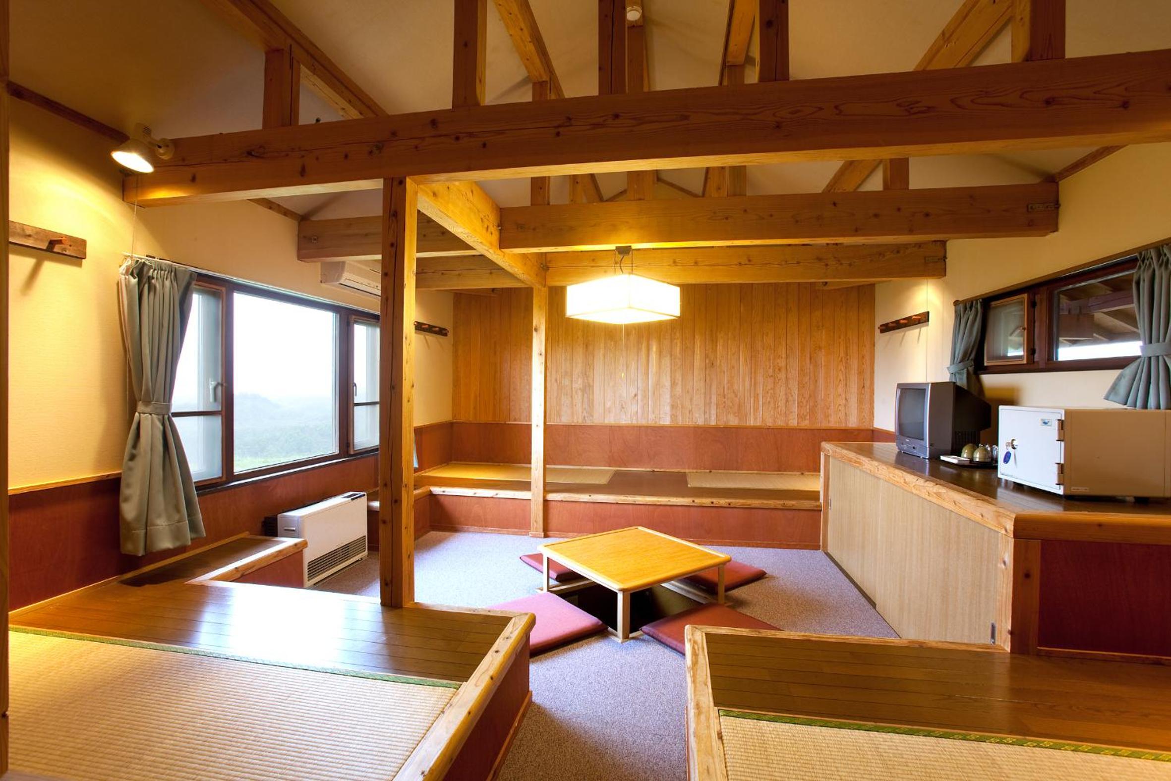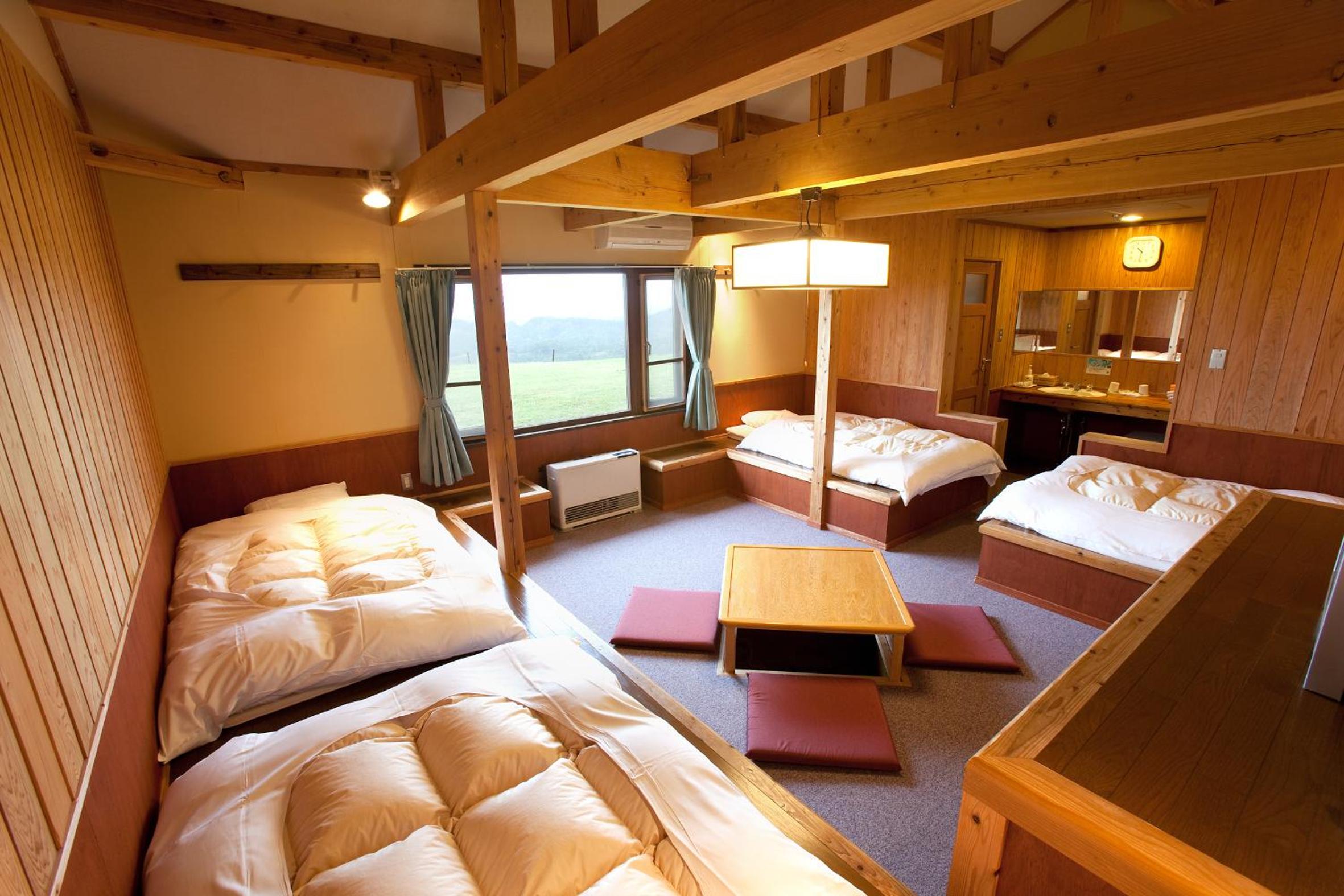 Choose between a Western-style room with tatami beds or a Japanese-style room with futon mats, each equipped with air conditioning and a seating area.