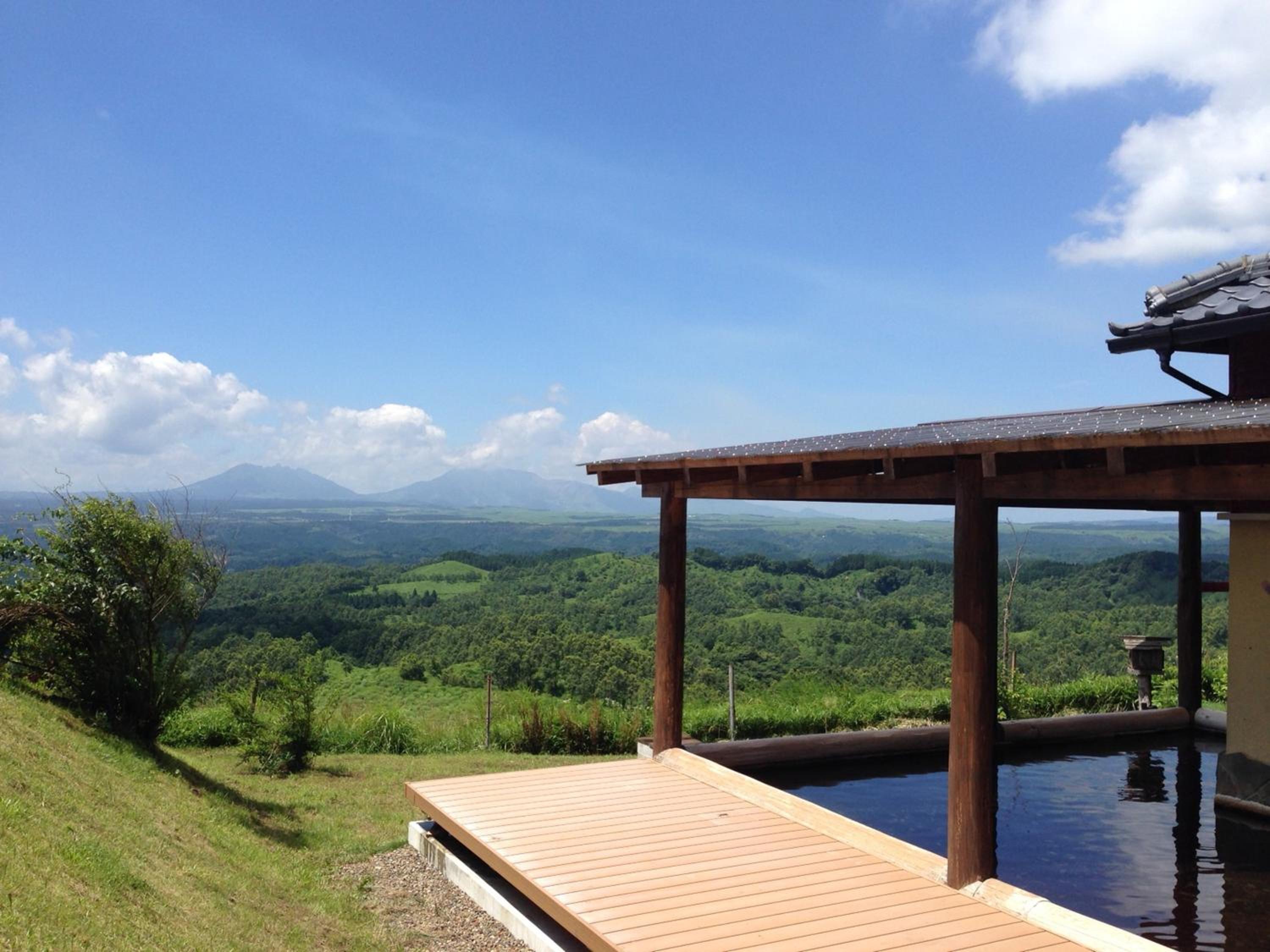 Experience the tranquil beauty of Kuju nature from our open-air hot spring bath at Kuju Kogen Cottage.