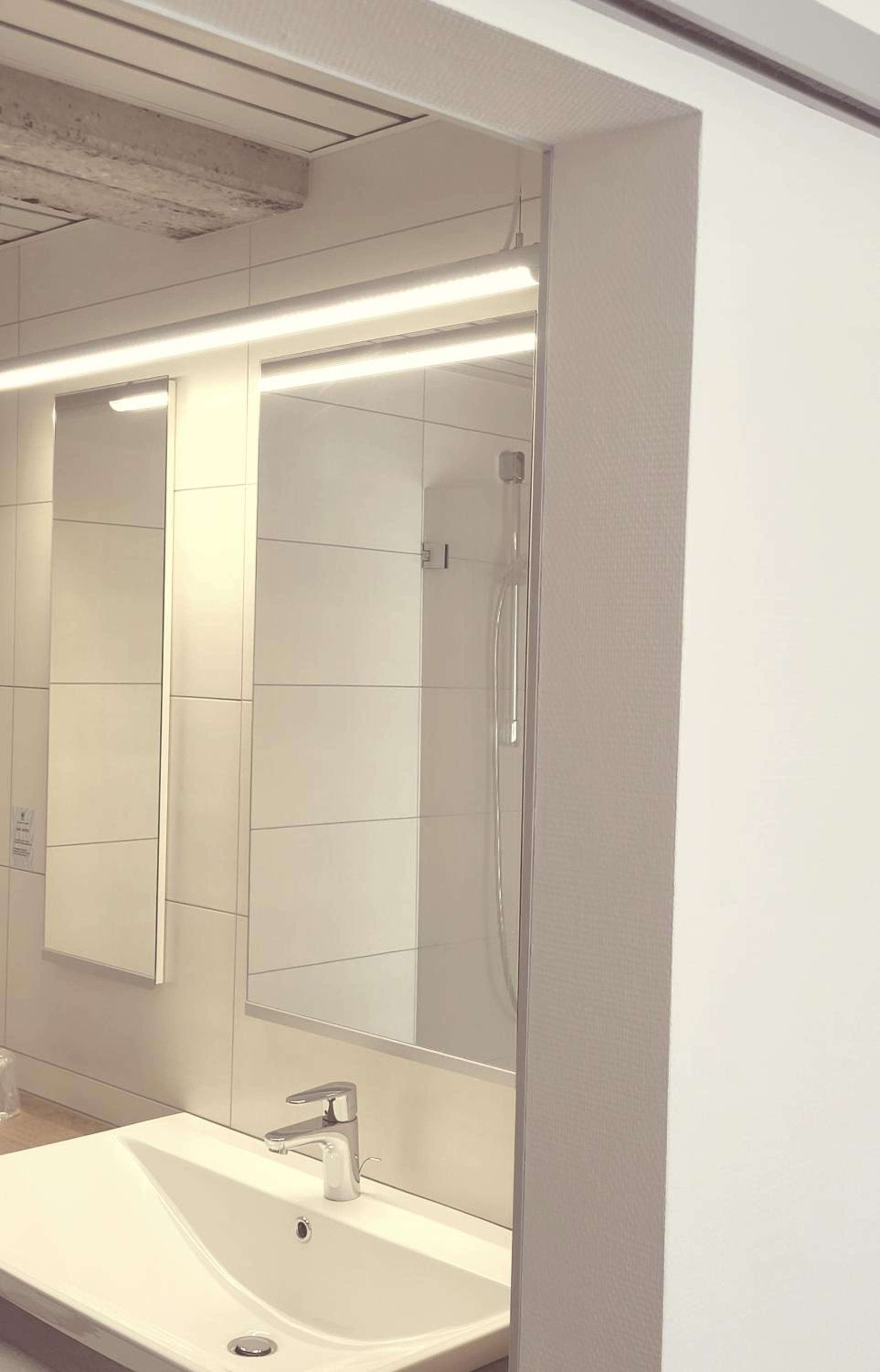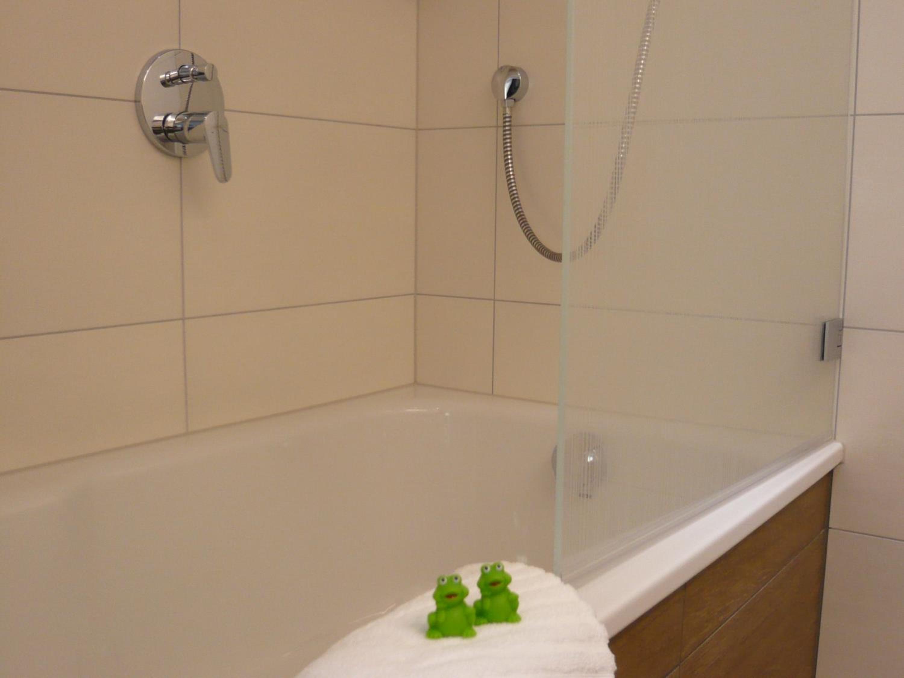 Leider gibt es bei der Dusche keinen Vorhang. Bisschen Wasser geht in den Raum rein.