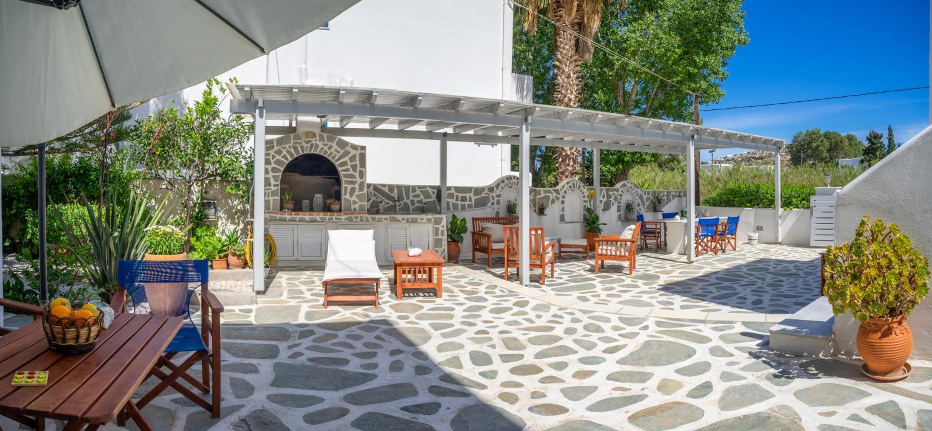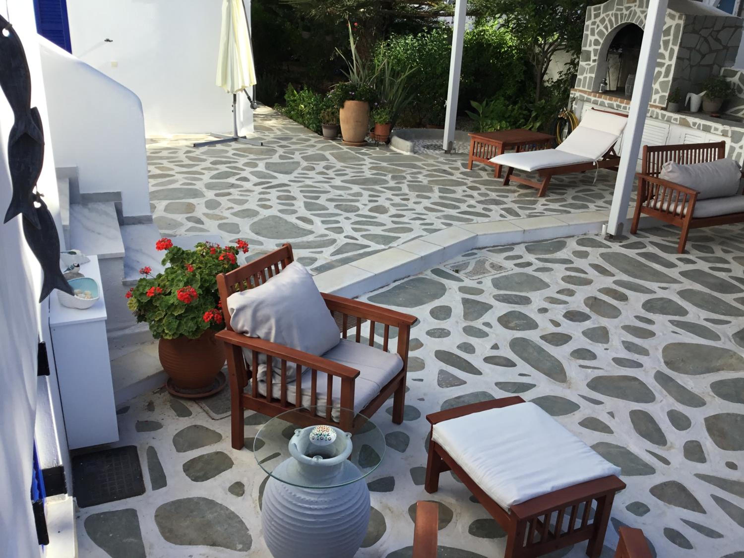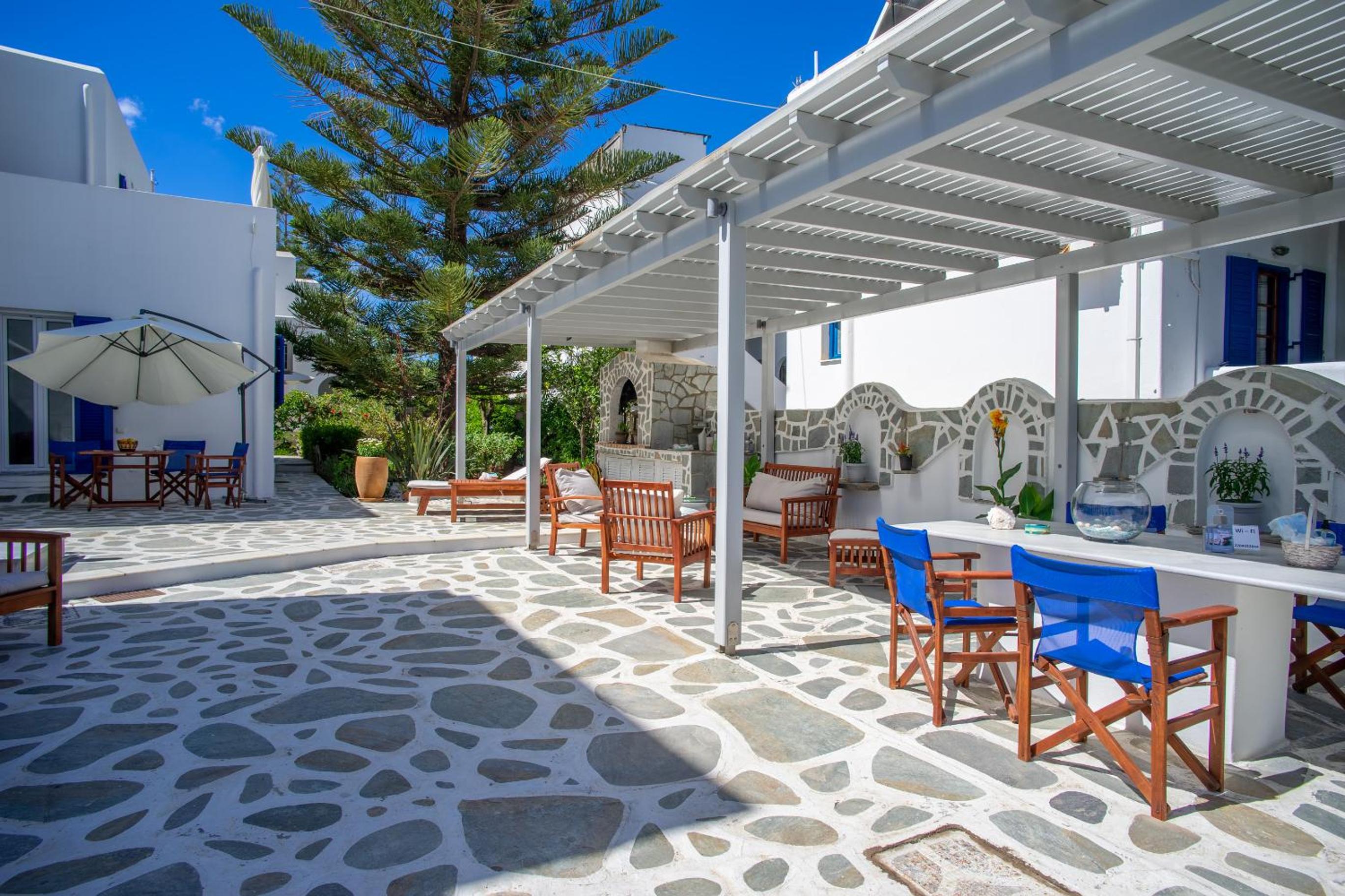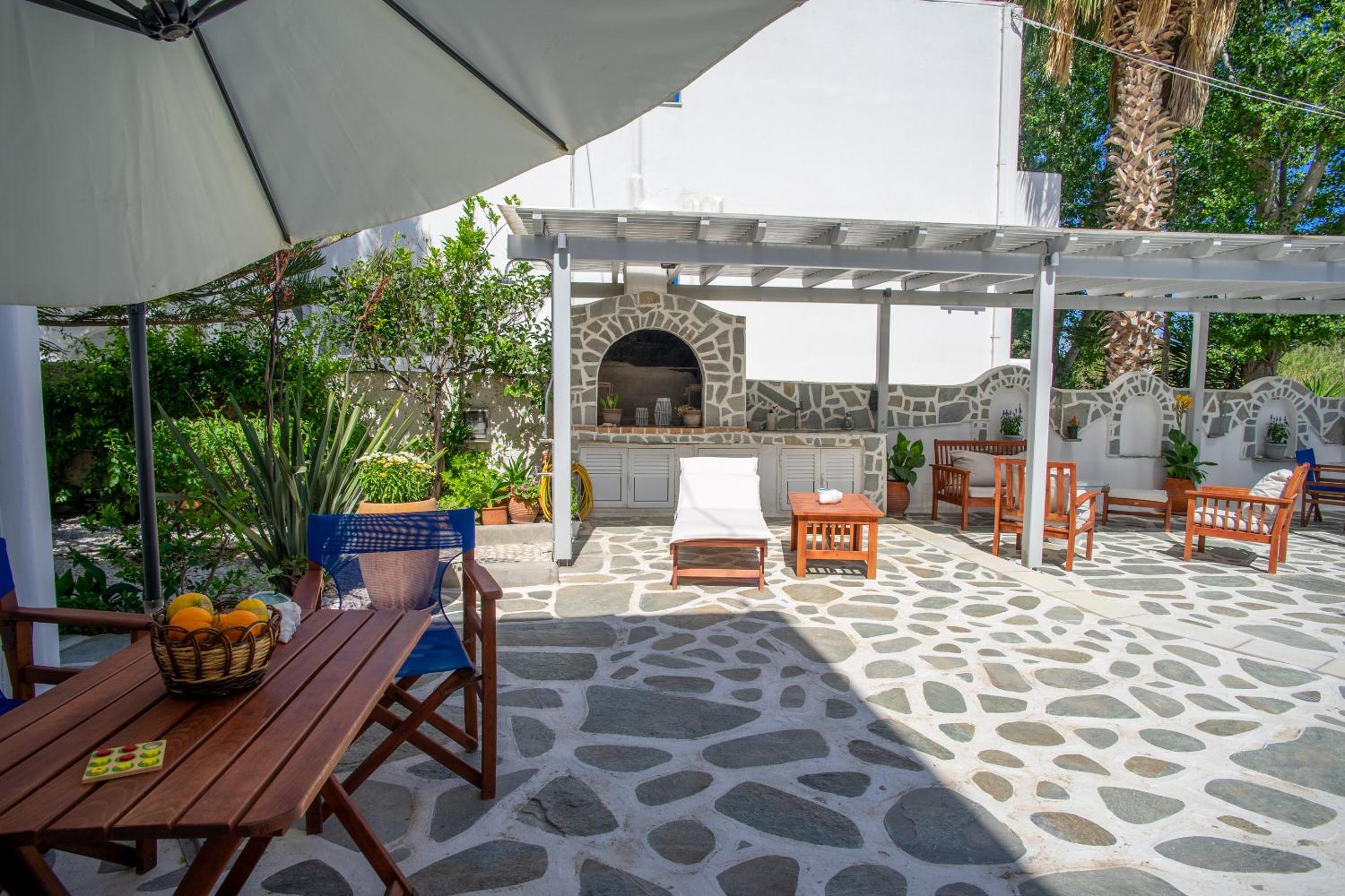 Relaxing Courtyard: The stone-paved courtyard with hammocks and BBQ facilities provides a tranquil space to unwind after a day of exploring Parikia.
