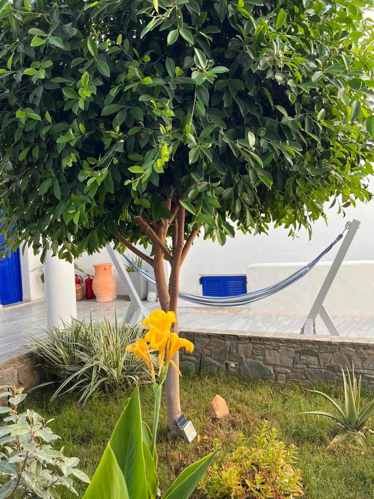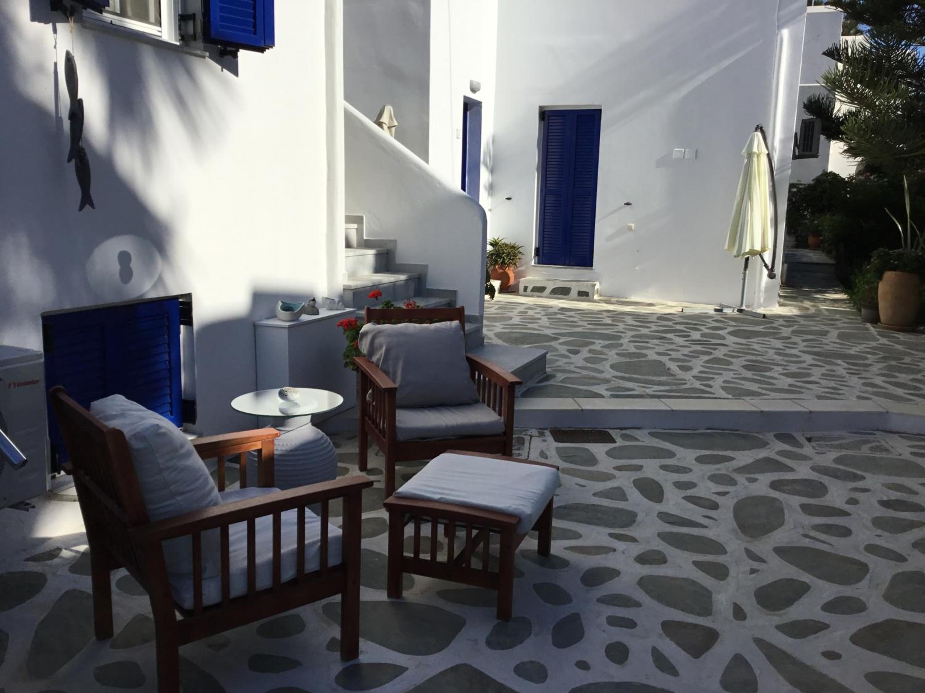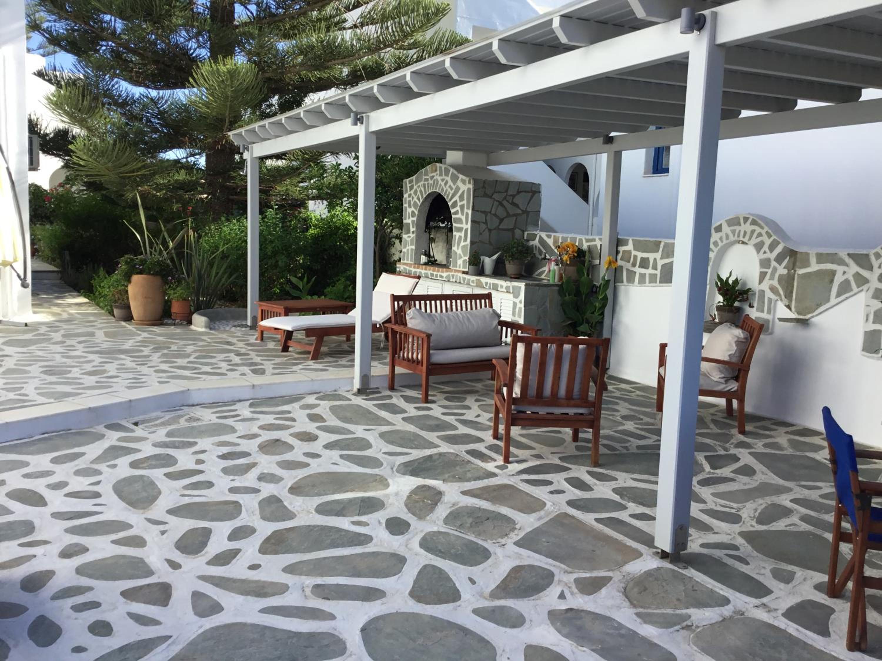 Relaxing Courtyard: The stone-paved courtyard with hammocks and BBQ facilities provides a tranquil space to unwind after a day of exploring Parikia.